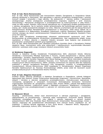 Prof. dr hab. Maria Romanowska Prof. dr hab. Maria Romanowska jest kierownikiem Katedry Zarządzania w Gospodarce Szkoły Głównej Handlowej w Warszawie. Jest specjalistą w zakresie zarządzania strategicznego i autorką licznych książek i artykułów z tego zakresu. Jej podręczniki z zakresu analizy i planowania strategicznego: Analiza strategiczna przedsiębiorstwa (napisana wspólnie z prof. Grażyną Gierszewską) i Planowanie strategiczne w przedsiębiorstwie są wykorzystywane w całej Polsce i miały po kilka wydań. Katedra, którą kieruje specjalizuje się w organizacji studiów podyplomowych z zakresu zarządzania. Są to zarówno studia opracowywane dla konkretnego partnera (szyte na miarę), jak i studia powszechnie dostępne na rynku. Obecnie uruchamiana jest 62 edycja Rocznych Podyplomowych Studiów Menedżerskich prowadzonych w Warszawie, wiele edycji odbyło się w innych miastach m.in. Białymstoku, Suwałkach, Katowicach, Lublinie i Rzeszowie. Katedra prowadzi również cieszące się dużym zainteresowaniem Podyplomowe Studia Zarządzania Zasobami Pracy (trwa XIX edycja). Drugim obok zarządzania strategicznego obszarem zainteresowań naukowych prof. Marii Romanowskiej są przekształcenia strukturalne przedsiębiorstw. Jest współautorką książki Grupy kapitałowe w Polsce, obecnie z zespołem Katedry prowadzi duże badania nad problemem powstawania i przekształceń polskich grup kapitałowych. Prof. dr hab. Maria Romanowska jest członkiem prezydium Komitetu Nauk o Zarządzaniu Polskiej Akademii Nauk, recenzentem wielu prac doktorskich i habilitacyjnych, wypromowała kilkunastu doktorów i poświęca wiele uwagi rozwojowi młodych pracowników nauki. dr Waldemar Rogowski Adiunkt w Katedrze Analizy Działalności Przedsiębiorstwa SGH, absolwent Szkoły Głównej Handlowej i Uniwersytetu Mikołaja Kopernika w Toruniu. (studia podyplomowe z zakresu prawa handlowego). Dyrektor Departamentów Ryzyka i Klientów Korporacyjnych wiodących instytucji finansowych, obecnie Dyrektor Departamentu Metod Ratingowych w Biurze Informacji Kredytowej SA. Autor licznych publikacji z dziedziny finansów, m.in. Rachunek efektywności przedsięwzięć inwestycyjnych Oficyna Ekonomiczna, 2004r. (książka nominowana do nagrody βeta dla najlepszej publikacji z zakresu zarządzania finansami) oraz Zarządzanie ryzykiem w przedsięwzięciach inwestycyjnych, Oficyna Ekonomiczna, 2005 (współautor A. Michalczewski). Ekspert Organizacji Narodów Zjednoczonych ds. Rozwoju Przemysłowego UNIDO, przez wiele lat recenzent wycen przedprywatyzacyjnych w Ministerstwie Skarbu Państwa. Prof. dr hab. Zbigniew Dworzecki Profesor Szkoły Głównej Handlowej w Katedrze Zarządzania w Gospodarce, członek Kolegium Najwyższej Izby Kontroli, Prezes Towarzystwa Naukowego Organizacji i Kierownictwa. Specjalista, ekspert i doradca w zakresie zarządzania przedsiębiorstwem, restrukturyzacji naprawczej i rozwojowej, zarządzania w sytuacjach kryzysowych. Doświadczenia biznesowe: kierowanie organizacjami (Prorektor ds. zarządzania i rozwoju SGH, Prezes TNOiK), członek Rad Nadzorczych spółek Skarbu Państwa i publicznych spółek z kapitałem prywatnym; Współpraca z Funduszami Inwestycyjnymi oraz przedsiębiorstwami w zakresie ich restrukturyzacji naprawczej i reorientacji strategicznej. Dr Sławomir Winch Socjolog - szkoleniowiec, doktor nauk ekonomicznych w zakresie organizacji i zarządzania, odpowiedzialny za przygotowanie i realizację zajęć treningowych. Pracownik Szkoły Głównej Handlowej, prowadzący od 1991 roku zajęcia z zakresu negocjacji w ramach studiów podyplomowych SGH oraz Wydziału Nauk Ekonomicznych Uniwersytetu Warszawskiego; trener z zakresu negocjacji dla przedstawicieli kilkudziesięciu firm różnych branż; współautor ok. 20 publikacji z zakresu technik negocjacji w tym: Anna Winch. i Sławomir Winch, Negocjacje – jednostka, organizacja, kultura, Difin, Warszawa 2005. Prof. dr hab. inż. Michał Trocki Absolwent Politechniki Warszawskiej, kierunku Organizacja i Zarządzanie Przemysłem. Zajmuje się problemami zarządzania działalnością gospodarczą, zarówno od strony naukowej jak też praktycznej. Związany z dwoma ośrodkami naukowymi: najpierw z Instytutem Organizacji Systemów Produkcyjnych Politechniki Warszawskiej, a obecnie z Kolegium Zarządzania i Finansów Szkoły Głównej Handlowej w Warszawie. Jest profesorem nauk ekonomicznych, doktorem habilitowanym w zakresie nauk o zarządzaniu, zatrudnionym na stanowisku profesora zwyczajnego w SGH, Kierownikiem Katedry Zarządzania Projektami SGH. Zainteresowania prof. Michała Trockiego koncentrują się wokół zagadnień zarządzania dużymi organizacjami gospodarczymi: wielkimi przedsiębiorstwami, grupami kapitałowymi, złożonymi przedsięwzięciami (projektami). W tej dziedzinie prowadzi działalność naukową, dydaktyczną, szkoleniową, konsultingową i doradczą. Między innymi brał udział w opracowywaniu projektów zarządzania dla: Rolimpexu, Stalexportu, Hortexu, Mostostalu Kraków, Rafinerii Gdańskiej, PŻM/Żeglugi Polskiej, PSE, PZU, Ciechu, Mostostalu – Warszawa, Telekomunikacji Polskiej, PZU SA i wielu innych. Jako Doradca Ministra Finansów brał udział w opracowywaniu projektu reformy Centrum Gospodarczego Rządu. Od 1995 roku do 1999 związany był z narodowymi funduszami inwestycyjnymi pełniąc funkcje Przewodniczącego i Zastępcy Przewodniczącego Rady Nadzorczej Drugiego NFI. Pracował również jako główny specjalista w Biurze Organizacji i Zarządzania Dyrekcji Spółki TP S.A. oraz w Biurze Rozwoju i Organizacji PZU S.A. Jest autorem ok. 150 publikacji z dziedziny organizacji i zarządzania działalnością gospodarczą w tym publikacji książkowych: Metody organizatorskie (współautor) 1986, Metody projektowania organizacji 1989, Reforma Centrum Gospodarczego Rządu. Przesłanki, cele, kierunki (współautor) 1995, Grupy kapitałowe w Polsce (współautor, współr