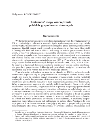 Małgorzata Rószkiewicz* Zmienność stopy oszczędzania polskich gospodarstw domowych Wprowadzenie Wydarzenia historyczne przełomu lat osiemdziesiątych i dziewięćdziesiątych XX w., zmieniające całkowicie warunki życia społeczno-gospodarczego, miały istotny wpływ na możliwości gromadzenia majątku przez polskie gospodarstwa domowe. Wyniki badań empirycznych prowadzonych w Instytucie Statystyki i Demografii SGH od końca 1998 r. wskazują, że wśród gospodarstw domowych, w których zabezpieczenie materialne utworzono przed 1989 r., średni wiek głowy gospodarstwa domowego w roku, w którym majątek ten utworzono był istotnie niższy, niż średni wiek głowy tych gospodarstw, które deklarowały utworzenie zabezpieczenia materialnego po 1989 r. Prawidłowość tę potwierdzają wyniki badań realizowanych kolejno w latach 1998, 2001, 2004 i 2006. W każdym z badanych lat rozbieżności te zmniejszały się na skutek odmłodzenia populacji gospodarstw deklarujących posiadanie majątku, prowadząc do zacierania się tych różnic pod koniec badanego okresu. Prawidłowość, polegająca na tym, że w okresie po 1989 r., zabezpieczenie materialne pojawiało się w gospodarstwach domowych średnio biorąc starszych niż miało to miejsce przed zmianami systemowymi, można wyjaśnić w dwojaki sposób. Po pierwsze, dokonane zmiany systemowe mogły stworzyć możliwość gromadzenia majątku w tych segmentach gospodarstw domowych, które w poprzednim systemie nie miałyby takiej możliwości. Stworzenie takiej możliwości spowodowało, że gospodarstwa te później rozpoczęły gromadzenie majątku. Ale także mogło nastąpić zjawisko polegające na odkładaniu decyzji o oszczędzaniu na rzecz bieżących potrzeb konsumpcyjnych. Zbyt niski poziom dochodów z pewnością uniemożliwia gromadzenie majątku, z kolei osiąganie relatywnie wyższych dochodów, mimo że stwarza możliwość oszczędzania, to jednak nie musi prowadzić do decyzji o oszczędzaniu, a problemy bezpieczeństwa materialnego mogą być odkładane na dalszy plan. Podstawę do tego typu postaw i zachowań stwarza rozwijający się wraz z gospodarką rynkową konsumpcyjny styl życia. Przedstawiona w artykule analiza zmienności stóp * Autorka jest pracownikiem Instytutu Statystyki i Demografii Kolegium Analiz Ekonomicznych w Szkole Głównej Handlowej w Warszawie. Artykuł wpłynął do redakcji w maju 2008 r. Zakres tych rozbieżności kształtował się między średnią wieku na poziomie 36,3 roku i 43,3 roku odnotowanych w 1998 r. (różnica największa) i 35 lat i 37,5 roku odnotowanych w 2006 r. (różnica najmniejsza). 64 GOSPODARKA NARODOWA Nr 7-8/2008 oszczędzania oraz postaw wobec oszczędzania wskazuje, że w polskich gospodarstwach domowych wystąpiły obie prawidłowości. Podstawy teoretyczne Rodowód współczesnych teorii oszczędzania sięga prac Kynesa (hipoteza dochodu absolutnego [Keynes, 1956]) oraz wywodzących się z nich modeli cyklu życia [Modigliani, Brunberg, 1954], [Friedman, 1957]. Teorie te za podstawę oszczędzania przyjmują stabilność wzorca konsumpcji (hipoteza dochodu permanentnego Friedmana) oraz nieprzewidywalną wahliwość dochodu bieżącego (hipoteza cyklu życia Modiglianiego i Brumberg). Zarówno hipoteza dochodu permanentnego Friedmana jak i hipoteza cyklu życia odrzucały keynesowskie założenie o braku proporcjonalności. W hipotezie dochodu permanentnego autor zakładał stabilność w czasie preferencji konsumpcyjnych (jednostka stara się realizować stały wzorzec konsumpcji w całym cyklu życia) oraz bilansowanie do zera odchyleń bieżącego dochodu od dochodu permanentnego, co oznaczało niezależność względem siebie obu tych wielkości. Przy tych założeniach Friedman dowodził niezależności poziomu konsumpcji, a tym samym niezależności poziomu oszczędności, od zmian bieżącego dochodu i prowadziło do stwierdzenia niezależności stopy oszczędzania względem dochodu. Hipoteza cyklu życia zakładała z kolei określoną chronologię zdarzeń, podporządkowaną prawidłowości rosnącego dochodu bieżącego wraz z upływem czasu aż do osiągnięcia wieku emerytalnego, a następnie jego spadek poniżej średniej życiowej. Hipoteza ta zakłada zatem, iż w okresie aktywności ekonomicznej, gdy istnieją ku temu podstawy, konieczne jest gromadzenie oszczędności, by spłacić kredyty i pożyczki zaciągane w okresie gdy, dochód kształtował się poniżej aspiracji konsumpcyjnych oraz by wesprzeć poziom konsumpcji w okresie emerytalnym, zagrożony naturalnym dla tego okresu życia spadkiem dochodów. W fazie emerytalnej cyklu życia model normatywny nie przewidywał oszczędzania. W klasycznym modelu cyklu życia, dla przejrzystości wywodu, przyjęto upraszczające założenia dotyczące braku dziedziczenia aktywów i niepozostawiania spadku, a ponadto założenie o zerowej stopy procentowej i całkowitej pewności zarówno co do poziomu osiąganego dochodu gospodarstwa domowego, jak i o długości trwania życia jednostki, a także założenia o możliwość swobodnego zaciągania pożyczek i ich spłacania w okresie późniejszym (tzw. założenie o doskonałych rynkach kapitałowych). Tworzyło to nierealny obraz procesu zarządzania dochodem jednostki w cyklu życia. Dlatego też modyfikacje modelu przebiegały głownie w zakresie uwalniania go od tych uproszczeń, co skutkowało niekiedy rozwiązaniami całkowicie odmiennymi względem modelu podstawowego. Powstałe na gruncie tej orientacji nowoczesne teorie oszczędzania uwzględniają takie modyfikacje klasycznego modelu jak hipoteza błądzenia losowego Halla [Hall, 1978], hipoteza o nadmiernej wrażliwości konsumpcji, gdy konsumpcja reaguje na przewidywalne zmiany dochodu [Flavin, 1981] oraz o nadmiernej gładkości konsumpcji, gdy konsumpcja z kolei reaguje na nie- Małgorzata Rószkiewicz, Zmienność stopy oszczędzania polskich gospodarstw domowych 65 przewidywaln