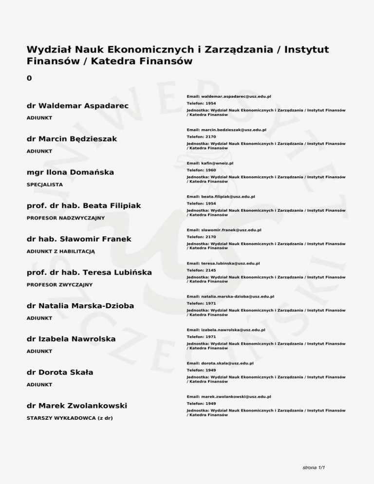 Wydział Nauk Ekonomicznych i Zarządzania / Instytut Finansów / Katedra Finansów 0 Email: [email protected] dr Waldemar Aspadarec ADIUNKT Telefon: 1954 Jednostka: Wydział Nauk Ekonomicznych i Zarządzania / Instytut Finansów / Katedra Finansów Email: [email protected] dr Marcin Będzieszak ADIUNKT Telefon: 2170 Jednostka: Wydział Nauk Ekonomicznych i Zarządzania / Instytut Finansów / Katedra Finansów Email: [email protected] mgr Ilona Domańska SPECJALISTA Telefon: 1960 Jednostka: Wydział Nauk Ekonomicznych i Zarządzania / Instytut Finansów / Katedra Finansów Email: [email protected] prof. dr hab. Beata Filipiak PROFESOR NADZWYCZAJNY Telefon: 1954 Jednostka: Wydział Nauk Ekonomicznych i Zarządzania / Instytut Finansów / Katedra Finansów Email: [email protected] dr hab. Sławomir Franek ADIUNKT Z HABILITACJĄ Telefon: 2170 Jednostka: Wydział Nauk Ekonomicznych i Zarządzania / Instytut Finansów / Katedra Finansów Email: [email protected] prof. dr hab. Teresa Lubińska PROFESOR ZWYCZAJNY Telefon: 2145 Jednostka: Wydział Nauk Ekonomicznych i Zarządzania / Instytut Finansów / Katedra Finansów Email: [email protected] dr Natalia Marska-Dzioba ADIUNKT Telefon: 1971 Jednostka: Wydział Nauk Ekonomicznych i Zarządzania / Instytut Finansów / Katedra Finansów Email: [email protected] dr Izabela Nawrolska ADIUNKT Telefon: 1971 Jednostka: Wydział Nauk Ekonomicznych i Zarządzania / Instytut Finansów / Katedra Finansów Email: [email protected] dr Dorota Skała ADIUNKT Telefon: 1949 Jednostka: Wydział Nauk Ekonomicznych i Zarządzania / Instytut Finansów / Katedra Finansów Email: [email protected] dr Marek Zwolankowski STARSZY WYKŁADOWCA (z dr) Telefon: 1949 Jednostka: Wydział Nauk Ekonomicznych i Zarządzania / Instytut Finansów / Katedra Finansów strona 1/1 Powered by TCPDF (www.tcpdf.org)