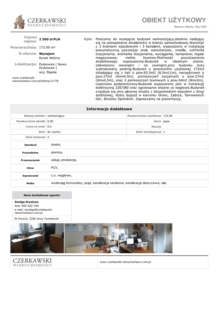 OBIEKT UŻYTKOWY Numer oferty: Ob/245 Czynsz 2 500 zł PLN najmu: Powierzchnia: 172.00 m² O ofercie: Wynajem Rynek Wtórny Lokalizacja: Pyskowice ( Nowe Pyskowice ) woj. Śląskie www.czerkawskinieruchomosci.com.pl/oferta/11778 Opis: Polecamy do wynajęcia budynek wolnostojący,idealnie nadający się na prowadzenie działalności w branży samochodowej.Warsztat z 3 bramami wjazdowymi i 3 kanałami, wyposażony w instalację pneumatyczną pozostaja stoły warsztatowe, imadła, szlifierka stacjonarna, wiertarka stacjonarna, wyciągarka, kompresor, regały magazynowe, meble biurowe.Możliwość pozostawienia dodatkowego wyposażenia.Budynek w idealnym stanie, odświeżony wewnątrz i na zewnątrz,przy budynku duży wybrukowany parking.Budynek o powierzchni użytkowej 172m2 skladający się z hali o pow.93,5m2 (8,5nx11m), narzędziowni o pow.27m2 (6mx4,5m), pomieszczeń socjalnych o pow.27m2 (6mx4,5m), oraz 3 pomieszczeń biurowych o pow.24m2 (8mx3m), częściowo podpiwniczony.Budynek wyposażony jest w instalację elektryczną 220/380 oraz ogrzewanie wlasne co węglowe.Budynek znajduje się przy głownej drodze z bezpośrednim wjazdem z drogi asfaltowej, dobry dojazd w kierunku Gliwic, Zabrza, Tarnowskich Gór, Strzelec Opolskich. Zapraszamy na prezentację. Informacje dodatkowe Rodzaj obiektu wolnostojący Powierzchnia użytkowa 172.00 Powierzchnia działki 0.00 Dach papa Cena za metr 0.0 Stan do użytku Kaucja Ilość kondygnacji 1 Ilość łazienek 2 Standard Przynależne Przeznaczenie Okna Ogrzewanie Media średni, piwnica, usługi, produkcja, PCV, c.o. węglowe, wodociąg komunalny, prąd, kanalizacja sanitarna, kanalizacja deszczowa, siła, Dane kontaktowe agenta: Szeliga Krystyna kom. 605-622-344 e-mail: [email protected] Nr licencji: 2185 Jerzy Czerkawski www.czerkawski-nieruchomosci.com.pl