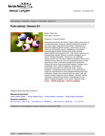 Utworzono : 04 marzec 2017 Foto-obrazy > Przyroda > Owoce > Foto-obraz: Owoce 01 Foto-obraz: Owoce 01 Model : Z042_001 Foto-obraz: Owoce 01 Producent : Fabryka Fantazji Wspaniałe foto-obrazy dla Ciebie! Nasze zdjęcia drukowane są na najwyższej klasy maszynie wielkoformatowej firmy Epson przy użyciu tylko oryginalnych atramentów. Rozwiązanie to zapewnia najlepszą jakość wydruku, gdzie kolory są żywe, a czerń jest rzeczywiście czarna. Dodatkowym czynnikiem podwyższającym jakość wydruku jest użycie wysokiej jakości płócien renomowanych firm. Foto-obrazy oprawiane są profesjonalną metodą. Wydruki na płótnie naciągane są na krosno metodą wrap galery. Oznacza to, że z każdego zdjęcia ucinane są 2 cm, które następnie zawijane są na krosno dookoła tworząc efekt 3D. Przy tym rozwiązaniu obraz nie jest oprawiany w ramę, ponieważ przestaje być to konieczne. Gotowy foto-obraz może przyozdobić wnętrze Twojego domu, mieszkania, biura, hotelu lub gabinetu. Może też być doskonałym prezentem dla ukochanej osoby, rodziny i przyjaciół. Przedstawiane foto-obrazy na życzenie Klienta mogą być wydrukowane w innej zaproponowanej przez niego kolorystyce. Mogą to być odcienie sepii lub czerni i bieli, jak również zmianie mogą ulec kolory zdjęcia. UWAGA: Istnieje możliwość wykonania foto-obrazu z nadesłanego do nas zdjęcia. Więcej szczegółów na ten temat znajdziesz tutaj. � Cena : 80,65 zł Brutto ( 65,57 zł Netto) Dostępne opcje Foto-obraz: Owoce 01 : Metoda prezentacji Wrap Gallery Białe, Wrap Gallery Kolor, Wrap Gallery Lustrzane, Wrap Gallery Standard. Rozmiar szablonu 50 x 70 cm (+ 136,11 zł), 42 x 60 cm (+ 105,86 zł), 29 x 42 cm (+ 30,25 zł), Dostępność: Produkt dostępny w naszym sklepie od 26 wrzesień 2008 kontakt : - [email protected] Strona 1 21 x 30 cm.