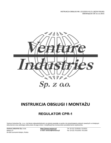 INSTRUKCJA OBSŁUGI NR. 22122015-PL/11 (JĘZYK POLSKI) OBOWIĄZUJE OD 22.12.2015 INSTRUKCJA OBSŁUGI I MONTAŻU REGULATOR CPR-1 Venture Industries Sp. z o.o. nie bierze odpowiedzialności za szkody powstałe w wyniku nie przestrzegania zaleceń zawartych w niniejszym dokumencie oraz zastrzega sobie prawo do jego zmian i modyfikacji bez konieczności powiadamiania użytkownika. Venture Industries Sp. z o.o. Mokra 27 05-092 Łomianki-Kiełpin, Polska http://www.venture.pl e-mail: [email protected] Tel. (0-22) 7519550; 7512031 Fax (0-22) 7512259; 7511202 Venture Industries Sp. z o.o. Mokra 27 05-092 Łomianki-Kiełpin Polska INSTRUKCJA OBSŁUGI I MONTAŻU CPR-1 Nr. 12B2014EC-PL/1 (JĘZYK POLSKI) SPECYFIKACJA TECHNICZNA Maksymalna moc i prąd silnika Zasilanie silnika (wyjście regulatora) Zasilanie regulatora Zakres dopuszczalnych nastaw 400 [W], 2 [A] 100 ÷ 230 [V], 50 [Hz], jednofazowe 230 [V], 50 [Hz], jednofazowe 35 ÷ 199 [Pa] (bez nastawy nocnej) 10 ÷ 50 [Pa] Zakres nastawy nocnej Dopuszczalna temperatura -25 ÷ 60 [°C] otoczenia Stopień ochrony IP 54 Styki przekaźnika alarmowego Bezpotencjałowe, max 8A, 250V Maksymalna średnica żyły 1,5 [mm²], max 2 żyły pod 1 zacisk przewodu elektrycznego Okres cyklu pracy regulatora 50 [ms] Montaż do płaskiej powierzchni, za pomocą 2 śrub Przepusty kablowe 3 dławice M12 x 1,5 Złącza wężyka ciśnienia* Wyprowadzone na zewnątrz obudowy Wewnętrzny bezpiecznik Topikowy, 5[A] *Złącza wężyka ciśnienia muszą zostać odpowiednio podłączone. Nie mogą zostać odkryte, a podłączone przewody nie mogą umożliwiać czynnikom zewnętrznym dostępu do urządzenia, gdyż spowoduje to utratę stopnia ochrony IP54. REGULATOR CPR-1 INFORMACJE OGÓLNE Regulator CPR-1 we współpracy z odpowiednio dobranym wentylatorem stabilizuje różnicę między ciśnieniem w kanale wentylacyjnym, a ciśnieniem odniesienia. Stabilizacja wykonywana jest poprzez płynne sterowanie prędkością obrotową wentylatora, na podstawie pomiaru ciśnienia realizowanego przez wbudowany czujnik oraz wartości ciśnienia zadanej przez użytkownika. Strona 2 Urządzenie może współpracować jedynie z wentylatorami o zasilaniu jednofazowym (230V, 50Hz) dostosowanymi do regulacji obrotów poprzez zmiany napięcia zasilania. Silniki wentylatorów muszą posiadać własną skuteczną ochronę przeciw przegrzaniu uzwojeń. Regulator przeznaczony jest do użytkowania przez dorosłe osoby, które zostały odpowiednio przeszkolone i posiadają odpowiednie kwalifikacje. tel. (0-22) 7519550; 7512031, fax (0-22) 7512259; 7511202, e-mail: [email protected] Venture Industries Sp. z o.o. Mokra 27 05-092 Łomianki-Kiełpin Polska WYTYCZNE MONTAŻU Prawidłowy montaż jest warunkiem prawidłowej pracy systemu wentylacji z regulatorem CPR-1. W razie jakichkolwiek wątpliwości odnośnie montażu regulatora i akcesoriów należy skontaktować się z Serwisem lub Działem Technicznym Venture Industries Sp. z o.o. Miejsce montażu Miejsce montażu należy dobrać tak, by nie narażać regulatora na bezpośredni wpływ warunków atmosferycznych. Zaleca się stosowanie dodatkowych osłon przed wiatrem i promieniowaniem słonecznym. W szczególności należy chronić przed wiatrem krócieć pomiarowy ciśnienia odniesienia ponieważ silne podmuchy mogą zakłócać odczyt ciśnienia i negatywnie wpływać na pracę regulatora. Rys. 1 Zalecenia montażowe CPR-1 - chronić przed wpływem wiatru i promieniowania UV Strona 3 INSTRUKCJA OBSŁUGI I MONTAŻU Nr. . 22122015-PL/12 (JĘZYK POLSKI) Sposób montażu W celu przymocowania obudowy regulatora do ściany lub innej konstrukcji do tego przeznaczonej, należy zdjąć pokrywkę urządzenia i przykręcić wkrętami obudowę wykorzystując przygotowane do tego 2 otwory montażowe znajdujące się w jej rogach (Rys. 2). Rys. 2 Otwory montażowe regulatora CPR-1 Przewody elektryczne należy podłączyć zgodnie z wytycznymi podłączenia elektrycznego. Wężyki pomiarowe ciśnienia należy zamontować tak, by: króciec pomiarowy ‘P1’ na regulatorze (bliższy frontu) umożliwiał pomiar ciśnienia odniesienia, jeśli ciśnienie odniesienia jest równocześnie ciśnieniem w otoczeniu regulatora można nie podłączać wężyka do króćca króciec pomiarowy ‘P2‘ na regulatorze (bliższy tylnej ścianki) tel. (0-22) 7519550; 7512031, fax (0-22) 7512259; 7511202, e-mail: [email protected] Venture Industries Sp. z o.o. Mokra 27 05-092 Łomianki-Kiełpin Polska umożliwiał pomiar wartości ciśnienia w kanale wentylacyjnym. Odwrotne podłączenie wężyka nie wpływa na pracę regulatora (pomiar różnicy ciśnienia). Rys. 3 Widok wyprowadzeń regulatora CPR-1 Wężyki pomiarowe należy prowadzić ze spadkiem od regulatora do sondy, tak by wszelkie zanieczyszczenia oraz skropliny nie osadzały się wewnątrz nich (Rys. 4). Rys. 4 Wytyczne prowadzenia wężyka pomiarowego i montażu sondy pomiarowej Strona 4 INSTRUKCJA OBSŁUGI I MONTAŻU Nr. . 22122015-PL/12 (JĘZYK POLSKI) Nieszczelność podłączenia, pęknięcie lub załamanie się wężyka uniemożliwia prawidłowy odczyt ciśnienia a tym samym i pracę regulatora. Zaleca się stosowanie peszli ochronnych do wężyków ciśnienia prowadzonych na zewnątrz budynku oraz wszędzie tam, gdzie istnieje ryzyko załamania się wężyka lub jego zagniecenia. Sondę pomiarową ciśnienia należy umieścić w kanale w odległości minimum 3D (3 średnic kanału) od wlotu do wentylatora i od tłumika bądź kolana itp. elementów instalacji mogących powodować nieprawidłowy odczyt ciśnienia. Sondę pomiarową należy zamocować prostopadle do ściany kanału wentylacyjnego na prostym fragmencie instalacji, używając 2 metalowych wkrętów (Rys. 5). Rys. 5 Montaż sondy pomiarowej w kanale tel. (0-22) 7519550; 7512031, fax (0-22) 7512259; 7511202, e-mail: [email protected] Venture Industries Sp. z o.o. Mokra 27 05-092 Łomianki-Kiełpin Polska PODŁĄCZENIE ELEKTRYCZNE I KONFIGURACJA REGUL