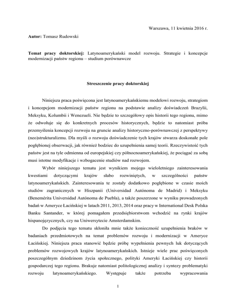 Warszawa, 11 kwietnia 2016 r. Autor: Tomasz Rudowski Temat pracy doktorskiej: Latynoamerykański model rozwoju. Strategie i koncepcje modernizacji państw regionu – studium porównawcze Streszczenie pracy doktorskiej Niniejsza praca poświęcona jest latynoamerykańskiemu modelowi rozwoju, strategiom i koncepcjom modernizacji państw regionu na podstawie analizy doświadczeń Brazylii, Meksyku, Kolumbii i Wenezueli. Nie będzie to szczegółowy opis historii tego regionu, mimo że odwołuje się do konkretnych procesów historycznych, będzie to natomiast próba przemyślenia koncepcji rozwoju na gruncie analizy historyczno-porównawczej z perspektywy (neo)strukturalizmu. Dla myśli o rozwoju doświadczenie tych krajów stwarza doskonałe pole pogłębionej obserwacji, jak również bodziec do uzupełnienia samej teorii. Rzeczywistość tych państw jest na tyle odmienna od europejskiej czy północnoamerykańskiej, że pociągać za sobą musi istotne modyfikacje i wzbogacenie studiów nad rozwojem. Wybór niniejszego tematu jest wynikiem mojego wieloletniego zainteresowania kwestiami dotyczącymi krajów słabo rozwiniętych, w szczególności państw latynoamerykańskich. Zainteresowania te zostały dodatkowo pogłębione w czasie moich studiów zagranicznych w Hiszpanii (Universidad Autónoma de Madrid) i Meksyku (Benemérita Universidad Autónoma de Puebla), a także poszerzone w wyniku prowadzonych badań w Ameryce Łacińskiej w latach 2011, 2013, 2014 oraz pracy w International Desk Polska Banku Santander, w której pomagałem przedsiębiorstwom wchodzić na rynki krajów hispanojęzycznych, czy na Uniwersytecie Amsterdamskim. Do podjęcia tego tematu skłoniła mnie także konieczność uzupełnienia braków w badaniach przedmiotowych na temat problemów rozwoju i modernizacji w Ameryce Łacińskiej. Niniejsza praca stanowić będzie próbę wypełnienia pewnych luk dotyczących problemów rozwojowych krajów latynoamerykańskich. Istnieje wiele prac poświęconych poszczególnym dziedzinom życia społecznego, polityki Ameryki Łacińskiej czy historii gospodarczej tego regionu. Brakuje natomiast politologicznej analizy i syntezy problematyki rozwoju latynoamerykańskiego. Występuje 1 także potrzeba wypracowania latynoamerykańskiego modelu rozwoju pomocnego w zrozumieniu dróg modernizacyjnych obieranych przez kraje tego regionu. Ponadto studia nad rozwojem stają się coraz bardziej popularnym obszarem badań w ramach stosunków międzynarodowych (zwłaszcza w takich państwach, jak: Kanada, Wielka Brytania oraz w regionie Ameryki Łacińskiej), o czym świadczą m.in. wyniki badań projektu Teaching, Research and International Policy1. Niniejsza praca mieści się w subdyscyplinie stosunków międzynarodowych. Przedmiot pracy: Przedmiotem pracy jest analiza problemu modernizacji i rozwoju w teorii i praktyce państw Ameryki Łacińskiej. Pojęcie rozwoju obecnie pretenduje do miana jednego z najczęściej używanych terminów w dyskursie publicznym, jednakże często jako slogan czy oznaka czegoś, co uznaje się za „pozytywne” i „dobre”. Problemy rozwoju znajdowały się w kręgu zainteresowania elit krajów peryferyjnych, w tym państw latynoamerykańskich, które często stawiały pytanie: jak dogonić Zachód? Świadomość zapóźnienia czy też fascynacja centrum, choć pojawiała się stopniowo to towarzyszyła ona krajom Ameryki Łacińskiej niemal od początku uzyskania przez nie niepodległości. Świadectwem tego mogą być m.in. prace Argentyńczyków: Juana Bautisty Alberdiego, Domingo Faustino Sarmiento, Carlosa Octavio Bunge czy też Boliwijczyka Alcidesa Arguedasa. Tłumaczy to chęć części intelektualistów i polityków latynoamerykańskich do zerwania z tradycją i naśladowania rozwiązań europejskich (postrzeganych jako postępowe). Obierali oni różne drogi ku wyczekiwanej nowoczesności. W Ameryce Łacińskiej rozwój należy rozumieć w mojej opinii jako ciągłe poszukiwanie właściwego projektu polityczno-społeczno-gospodarczego i jednoczesnego samostanowienia (samookreślenia) narodów w ramach integracji z kapitalistyczną gospodarką światową. Użyte przeze mnie w analizie, zaczerpnięte ze strukturalizmu, kategorie, takie jak m.in.: relacje centrum–peryferia, heterodoksja strukturalna są ważne dla zrozumienia i wyjaśnienia powtarzających się problemów w historii tego regionu jak chociażby koncentracja dochodu i brak endogenicznej bazy akumulacji kapitału. Praca odnosi się do całej Ameryki Łacińskiej, chociaż analiza opiera się głównie na przypadkach Brazylii, Kolumbii, Meksyku i Wenezueli. Model rozwoju jest pewnym typem procesu reprodukcji kapitału, określonym historycznie. W państwach latynoamerykańskich, podobnie jak w innych krajach peryferyjnych, modele rozwoju charakteryzują się dwoma podstawowymi cechami: heterodoksją strukturalną (połączenie nowoczesnych i zaawansowanych form produkcji z TRIP 2014 Faculty Survey Report, https://trip.wm.edu/reports/2014/rp_2014/ (dostęp 14.10.2015). Por. A. Wojciuk, J. Czaputowicz, K. Ławniczak, Nauka o stosunkach międzynarodowych i studia europejskie w Polsce, Scholar, Warszawa 2015, s. 84-85. 1 2 zacofanymi) i relacjami dominacji i zależności, które dają prymat krajom centrum w gospodarce światowej. Ponadto każdy model wprowadza specyfikę krajów czy regionu dotyczącą międzynarodowego podziału pracy, który determinuje ukształtowanie systemu produkcji i definiuje w podobny sposób specyficzny typ struktury społecznej i tzw. bloku władzy (sojusz klas społecznych lub ich części), który dominuje i pełni władzę polityczną2. Historię gospodarczą Ameryki Łacińskiej można podsumować jako długą walkę podejmowaną przez różne klasy i grupy społeczne, które integrowały społeczeństwa w każdej fazie jego rozwoju przez konstruowanie projektu samostanowienia narodowego w ramach kapitalistycznej gospodarki światowej oraz który 