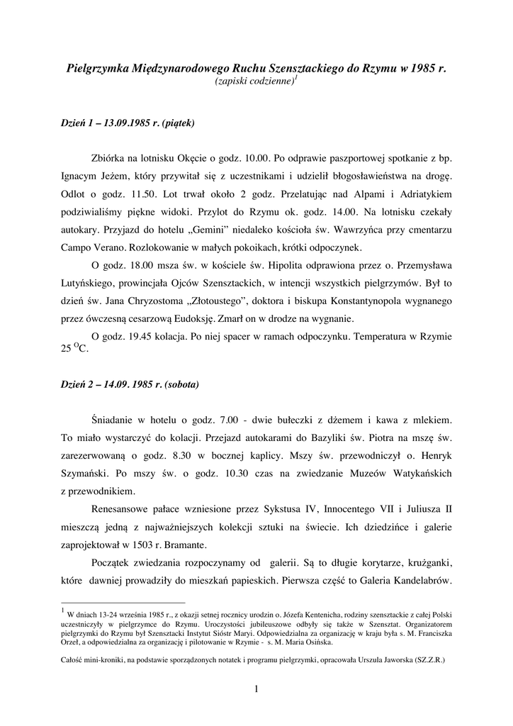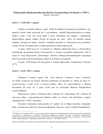 Pielgrzymka Międzynarodowego Ruchu Szensztackiego do Rzymu w 1985 r. (zapiski codzienne)1 Dzień 1 – 13.09.1985 r. (piątek) Zbiórka na lotnisku Okęcie o godz. 10.00. Po odprawie paszportowej spotkanie z bp. Ignacym Jeżem, który przywitał się z uczestnikami i udzielił błogosławieństwa na drogę. Odlot o godz. 11.50. Lot trwał około 2 godz. Przelatując nad Alpami i Adriatykiem podziwialiśmy piękne widoki. Przylot do Rzymu ok. godz. 14.00. Na lotnisku czekały autokary. Przyjazd do hotelu „Gemini” niedaleko kościoła św. Wawrzyńca przy cmentarzu Campo Verano. Rozlokowanie w małych pokoikach, krótki odpoczynek. O godz. 18.00 msza św. w kościele św. Hipolita odprawiona przez o. Przemysława Lutyńskiego, prowincjała Ojców Szensztackich, w intencji wszystkich pielgrzymów. Był to dzień św. Jana Chryzostoma „Złotoustego”, doktora i biskupa Konstantynopola wygnanego przez ówczesną cesarzową Eudoksję. Zmarł on w drodze na wygnanie. O O godz. 19.45 kolacja. Po niej spacer w ramach odpoczynku. Temperatura w Rzymie 25 C. Dzień 2 – 14.09. 1985 r. (sobota) Śniadanie w hotelu o godz. 7.00 - dwie bułeczki z dżemem i kawa z mlekiem. To miało wystarczyć do kolacji. Przejazd autokarami do Bazyliki św. Piotra na mszę św. zarezerwowaną o godz. 8.30 w bocznej kaplicy. Mszy św. przewodniczył o. Henryk Szymański. Po mszy św. o godz. 10.30 czas na zwiedzanie Muzeów Watykańskich z przewodnikiem. Renesansowe pałace wzniesione przez Sykstusa IV, Innocentego VII i Juliusza II mieszczą jedną z najważniejszych kolekcji sztuki na świecie. Ich dziedzińce i galerie zaprojektował w 1503 r. Bramante. Początek zwiedzania rozpoczynamy od galerii. Są to długie korytarze, krużganki, które dawniej prowadziły do mieszkań papieskich. Pierwsza część to Galeria Kandelabrów. 1 W dniach 13-24 września 1985 r., z okazji setnej rocznicy urodzin o. Józefa Kentenicha, rodziny szensztackie z całej Polski uczestniczyły w pielgrzymce do Rzymu. Uroczystości jubileuszowe odbyły się także w Szensztat. Organizatorem pielgrzymki do Rzymu był Szensztacki Instytut Sióstr Maryi. Odpowiedzialna za organizację w kraju była s. M. Franciszka Orzeł, a odpowiedzialna za organizację i pilotowanie w Rzymie - s. M. Maria Osińska. Całość mini-kroniki, na podstawie sporządzonych notatek i programu pielgrzymki, opracowała Urszula Jaworska (SZ.Z.R.) 1 Na jej sklepieniu widać fresk wykonany przez Ludwika Seitza w 1886 r., który przedstawia akt darowania papieżowi Leonowi XIII przez Polaków, w 200-letnią rocznicę bitwy pod Wiedniem, obrazu Jana Matejki pt. „Sobieski pod Wiedniem”. Dalszy ciąg korytarzy to Galeria Arrasów. Wiszą tu tkaniny brukselskie wykonane już po śmierci Rafaela i tkaniny rzymskie z pracowni Barberinich z XVII w. Przez okna widzieliśmy Ogrody Watykańskie. Dalej jest Galeria Map, gdzie na ścianach namalowane są różne części Italii. Przechodząc przez Salę Sobieskiego zatrzymaliśmy się przy obrazie Jana Matejki przedstawiającym króla Jana III Sobieskiego pod Wiedniem, po zwycięskiej bitwie nad Turkami w 1683 r., który malarz podarował papieżowi Leonowi XIII w 1883 roku. Minęliśmy Salę Niepokalanej, weszliśmy do Sali Rafaela składającej się z czterech pomieszczeń ozdobionych freskami przez młodego Rafaela, wykonane dla papieża Juliusza II. Ostatnie z nich, największe pomieszczenie, to Sala Konstantyna, w której odbywały się przyjęcia. Freski w tej Sali wykonali inni malarze wg szkiców Rafaela, po jego śmierci. Na koniec dotarliśmy do znanej z obrad konklawe Kaplicy Sykstyńskiej. Jej nazwa pochodzi od imienia fundatora – papieża Sykstusa IV. To na jego zlecenie w 1457 r. najwięksi ówcześni artyści rozpoczęli pracę nad kaplicą. Freski na ścianach przedstawiają sceny z życia Mojżesza i Chrystusa. Freski na sklepieniu, dzieła Michała Anioła, ukazują historię stworzenia świata. W kaplicy znajduje się również fresk jego autorstwa pt. „Sąd Ostateczny”. O godz. 13.00 udaliśmy się do ośrodka dla pielgrzymów polskich „Corda-Cordi” na herbatę i odpoczynek. O godz. 15.00 zwiedzanie Bazyliki Św. Piotra i podziemi bazyliki czyli Grot Watykańskich, w których znajdują się grobowce papieży oraz kaplica Matki Bożej Częstochowskiej. Bazylika jest drugą na świecie co do rozmiarów świątynią chrześcijańską. Ma 187 m długości, mieści 11 kaplic, 45 ołtarzy i niezliczone dzieła sztuki. Najwspanialsza rzeźba Michała Anioła „Pieta” znajduje się w bocznej kaplicy. O godz. 18.00 powrót autokarami do hotelu i upragniona kolacja o godz. 19.00. Dzień 3 – 15. 09. 1985 r.(niedziela) O godz. 7.30 śniadanie w hotelu (znowu 2 bułeczki i kawa). Zbiórka o godz. 9.30 i odjazd autokarami do Bazyliki św. Pawła za Murami. Przed wejściem do bazyliki w środku kolumnady podziwialiśmy duży posąg św. Pawła z mieczem. Miecz jest symbolem słowa Bożego, które głosił Apostoł oraz symbolem jego męczeństwa. Weszliśmy do wnętrza świątyni, spoglądając po prawej stronie na Świętą Bramę. Znajduje się tu pięć naw podzielonych rzędami kolumn, których jest 80. Długość bazyliki wynosi 131 m. a szerokość 2 65 m. Przez alabastrowe okna wpada do środka światło. Pod głównym ołtarzem mieści się grób św. Pawła Apostoła. Wysoko, na ścianach nawy głównej, można zobaczyć fryz składający się z portretów papieży, począwszy od św. Piotra do Jana Pawła II. W drodze powrotnej do autokaru zobaczyliśmy Bramę św. Pawła. Przez nią w 67 r. miał być prowadzony Apostoł do miejsca swojej męczeńskiej śmierci. Jadąc autokarem minęliśmy piramidę z I wieku wzniesioną jako grobowiec, dalej Circus Maximus, gdzie dawniej urządzano wyścigi kwadryg oraz Palatyn. Następnie pojechaliśmy do Bazyliki Matki Boskiej Większej (Śnieżnej) Santa Maria Maggiore, gdzie w ołtarzu głównym znajdują się relikwie żłóbka Pana Jezusa. Zatrzym