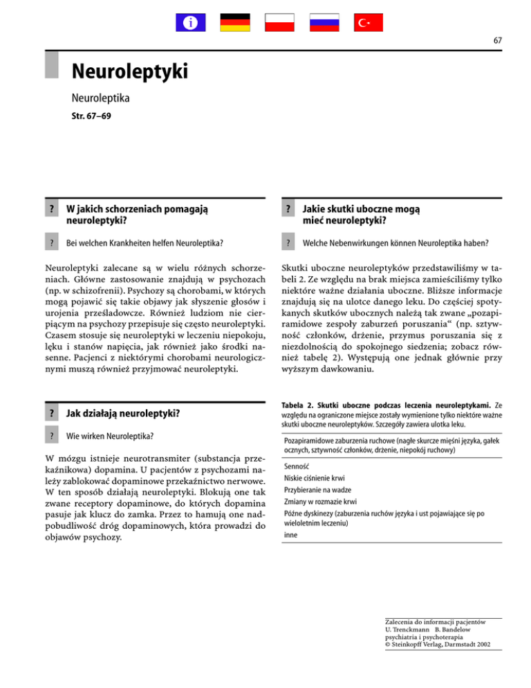 67 Neuroleptyki Neuroleptika Str. 67–69 ? W jakich schorzeniach pomagają neuroleptyki? ? Jakie skutki uboczne mogą mieć neuroleptyki? ? Bei welchen Krankheiten helfen Neuroleptika? ? Welche Nebenwirkungen können Neuroleptika haben? Neuroleptyki zalecane są w wielu różnych schorzeniach. Główne zastosowanie znajdują w psychozach (np. w schizofrenii). Psychozy są chorobami, w których mogą pojawić się takie objawy jak słyszenie głosów i urojenia prześladowcze. Również ludziom nie cierpiącym na psychozy przepisuje się często neuroleptyki. Czasem stosuje się neuroleptyki w leczeniu niepokoju, lęku i stanów napięcia, jak również jako środki nasenne. Pacjenci z niektórymi chorobami neurologicznymi muszą również przyjmować neuroleptyki. ? Jak działają neuroleptyki? ? Wie wirken Neuroleptika? W mózgu istnieje neurotransmiter (substancja przekaźnikowa) dopamina. U pacjentów z psychozami należy zablokować dopaminowe przekaźnictwo nerwowe. W ten sposób działają neuroleptyki. Blokują one tak zwane receptory dopaminowe, do których dopamina pasuje jak klucz do zamka. Przez to hamują one nadpobudliwość dróg dopaminowych, która prowadzi do objawów psychozy. Skutki uboczne neuroleptyków przedstawiliśmy w tabeli 2. Ze względu na brak miejsca zamieściliśmy tylko niektóre ważne działania uboczne. Bliższe informacje znajdują się na ulotce danego leku. Do częściej spotykanych skutków ubocznych należą tak zwane „pozapiramidowe zespoły zaburzeń poruszania“ (np. sztywność członków, drżenie, przymus poruszania się z niezdolnością do spokojnego siedzenia; zobacz również tabelę 2). Występują one jednak głównie przy wyższym dawkowaniu. Tabela 2. Skutki uboczne podczas leczenia neuroleptykami. Ze względu na ograniczone miejsce zostały wymienione tylko niektóre ważne skutki uboczne neuroleptyków. Szczegóły zawiera ulotka leku. Pozapiramidowe zaburzenia ruchowe (nagłe skurcze mięśni języka, gałek ocznych, sztywność członków, drżenie, niepokój ruchowy) Senność Niskie ciśnienie krwi Przybieranie na wadze Zmiany w rozmazie krwi Późne dyskinezy (zaburzenia ruchów języka i ust pojawiające się po wieloletnim leczeniu) inne Zalecenia do informacji pacjentów U. Trenckmann B. Bandelow psychiatria i psychoterapia © Steinkopff Verlag, Darmstadt 2002 68 Neuroleptyki ? Jakie rodzaje neuroleptyków wyróżniamy? ? Welche Arten von Neuroleptika gibt es? Po pierwsze wyróżniamy neuroleptyki działające silnie i słabo przeciwpsychotycznie. Do leczenia psychoz stosuje sie najczęściej neuroleptyki o silnym działaniu przeciwpsychotycznym. W ich przypadku tzw. pozapiramidowe zaburzenia ruchowe występują częściej niż przy neuroleptykach o słabym działaniu przeciwpsychotycznym, głównie jednak przy stosowaniu wyższych dawek. Jeżeli neuroleptyki te stosowane są do leczenia niepokoju, lęku lub stanów pobudzenia podaje się najczęściej tak niskie dawki, że zaburzenia pozapiramidowe nie odgrywają żadnej roli. W przypadku neuroleptyków o słabym działaniu przeciwpsychotycznym zaburzenia te występują w ogóle bardzo rzadko. Działanie tych leków nie wystarcza jednak aby stosować je w leczeniu psychoz. Zażywa się ich najczęściej na uspokojenie. W ostatnich latach rozwinięto wiele nowych neuroleptyków, które nazywane są neuroleptykami „nietypowymi“. Ich wspólną cechą jest, że w porównaniu z typowymi neuroleptykami rzadziej wywołują pozapiramidowe zaburzenia ruchowe. Czasami pomagają one w przypadkach, w których typowe neuroleptyki były bezskuteczne. Również w przypadkach tzw. „symptomów ujemnych“ (zmniejszenie napędu) w schizofrenii mają one czasem pozytywne działanie. W zakresie nowoczesnych leków neuroleptycznych do leczenia schizofrenii dokonuje się ciągły postęp. W ostatnim czasie rozwinięty neuroleptyk Qetiapin nie wykazuje niektórych działań ubocznych wcześniej rozwiniętych nietypowych leków, jak np. częstego występowania zaburzeń ruchowych przy wyższym dawkowaniu lub znacznego przybierania na wadze. Wykazuje on również pozytywne działanie poza ścisłym polem schizofrenii np. w leczeniu niektórych schorzeń psychicznych wieku podeszłego, w bardzo ciężkich natręctwach lub w niektórych formach zaburzeń osobowości. Zalecenia do informacji pacjentów U. Trenckmann B. Bandelow psychiatria i psychoterapia © Steinkopff Verlag, Darmstadt 2002 ? Co to są neuroleptyki depot (o przedłużonym działaniu)? ? Was sind Depot-Neuroleptika? Neuroleptyk depot jest lekiem o przedłużonym działaniu, wstrzykiwanym domięśniowo. W zależności od leku działanie utrzymuje się od dwóch dni do czterech tygodni. Zaletą jest, że nie trzeba raz lub kilka razy dziennie pamiętać o zażywaniu leku. Członek rodziny odmawia zażywania swego neuroleptyku . . . Mein Angehöriger verweigert die Einnahme seines Neuroleptikums... Ludzie cierpiący na ciężkie psychozy muszą często przyjmować wyższe dawki neuroleptyków, aby objawy w rodzaju urojeń prześladowczych, słyszenia głosów i inne ustąpiły. Wtedy jednak może w czasie terapii dojść do wystąpienia niektórych objawów ubocznych (zobacz tabelę 2). Niektórzy pacjenci pragną z powodu skutków ubocznych odstawić lek w nadziei, że ich objawy ustąpią bez leczenia. Przed odstawieniem leku należy zawsze zapytać lekarza. Jeżeli neuroleptyk zostanie odstawiony, w czasie gdy jeszcze występują objawy psychozy, może się zdarzyć, że objawy te spowodują znaczne cierpienie. Do symptomów psychozy należą też zamiary samobójcze i agresywność w stosunku do innych. Z tego względu skutki zbyt wczesnego odstawienia leku mogą okazać się fatalne. Nierzadko zdarza się, że pacjenci z psychozą nie wierzą, że są chorzy. Dlatego też nie uważają zażywania leków za konieczne. Przekonanie pacjenta w takim wypadku wymaga czasem wiele cierpliwości. Ważne jest aby rodzina i lekarz tr