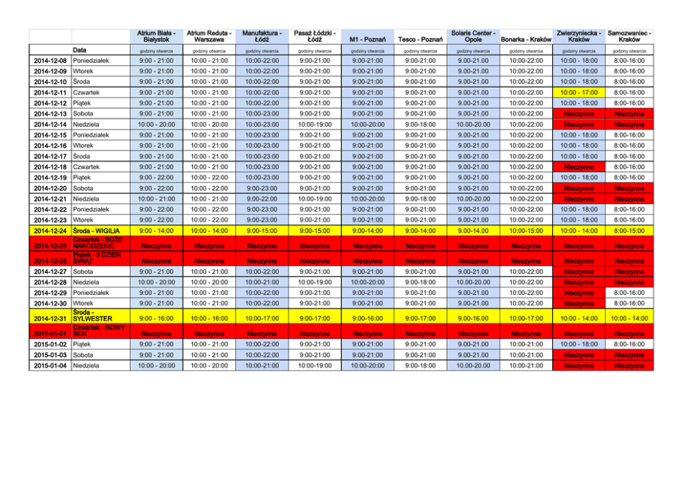 Atrium Biała Białystok Atrium Reduta Warszawa Manufaktura Łódź Pasaż Łódzki Łódź M1 - Poznań Tesco - Poznań Solaris Center Zwierzyniecka Opole Bonarka - Kraków Kraków Samozwaniec Kraków Data godziny otwarcia godziny otwarcia godziny otwarcia godziny otwarcia godziny otwarcia godziny otwarcia godziny otwarcia godziny otwarcia godziny otwarcia godziny otwarcia 2014-12-08 Poniedziałek 9:00 - 21:00 10:00 - 21:00 10:00-22:00 9:00-21:00 9:00-21:00 9:00-21:00 9.00-21.00 10:00-22:00 10:00 - 18:00 8:00-16:00 2014-12-09 Wtorek 9:00 - 21:00 10:00 - 21:00 10:00-22:00 9:00-21:00 9:00-21:00 9:00-21:00 9.00-21.00 10:00-22:00 10:00 - 18:00 8:00-16:00 2014-12-10 Środa 9:00 - 21:00 10:00 - 21:00 10:00-22:00 9:00-21:00 9:00-21:00 9:00-21:00 9.00-21.00 10:00-22:00 10:00 - 18:00 8:00-16:00 2014-12-11 Czwartek 9:00 - 21:00 10:00 - 21:00 10:00-22:00 9:00-21:00 9:00-21:00 9:00-21:00 9.00-21.00 10:00-22:00 10:00 - 17:00 8:00-16:00 2014-12-12 Piątek 9:00 - 21:00 10:00 - 21:00 10:00-22:00 9:00-21:00 9:00-21:00 9:00-21:00 9.00-21.00 10:00-22:00 10:00 - 18:00 8:00-16:00 2014-12-13 Sobota 9:00 - 21:00 10:00 - 21:00 10:00-23:00 9:00-21:00 9:00-21:00 9:00-21:00 9.00-21.00 10:00-22:00 Nieczynne Nieczynne 2014-12-14 Niedziela 10:00 - 20:00 10:00 - 20:00 10:00-23:00 10:00-19:00 10:00-20:00 9:00-18:00 10.00-20.00 10:00-22:00 Nieczynne Nieczynne 2014-12-15 Poniedziałek 9:00 - 21:00 10:00 - 21:00 10:00-23:00 9:00-21:00 9:00-21:00 9:00-21:00 9.00-21.00 10:00-22:00 10:00 - 18:00 8:00-16:00 2014-12-16 Wtorek 9:00 - 21:00 10:00 - 21:00 10:00-23:00 9:00-21:00 9:00-21:00 9:00-21:00 9.00-21.00 10:00-22:00 10:00 - 18:00 8:00-16:00 2014-12-17 Środa 9:00 - 21:00 10:00 - 21:00 10:00-23:00 9:00-21:00 9:00-21:00 9:00-21:00 9.00-21.00 10:00-22:00 10:00 - 18:00 8:00-16:00 2014-12-18 Czwartek 9:00 - 21:00 10:00 - 21:00 10:00-23:00 9:00-21:00 9:00-21:00 9:00-21:00 9.00-21.00 10:00-22:00 Nieczynne 8:00-16:00 2014-12-19 Piątek 9:00 - 22:00 10:00 - 22:00 10:00-23:00 9:00-21:00 9:00-21:00 9:00-21:00 9.00-21.00 10:00-22:00 10:00 - 18:00 8:00-16:00 2014-12-20 Sobota 9:00 - 22:00 10:00 - 22:00 9:00-23:00 9:00-21:00 9:00-21:00 9:00-21:00 9.00-21.00 10:00-22:00 Nieczynne Nieczynne 2014-12-21 Niedziela 10:00 - 21:00 10:00 - 21:00 9:00-22:00 10:00-19:00 10:00-20:00 9:00-18:00 10.00-20.00 10:00-22:00 Nieczynne Nieczynne 2014-12-22 Poniedziałek 9:00 - 22:00 10:00 - 22:00 9:00-23:00 9:00-21:00 9:00-21:00 9:00-21:00 9.00-21.00 10:00-22:00 10:00 - 18:00 8:00-16:00 2014-12-23 Wtorek 9:00 - 22:00 10:00 - 22:00 9:00-23:00 9:00-21:00 9:00-21:00 9:00-21:00 9.00-21.00 10:00-22:00 10:00 - 18:00 8:00-16:00 2014-12-24 9:00 - 14:00 10:00 - 14:00 9:00-15:00 9:00-15:00 9:00-14:00 9:00-14:00 9.00-14.00 10:00-15:00 10:00 - 14:00 8:00-15:00 Nieczynne Nieczynne Nieczynne Nieczynne Nieczynne Nieczynne Nieczynne Nieczynne Nieczynne Nieczynne 2014-12-26 Środa - WIGILIA Czwartek - BOŻE NARODZENIE Piątek - II DZIEŃ ŚWIĄT Nieczynne Nieczynne Nieczynne Nieczynne Nieczynne Nieczynne Nieczynne Nieczynne Nieczynne Nieczynne 2014-12-27 Sobota 9:00 - 21:00 10:00 - 21:00 10:00-22:00 9:00-21:00 9:00-21:00 9:00-21:00 9.00-21.00 10:00-22:00 Nieczynne Nieczynne 2014-12-28 Niedziela 10:00 - 20:00 10:00 - 20:00 10:00-21:00 10:00-19:00 10:00-20:00 9:00-18:00 10.00-20.00 10:00-22:00 Nieczynne Nieczynne 2014-12-29 Poniedziałek 9:00 - 21:00 10:00 - 21:00 10:00-22:00 9:00-21:00 9:00-21:00 9:00-21:00 9.00-21.00 10:00-22:00 Nieczynne 8:00-16:00 2014-12-30 9:00 - 21:00 10:00 - 21:00 10:00-22:00 9:00-21:00 9:00-21:00 9:00-21:00 9.00-21.00 10:00-22:00 Nieczynne 8:00-16:00 9:00 - 16:00 10:00 - 16:00 10:00-17:00 9:00-17:00 9:00-16:00 9:00-17:00 9.00-16.00 10:00-17:00 10:00 - 14:00 10:00 - 14:00 2015-01-01 Wtorek Środa SYLWESTER Czwartek - NOWY ROK Nieczynne Nieczynne Nieczynne Nieczynne Nieczynne Nieczynne Nieczynne Nieczynne Nieczynne Nieczynne 2015-01-02 Piątek 9:00 - 21:00 10:00 - 21:00 10:00-22:00 9:00-21:00 9:00-21:00 9:00-21:00 9.00-21.00 10:00-21:00 10:00 - 18:00 8:00-16:00 2015-01-03 Sobota 9:00 - 21:00 10:00 - 21:00 10:00-22:00 9:00-21:00 9:00-21:00 9:00-21:00 9.00-21.00 10:00-21:00 Nieczynne Nieczynne 2015-01-04 Niedziela 10:00 - 20:00 10:00 - 20:00 10:00-21:00 10:00-19:00 10:00-20:00 9:00-18:00 10.00-20.00 10:00-21:00 Nieczynne Nieczynne 2014-12-25 2014-12-31
