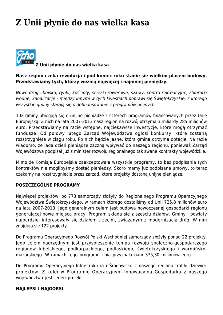 Z Unii płynie do nas wielka kasa Z Unii płynie do nas wielka kasa Nasz region czeka rewolucja i pod koniec roku stanie się wielkim placem budowy. Przedstawiamy tych, którzy wezmą najwięcej i najmniej pieniędzy. Nowe drogi, boiska, rynki, kościoły, ścieżki rowerowe, szkoły, centra rekreacyjne, zbiorniki wodne, kanalizacje - między innymi w tych kwestiach poprawi się Świętokrzyskie, z którego wszystkie gminy starają się o dofinansowanie z programów unijnych. 102 gminy ubiegają się o unijne pieniądze z czterech programów finansowanych przez Unię Europejską. Z nich na lata 2007-2013 nasz region na rozwój otrzyma 3 miliardy 285 milionów euro. Przedstawiamy na razie wstępne, najciekawsze inwestycje, które mogą otrzymać fundusze. Od połowy lutego Zarząd Województwa ogłosi konkursy, które zostaną rozstrzygnięte w ciągu roku. Po nich będzie jasne, która gmina otrzyma dotacje. Na razie wiadomo, że lada dzień pieniądze zaczną wpływać do naszego regionu, ponieważ Zarząd Województwa podpisał już z minister rozwoju regionalnego tak zwane kontrakty wojewódzkie. Mimo że Komisja Europejska zaakceptowała wszystkie programy, to bez podpisania tych kontraktów nie moglibyśmy dostać pieniędzy. Skoro mamy już podpisane umowy, to teraz czekamy na rozstrzygniecie przez zarząd, które projekty dostaną unijne pieniądze. POSZCZEGÓLNE PROGRAMY Najwięcej projektów, bo 773 samorządy złożyły do Regionalnego Programu Operacyjnego Województwa Świętokrzyskiego, w ramach którego dostaliśmy od Unii 725,8 milionów euro na lata 2007-2013. Jego generalnym celem jest budowa nowoczesnej gospodarki regionu generującej nowe miejsca pracy. Program składa się z sześciu działów. Gminy i powiaty najbardziej interesowały się działem trzecim, związanym z modernizacją dróg. W nim znajdują się 122 projekty. Do Programu Operacyjnego Rozwój Polski Wschodniej samorządy złożyły ponad 22 projekty. Jego celem nadrzędnym jest przyspieszenie tempa rozwoju społeczno-gospodarczego regionów lubelskiego, podkarpackiego, podlaskiego, świętokrzyskiego i warmińskomazurskiego. W ramach tego programu Unia przyznała nam 375,30 milionów euro. Do Programu Operacyjnego Infrastruktura i Środowisko z naszego regionu trafiło dziewięć projektów. Z kolei w Programie Operacyjnym Innowacyjna Gospodarka z naszego województwa jest jeden projekt. NAJLEPSI I NAJGORSI Przeanalizowaliśmy wszystkie projekty, które złożyły 102 gminy z naszego województwa do czterech programów unijnych. Wyłoniliśmy te, które złożyły najwięcej i najmniej. W naszym rankingu zdecydowanie prowadzą Kielce, wraz ze znajdującymi się w mieście instytucjami. Wnioskują one o dofinansowanie unijne na kwotę 764 miliony 414 tysięcy złotych. Większość tych inwestycji dotyczy budowy oraz przebudowy dróg miejskich. Z kolei na ostatnim miejscu znajduje się gmina Czarnocin z 1 milionem 218 tysięcy złotych na budowę obiektu sportowego oraz budowę dróg gminnych. Oprócz tego przeliczyliśmy także, ile z kwot dofinansowania, o które starają się samorządy, wychodzi na jednego mieszkańca w poszczególnych gminach na lata 2007-2013. Tu prowadzi gmina Skarżysko Kościelne, w której na każdego mieszkańca wychodzi 5194 złote. Drugie są Kielce z kwotą 3784 złote, trzeci Solec-Zdrój - 2979 złotych. Natomiast najgorzej w tej kwestii wypadł Staszów, w którym na jednego mieszkańca przypada tylko 124 złote z unijnych dotacji. Przeliczenie unijnego dofinansowania poszczególnych inwestycji na jednego mieszkańca w danej gminie bardziej odzwierciedla poziom sprawności samorządu przy przygotowaniu projektów. Właśnie te gminy najbardziej zmienią swój obraz w latach 2008-2013. Tam najbardziej widoczne będą inwestycje. SPEŁNIONE MARZENIE Wójt gminy Skarżysko Kościelne Zbigniew Celski, którego gmina prowadzi w rankingu, może czuć się ojcem sukcesu. Ministerstwo Rozwoju Regionalnego pozostawiło na liście projektów kluczowych wielką inwestycję, chodzi o skanalizowanie gminy. Realizowana będzie ona wespół z Miejskim Przedsiębiorstwem Wodociągów i Kanalizacji w Skarżysku-Kamiennej. Wartość projektu w samej tylko gminie Skarżysko Kościelne liczącej zaledwie 6439 mieszkańców wynosi aż 50 milionów złotych. - Zostaną skanalizowane wszystkie miejscowości w gminie, z wyjątkiem Kierza Niedźwiedziego. Tam kanalizacja powstanie z innych pieniędzy. Tak naprawdę przygotowanie tego projektu zajęło dziesięć lat. Trzy lata trwało sporządzenie samej dokumentacji. Ogromną rolę odegrała grupa społeczników, którzy przekonywali mieszkańców do inwestycji. Były dziesiątki spotkań wiejskich w tych sprawach. Rezultat jest taki, że na dziś 80 procent mieszkańców ma zrobioną dokumentację na przyłącza kanalizacyjne do swoich domostw. Prace rozpoczniemy pod koniec bieżącego roku, zakończymy w 2011 - mówi Zbigniew Celski. Z jednej strony gmina odniosła sukces, z drugiej ma finansowy problem. Musi mieć wielki wkład własny do inwestycji. - Potrzebujemy 20 milionów złotych, a roczny budżet gminy wynosi 10 milionów. Konieczne będzie wzięcie kredytu. Myślę, że będziemy go w stanie spłacić w ciągu dziesięciu lat. Wtedy inwestycja się zwróci - mówi wójt Zbigniew Celski. Gdy zostanie zrobiona kanalizacja, gmina weźmie się za drogi. Jeśli Zarząd Województwa podejmie pomyślną dla niej decyzję, otrzyma ona niemal 3 miliony złotych z Regionalnego Programu Operacyjnego. - Gruntownie zmodernizujemy 16 kilometrów naszych gminnych dróg. Będą nowe chodniki, oświetlenie - mówi wójt Zbigniew Celski. - Spełnią się moje marzenie - dodaje. KIELCE ZGARNĄ WIELKĄ PULĘ Jeśli chodzi o wielkość dofinansowanie ogólnego oraz po jego przeliczeniu na głowę mieszkańca na prawdziwą potęgę w województwie świętokrzyskim wyrastają Kielce. - Z inwestycjami wystartujemy w tym roku. Budżet na nie wyniesie okoł