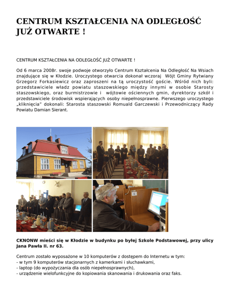 CENTRUM KSZTAŁCENIA NA ODLEGŁOŚĆ JUŻ OTWARTE ! CENTRUM KSZTAŁCENIA NA ODLEGŁOŚĆ JUŻ OTWARTE ! Od 6 marca 2008r. swoje podwoje otworzyło Centrum Kształcenia Na Odległość Na Wsiach znajdujące się w Kłodzie. Uroczystego otwarcia dokonał wczoraj Wójt Gminy Rytwiany Grzegorz Forkasiewicz oraz zaproszeni na tą uroczystość goście. Wśród nich byli: przedstawiciele władz powiatu staszowskiego między innymi w osobie Starosty staszowskiego, oraz burmistrzowie i wójtowie ościennych gmin, dyrektorzy szkół i przedstawiciele środowisk wspierających osoby niepełnosprawne. Pierwszego uroczystego „kliknięcia” dokonali: Starosta staszowski Romuald Garczewski i Przewodniczący Rady Powiatu Damian Sierant. CKNONW mieści się w Kłodzie w budynku po byłej Szkole Podstawowej, przy ulicy Jana Pawła II. nr 63. Centrum zostało wyposażone w 10 komputerów z dostępem do Internetu w tym: - w tym 9 komputerów stacjonarnych z kamerkami i słuchawkami, - laptop (do wypożyczania dla osób niepełnosprawnych), - urządzenie wielofunkcyjne do kopiowania skanowania i drukowania oraz faks. - zdalny dostęp do platformy e-learningowej (LMS WEBServer), - zdalny dostęp do innowacyjnych materiałów dydaktycznych - 50 szkoleń e-learningowych (szkoleń zdalnych, biblioteki multimedialnej, programów edukacyjnych oraz słowników). Do końca czerwca CENTRUM zostanie wyposażone również w specjalistyczne oprogramowanie oraz jeden komplet urządzeń peryferyjnych umożliwiających korzystanie z komputera osobom niepełnosprawnym, zainstalowane zostaną też programy, m.in: Pakiet Microsoft Office, Pakiet Adobe. Godziny otwarcia Centrum: Wtorek: 10-14 Środa: 14-18 Czwartek: 14-18 Piątek: 10-14 Sobota: 14-18 Kontakt z centrum: e-mail: [email protected] tel. (015) 864 75 13 CKNONW w Kłodzie oferuje wszystkim możliwość skorzystania z kursów on-line. Kursy są całkowicie bezpłatne i kończą się egzaminem oraz wydaniem certyfikatu. Cały kurs oraz egzamin odbywa się w sieci za pomocą specjalnej platformy edukacyjnej. Pobierz broszurę informacyjną Centrum - cknonw_broszura.pdf Oto lista aktualnie dostępnych kursów: - Język polski - Matematyka - Historia - Chemia - Geografia - Biologia - Fizyka - Zarządzanie kadrami (cykl szkoleniowy z zakresu ZZL) - Ocena pracowników (cykl szkoleniowy z zakresu ZZL) - Planowanie potrzeb (cykl szkoleniowy z zakresu ZZL) - System motywacyjny (cykl szkoleniowy z zakresu ZZL) - Rekrutacja (cykl szkoleniowy z zakresu ZZL) - Ścieżki kariery (cykl szkoleniowy z zakresu ZZL) - Język angielski - Podstawy technik komputerowych - Użytkowanie komputerów - Przetwarzanie tekstów - Arkusze kalkulacyjne - Bazy danych - Grafika menedżerska i prezentacyjna - Usługi w sieciach informatycznych - Opiekunka dziecięca domowa - Promocja i wsparcie edukacji osób niepełnosprawnych Do końca czerwca dostępne będą kolejne: - Język niemiecki - Opiekun osób starszych - Administracja systemami komputerowymi - Agent ubezpieczeniowy - Asystent bankowości - Broker ubezpieczeniowy - Grafik komputerowy - Handlowiec - Księgowość - Organizator agrobiznesu - Pracownik administracyjny - BHP - Bezpieczeństwo systemów informatycznych - Ochrona danych osobowych - Prawo zamówień publicznych - Edukacja zdalna – szkolenia tworzone w systemie e-learning, blended learning - Przedstawiciel handlowy - Sprzedawca - Telemarketer - Zarządzanie projektami - Zawody przyszłości - nowe formy zatrudnienia - Jak zdobyć i utrzymać pracę - Kariera – decyduję, planuję, działam - Zostań e-pr@cownikiem - Oczekiwania pracodawców – autoprezentacja - Poradnictwo zawodowe – wsparcie dla Twojego sukcesu - A może samozatrudnienie? Serdecznie zapraszamy do korzystania z usług Centrum Kształcenia w Kłodzie. Czeka na Ciebie nowoczesny sprzęt umożliwiający dostęp do platformy elearningowej! Gmina Rytwiany - www.rytwiany.com.pl