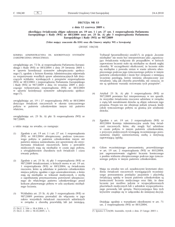 C 106/40 PL Dziennik Urzędowy Unii Europejskiej 24.4.2010 DECYZJA NR S3 z dnia 12 czerwca 2009 r. określająca świadczenia objęte zakresem art. 19 ust. 1 i art. 27 ust. 1 rozporządzenia Parlamentu Europejskiego i Rady (WE) nr 883/2004 oraz art. 25 lit. A) pkt 3 rozporządzenia Parlamentu Europejskiego i Rady (WE) nr 987/2009 (Tekst mający znaczenie dla EOG oraz dla Umowy między WE a Szwajcarią) (2010/C 106/10) Trybunał Sprawiedliwości orzekł (3), że pojęcie „leczenie niezbędne” nie może być interpretowane jako „ogranicza jące świadczenia wyłącznie do przypadków, w których zapewnione leczenie stało się niezbędne na skutek nagłej choroby. W szczególności okoliczność, że leczenie stało się niezbędne z powodu zmian w stanie zdrowia ubez pieczonego podczas jego tymczasowego pobytu w innym państwie członkowskim i może być związane z istniejącą wcześniej patologią, której istnienia ubezpieczony jest świadomy, taką jak choroba przewlekła, nie oznacza, że nie są spełnione warunki stosowania tych przepisów”. KOMISJA ADMINISTRACYJNA DS. KOORDYNACJI SYSTEMÓW ZABEZPIECZENIA SPOŁECZNEGO, uwzględniając art. 72 lit. a) rozporządzenia Parlamentu Europej skiego i Rady (WE) nr 883/2004 z dnia 29 kwietnia 2004 r. w sprawie koordynacji systemów zabezpieczenia społecz nego (1), zgodnie z którym Komisja Administracyjna odpowiada za rozpatrywanie wszelkich spraw administracyjnych lub doty czących wykładni, wynikających z przepisów rozporządzenia (WE) nr 883/2004 i rozporządzenia Parlamentu Europejskiego i Rady (WE) nr 987/2009 z dnia 16 września 2009 r. doty czącego wykonywania rozporządzenia (WE) nr 883/2004 w sprawie koordynacji systemów zabezpieczenia społecz nego (2), (4) Artykuł 25 lit. A) pkt 3 rozporządzenia (WE) nr 987/2009 powinien być interpretowany w ten sposób, że wszystkie świadczenia rzeczowe udzielane w związku z ciążą lub narodzinami dziecka są objęte zakresem tego przepisu. Przepis ten nie obejmuje jednak sytuacji, kiedy celem tymczasowego pobytu za granicą jest urodzenie dziecka. (5) Zgodnie z art. 19 ust. 2 rozporządzenia (WE) nr 883/2004 Komisja Administracyjna ustala listę świad czeń rzeczowych, które, aby mogły być udzielone w czasie pobytu w innym państwie członkowskim, z przyczyn praktycznych wymagają wcześniejszego poro zumienia między zainteresowaną osobą a instytucją zapewniającą opiekę. (6) Celem wcześniejszego porozumienia, przewidzianego w art. 19 ust. 2 rozporządzenia (WE) nr 883/2004, jest zagwarantowanie ciągłości leczenia koniecznego z punktu widzenia ubezpieczonego podczas jego tymcza sowego pobytu w innym państwie członkowskim. (7) Mając na uwadze ten cel, zasadniczymi kryteriami okre ślenia świadczeń rzeczowych wymagających wcześniej szego porozumienia pomiędzy pacjentem i placówką świadczącą opiekę w innym państwie członkowskim są konieczność leczenia medycznego oraz fakt, że dane leczenie jest możliwe jedynie w wyspecjalizowanych placówkach medycznych lub z udziałem wyspecjalizowa nego personelu lub sprzętu. Niewyczerpująca lista tych kryteriów znajduje się w załączniku do niniejszej decyzji. uwzględniając art. 19 i 27 rozporządzenia (WE) nr 883/2004 dotyczące świadczeń rzeczowych w okresie tymczasowego pobytu w państwie członkowskim innym niż państwo właściwe, uwzględniając art. 25 lit. A) pkt 3) rozporządzenia (WE) nr 987/2009, a także mając na uwadze, co następuje: (1) (2) (3) Zgodnie z art. 19 ust. 1 i art. 27 ust. 1 rozporządzenia (WE) nr 883/2004 ubezpieczony, podczas tymczaso wego pobytu w państwie członkowskim innym niż państwo miejsca zamieszkania, jest uprawniony do otrzy mywania świadczeń rzeczowych, które z powodów medycznych stają się niezbędne w czasie jego pobytu, z uwzględnieniem charakteru tych świadczeń i czasu trwania pobytu. Zgodnie z art. 25 lit. A) pkt 3 rozporządzenia (WE) nr 987/2009 świadczeniami, o których mowa w art. 19 ust. 1 rozporządzenia (WE) nr 883/2004, są świadczenia rzeczowe, które są udzielane w państwie członkowskim miejsca pobytu, zgodnie z jego ustawodawstwem, a które stają się niezbędne ze wskazań medycznych, z myślą o zapobieżeniu przymusowemu powrotowi ubezpieczo nego do właściwego państwa członkowskiego przed końcem planowanego pobytu w celu uzyskania niezbęd nego leczenia. Wykładnia art. 25 lit. A) pkt 3 rozporządzenia (WE) nr 987/2009 powinna prowadzić do włączenia w jego zakres wszystkich świadczeń rzeczowych udzielanych w związku z chorobą przewlekłą lub już istniejącą. (1) Dz.U. L 166 z 30.4.2004, s. 1. (2) Dz.U. L 284 z 30.10.2009, s. 1. Działając zgodnie z warunkami określonymi w art. 71 ust. 2 rozporządzenia (WE) nr 883/2004, (3) Sprawa C-326/00, Ioannidis, wyrok z dnia 25 lutego 2003 r. 24.4.2010 PL Dziennik Urzędowy Unii Europejskiej mienia pomiędzy ubezpieczonym a placówką gwarantującą leczenie w celu zapewnienia dostępności leczenia podczas pobytu ubezpieczonego w państwie członkowskim innym niż właściwe państwo członkowskie lub państwo miejsca zamieszkania. STANOWI, CO NASTĘPUJE: 1. Świadczenia rzeczowe, które mają być udzielane na mocy art. 19 ust. 1 i art. 27 ust. 1 rozporządzenia (WE) nr 883/2004 oraz art. 25 lit. A) pkt 3 rozporządzenia (WE) nr 987/2009 obejmują świadczenia udzielane w związku z chorobą przewlekłą lub już istniejącą oraz w związku z ciążą i narodzinami dziecka. 2. Świadczenia rzeczowe, w tym związane z chorobą prze wlekłą lub już istniejącą albo z narodzinami dziecka, nie są objęte tymi przepisami, jeżeli otrzymanie tych świadczeń jest celem pobytu w innym państwie członkowskim. Niewyczerpująca lista rodzajów leczenia spełniających te kryteria znajduje się w załączniku do niniejszej decyzji. 4. Niniejsza decyzja zostaje opublikowana w Dzienniku Urzę dowym Unii Europejskiej. Niniejszą decyzję stosuje się od dnia wejścia w