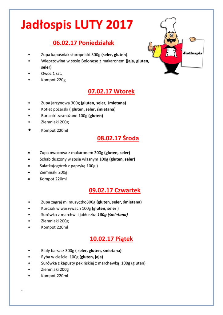 Jadłospis LUTY 2017 06.02.17 Poniedziałek • • • • Zupa kapuśniak staropolski 300g (seler, gluten) Wieprzowina w sosie Bolonese z makaronem (jaja, gluten, seler) Owoc 1 szt. Kompot 220g 07.02.17 Wtorek • • • • Zupa jarzynowa 300g (gluten, seler, śmietana) Kotlet pożarski ( gluten, seler, śmietana) Buraczki zasmażane 100g (gluten) Ziemniaki 200g • Kompot 220ml 08.02.17 Środa Zupa owocowa z makaronem 300g (gluten, seler) Schab duszony w sosie własnym 100g (gluten, seler) Sałatka(ogórek z papryką 100g ) Ziemniaki 200g Kompot 220ml 09.02.17 Czwartek • • • • • Zupa zagraj mi muzyczko300g (gluten, seler, śmietana) Kurczak w warzywach 100g (gluten, seler ) Surówka z marchwi i jabłuszka 100g (śmietana) Ziemniaki 200g Kompot 220ml 10.02.17 Piątek • • • • • . Biały barszcz 300g ( seler, gluten, śmietana) Ryba w cieście 100g (gluten, jaja) Surówka z kapusty pekińskiej z marchewką 100g (gluten) Ziemniaki 200g Kompot 220ml 13.02.17 Poniedziałek Zupa gulaszowa 300g (seler, gluten) Makaron z twarogiem 100g (gluten, śmietana, jaja) Owoc 1szt Woda z cytryną 220ml 14.02.17 Wtorek Zupa ogórkowa300g (gluten, śmietana, seler) Kotlet mielony 100g (jaja, gluten) Marchewka z groszkiem100g Ziemniaki 200g Kompot 220ml 15.02.17 Środa Zupa brokułowa 300g (gluten, seler) Hamburger 1szt Kompot 220ml 16.02.17 Czwartek Zupa krupnik wiejski 300g (śmietana, gluten, seler) Pieczeń drobiowa 120g Pomidor, ogórek z sosem jogurtowym100g Ziemniaki 200g Kompot 220ml 17.02.17 Piątek . Zupa pomidorowa z brązowym ryżem 350g (seler, śmietana, gluten) Kotlet z piersi z sezamem 100g ( sezam) Warzywa z pieca 100g Ziemniaki 200g Kompot 220ml 20.02.17 Poniedziałek • • • Zupa grochowa 300g (seler, gluten) Ryz z jabłkiem i cynamonem, sos jogurtowy 100g Woda z cytryną 220ml 21.02.17 Wtorek • • • • Żurek 300g (seler, śmietana, gluten) Gołąbki w sosie pomidorowym 100g Ziemniaki 200g Kompot 220 ml 22.02.17 Środa • • • • • Zupa barszcz czerwony 300g (seler, śmietana, gluten) Chrupiący kurczak 100g Frytki 100g Surówka Colesław 100g Kompot 220 ml 23.02.17 Czwartek • • • • Zupa koperkowa z zacierką 300g (seler, gluten) Pieczeń wieprzowa w sosie100g Surówka z buraczków 100g Kompot 220 ml 24.02.17 Piątek • • • • • . Zupa solferino (seler, śmietana, gluten) Paluszki rybne 100g Ogórek kiszony w całości 1 szt. Ziemniaki 200g Kompot 220ml 27.02.17 Poniedziałek Kapuśniak ze słodkiej kapusty 300g (seler, gluten) Makaron Pene z mięsem w sosie pomidorowym 100g (seler, śmietana, gluten) Owoc 1 szt. Kompot 220ml 28.02.17 Wtorek Rosół 300g (seler, gluten) Udko z kurczaka 1szt. Surówka z kapusty włoskiej 100g Ziemniaki 200g Kompot 220ml Substancje lub produkty powodujące alergie lub reakcje nietolerancji zaznaczono wytłuszczonym drukiem przy potrawie zawierającej alergen. .
