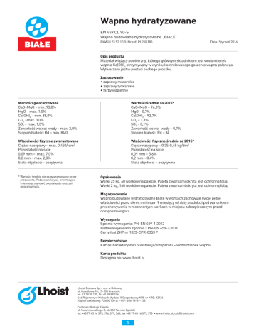 Wapno hydratyzowane EN 459 CL 90-S Wapno budowlane hydratyzowane „BIAŁE” PKWiU 23.52.10.0; Nr ref: PL21K185 Data: Styczeń 2016 Opis produktu Materiał wiążący powietrzny, którego głównym składnikiem jest wodorotlenek wapnia Ca(OH)2 otrzymywany w wyniku kontrolowanego gaszenia wapna palonego. Wytwarzany jest w postaci suchego proszku. Zastosowanie • zaprawy murarskie • zaprawy tynkarskie • farby wapienne Wartości gwarantowane CaO+MgO – min. 93,0% MgO – max. 1,0% Ca(OH)2 – min. 88,0% CO2 –max. 3,0% SO3 – max. 1,0% Zawartość wolnej wody – max. 2,0% Stopień białości Rd – min. 84,0 Wartości średnie za 2015* CaO+MgO – 96,0% MgO – 0,7% Ca(OH)2 – 92,7% CO2 – 1,3% SO3 – 0,1% Zawartość wolnej wody – 0,7% Stopień białości Rd – 84 Właściwości fizyczne gwarantowane Ciężar nasypowy – max. 0,450/ dm3 Pozostałość na sicie 0,09 mm – max. 7,0% 0,2 mm – max. 2,0% Stała objętości – pozytywna Właściwości fizyczne średnie za 2015* Ciężar nasypowy – 0,35-0,45 kg/dm3 Pozostałość na sicie 0,09 mm – 5,6% 0,2 mm – 0,4% Stała objętości – pozytywna * Wartości średnie nie są gwarantowane przez producenta. Podane analizy są orientacyjne i nie mogą stanowić podstawy do roszczeń gwarancyjnych. Opakowanie Worki 25 kg, 40 worków na palecie. Paleta z workami okryta jest ochronną folią. Worki 2 kg, 160 worków na palecie. Paleta z workami okryta jest ochronną folią. Magazynowanie Wapno budowlane hydratyzowane Białe w workach zachowuje swoje pełne właściwości przez okres minimum 9 miesięcy od daty produkcji pod warunkiem przechowywania w nieotwartych workach w miejscu zabezpieczonym przed dostępem wilgoci Wymagania Spełnia wymagania: PN-EN 459-1:2012 Badania wykonano zgodnie z PN-EN 459-2:2010 Certyfikat ZKP nr 1023-CPR-0353 F Bezpieczeństwo Karta Charakterystyki Substancji / Preparatu – wodorotlenek wapnia Karta produktu Dostępna na: www.lhoist.pl Lhoist Bukowa Sp. z o.o. w Bukowej ul. Osiedlowa 10; 29-105 Krasocin tel. 41 38 89 105, fax 44 38 89 106 Sad Rejonowy w Kielcach Wydział X Gospodarczy KRS nr KRS: 32126 Kapitał zakładowy: 72 600 100 zł • NIP: 656-14-69-128 Centrum Obsługi Klienta ul. Świerczewskiego 5, 46-050 Tarnów Opolski tel. +48 77 45 16 375, 376, 379, 368, fax +48 77 45 16 377, 378 • www.lhoist.pl, [email protected] 1 Wapno hydratyzowane Wapno hydratyzowane EN 459 CL 90-S EN 459 CL 90-S Wapno budowlane hydratyzowane „BIAŁE” Wapno hydratyzowane budowlane hydratyzowane PKWiU 23.52.10.0; Nr ref: PL21K185 2016 Wapno EN„BIAŁE” 459 Data: CLStyczeń 90-S PKWiU 23.52.10.0; Nr ref: PL21K185 Wapno hydratyzowane EN 459 CL 90-S Data: budowlane Styczeń 2016 Wapno hydratyzowane „BIAŁE” Wapno budowlane hydratyzowane „BIAŁE” PKWiU Nr ref: PL21K185 Rola23.52.10.0; wapna Białego w zaprawach Właściwości zapraw murarskich PKWiU 23.52.10.0; Data: Styczeń 2016 Nr ref: PL21K185 Data: Styczeń 2016 Wapno hydratyzowane Białe poprawia urabialność zaprawy, a w konstrukcji murowej Rola wapna Białego w zaprawach nadaje jej większą elastyczność i przyczepność do materiałów ściennych. Wapno hydratyzowane Białe poprawia urabialność zaprawy, a w konstrukcji murowej nadaje jej większą elastyczność i przyczepność do materiałów ściennych. WapnoBiałego Białe wytwarzane na bazie wyselekcjonowanego kamienia wapiennego Rola •wapna w zaprawach dzięki starannemu procesowi wypału i hydratacji mazaprawy, wysoki stopień Rd Rola wapna Białego w zaprawach Wapno hydratyzowane Białe poprawia urabialność a w białości konstrukcji oraz Wapno Białe wytwarzane na bazie wyselekcjonowanego kamienia wapiennego podwyższoną zawartość CaO znacznie przekraczającą wymagania określone Wapno dzięki hydratyzowane Białe poprawiai przyczepność urabialność zaprawy, a wściennych. konstrukcji murowej nadaje jej większą elastyczność do materiałów starannemu normą PN-EN 459-1procesowi wypału i hydratacji ma wysoki stopień białości Rd Wodożądność murowejoraz nadaje jej większą elastyczność i przyczepność do materiałów ściennych. podwyższoną zawartość CaO znacznie określone • Jednymi z ważniejszych parametrów zaprawyprzekraczającą murarskiej jestwymagania jej urabialność Wapno BiałePN-EN wytwarzane normą 459-1 na bazie wyselekcjonowanego kamienia wapiennego Retencja Stopień i retencja wody. wody białości dzięki Wapno Białe wytwarzane na wypału bazie wyselekcjonowanego kamienia starannemu procesowi i hydratacji wysoki stopień białości Rd i Jednymi z ważniejszych parametrów zaprawymamurarskiej jest jejwapiennego urabialność dzięki starannemu procesowi wypału i hydratacji ma wysoki stopień białości retencja wody. oraz podwyższoną zawartość CaO znacznie przekraczającą wymagania określone Dzięki odpowiednio wyselekcjonowanym parametrom wapno Białe w zaprawie Rd Dzięki wyselekcjonowanym parametrom wapno Białe określone w zaprawie oraz podwyższoną zawartość CaO znacznie przekraczającą wymagania normą PN-ENodpowiednio 459-1 murarskiej powoduje znaczną poprawę urabialności oraz retencji wody. Dzięki temu Elastyczność Urabilaność murarskiej powoduje znaczną poprawę urabialności oraz wody. Dzięki normą PN-EN 459-1 Jednymi z przez ważniejszych zaprawy murarskiej jestretencji jej urabialność i zaprawa długi czasparametrów zachowuje swoje właściwości robocze, a zgromadzona temu zaprawa długi czaszaprawy zachowuje swoje właściwości robocze, i a retencja Jednymi z ważniejszych parametrów murarskiej jest jej urabialność w niej woda służy doprzez procesu wiązania cementu w zaprawie, co pozwala uzyskać wody. zgromadzona wwyselekcjonowanym niej woda służy wiązania cementu wymaganą zaprawy podo 28 procesu dniach. retencja wody.wytrzymałość Dzięki odpowiednio parametrom wapno Białe wwzaprawie, zaprawieco Przyczepność Napowietrzenie pozwala uzyskać wymaganą wytrzymałość za