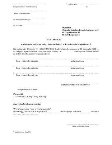 …………………………………….. Imię i nazwisko wnioskodawcy Legionowo,……………………… data …………………………………….. Adres zameldowania …………………………………………….. Nr dowodu osobistego …………………………………………….. Nr telefonu Dyrektor Zespołu Szkolno-Przedszkolnego nr 2 ul. Jagiellońska 67 05-120 Legionowo WNIOSEK o udzielenie zniżki za pobyt dziecka/dzieci* w Przedszkolu Miejskim nr 2 Na podstawie Uchwały Nr XXVI/334/2012 Rady Miasta Legionowo z 28 listopada 2012 r., w związku z posiadaniem „Karty Dużej Rodziny” nr……………..wnoszę o udzielenie zniżki za pobyt dziecka/dzieci* w przedszkolu: 1. …………………………………………................................ ……………………………….. Imię i nazwisko dziecka data urodzenia 2. …………………………………………................................ ……………………………….. Imię i nazwisko dziecka data urodzenia 3. …………………………………………................................ ……………………………….. Imię i nazwisko dziecka data urodzenia …………………………………………… czytelny podpis wnioskodawcy * niepotrzebne skreślić Załączniki: 1. kserokopia „Karty Dużej Rodziny” ___________________________________________________________________________ Decyzja dyrektora szkoły: Wyrażam zgodę / nie wyrażam zgody* Informuję, że zniżka w wysokości…………… obowiązuje od dnia………….do dnia …………………………. ...................................................... data, podpis dyrektora * niepotrzebne skreślić