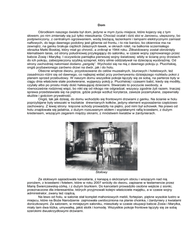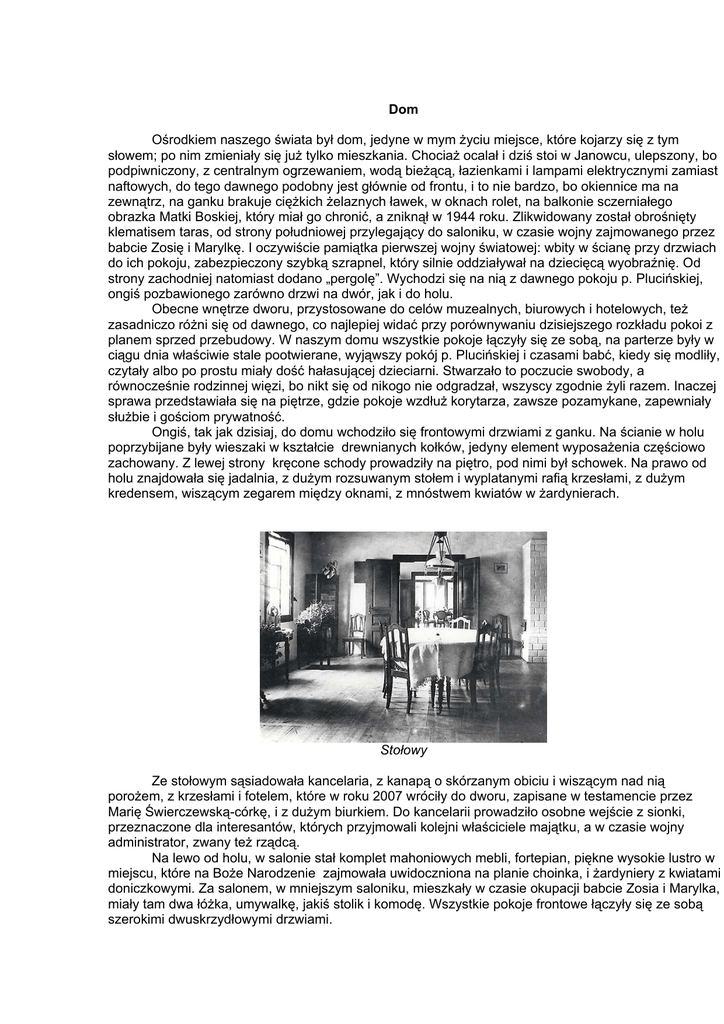Dom Ośrodkiem naszego świata był dom, jedyne w mym życiu miejsce, które kojarzy się z tym słowem; po nim zmieniały się już tylko mieszkania. Chociaż ocalał i dziś stoi w Janowcu, ulepszony, bo podpiwniczony, z centralnym ogrzewaniem, wodą bieżącą, łazienkami i lampami elektrycznymi zamiast naftowych, do tego dawnego podobny jest głównie od frontu, i to nie bardzo, bo okiennice ma na zewnątrz, na ganku brakuje ciężkich żelaznych ławek, w oknach rolet, na balkonie sczerniałego obrazka Matki Boskiej, który miał go chronić, a zniknął w 1944 roku. Zlikwidowany został obrośnięty klematisem taras, od strony południowej przylegający do saloniku, w czasie wojny zajmowanego przez babcie Zosię i Marylkę. I oczywiście pamiątka pierwszej wojny światowej: wbity w ścianę przy drzwiach do ich pokoju, zabezpieczony szybką szrapnel, który silnie oddziaływał na dziecięcą wyobraźnię. Od strony zachodniej natomiast dodano „pergolę”. Wychodzi się na nią z dawnego pokoju p. Plucińskiej, ongiś pozbawionego zarówno drzwi na dwór, jak i do holu. Obecne wnętrze dworu, przystosowane do celów muzealnych, biurowych i hotelowych, też zasadniczo różni się od dawnego, co najlepiej widać przy porównywaniu dzisiejszego rozkładu pokoi z planem sprzed przebudowy. W naszym domu wszystkie pokoje łączyły się ze sobą, na parterze były w ciągu dnia właściwie stale pootwierane, wyjąwszy pokój p. Plucińskiej i czasami babć, kiedy się modliły, czytały albo po prostu miały dość hałasującej dzieciarni. Stwarzało to poczucie swobody, a równocześnie rodzinnej więzi, bo nikt się od nikogo nie odgradzał, wszyscy zgodnie żyli razem. Inaczej sprawa przedstawiała się na piętrze, gdzie pokoje wzdłuż korytarza, zawsze pozamykane, zapewniały służbie i gościom prywatność. Ongiś, tak jak dzisiaj, do domu wchodziło się frontowymi drzwiami z ganku. Na ścianie w holu poprzybijane były wieszaki w kształcie drewnianych kołków, jedyny element wyposażenia częściowo zachowany. Z lewej strony kręcone schody prowadziły na piętro, pod nimi był schowek. Na prawo od holu znajdowała się jadalnia, z dużym rozsuwanym stołem i wyplatanymi rafią krzesłami, z dużym kredensem, wiszącym zegarem między oknami, z mnóstwem kwiatów w żardynierach. Stołowy Ze stołowym sąsiadowała kancelaria, z kanapą o skórzanym obiciu i wiszącym nad nią porożem, z krzesłami i fotelem, które w roku 2007 wróciły do dworu, zapisane w testamencie przez Marię Świerczewską-córkę, i z dużym biurkiem. Do kancelarii prowadziło osobne wejście z sionki, przeznaczone dla interesantów, których przyjmowali kolejni właściciele majątku, a w czasie wojny administrator, zwany też rządcą. Na lewo od holu, w salonie stał komplet mahoniowych mebli, fortepian, piękne wysokie lustro w miejscu, które na Boże Narodzenie zajmowała uwidoczniona na planie choinka, i żardyniery z kwiatami doniczkowymi. Za salonem, w mniejszym saloniku, mieszkały w czasie okupacji babcie Zosia i Marylka, miały tam dwa łóżka, umywalkę, jakiś stolik i komodę. Wszystkie pokoje frontowe łączyły się ze sobą szerokimi dwuskrzydłowymi drzwiami. Salon Od strony zachodniej do pokoju babć przylegał pokój naszej matki i małego Tadeuszka, czyli Mopsa, wyposażony w dwa łóżka, umywalkę, szafkę i coś do siedzenia; dalej Krzyśka i mój, z dwoma niedużymi jesionowymi łóżkami, jasną dwudrzwiową szafą, bardzo nowoczesnym tapczanem, chyba z lubelskiego mieszkania rodziców, szafką na zabawki oraz stołem, przy którym uczyliśmy się i bawiliśmy; p. Plucińskiej, na pewno z łóżkiem i chyba nocną szafką, gdzie trzymała klucze do spiżarni i różnych pomieszczeń gospodarskich; wreszcie gabinet z biurkiem, kanapą, fotelami klubowymi i szafami bibliotecznymi. Z gabinetu wchodziło się do łazienki z wanną, umywalką i piecem kąpielowym, z niej zaś do ubikacji z bieżącą wodą. Dalej był pokój kredensowy, spiżarnia i drzwi do sionki, skąd schody służbowe prowadziły na piętro, a kryty dachem drewniany korytarz do kuchni w murowanej oficynie. W kredensie do zmywania też była bieżąca woda, podobnie jak w łazience na górze, ale do umywalek w pokojach przynoszono z kuchni ciepłą wodę w dzbankach. Z luksusu kąpieli w dużej wannie korzystaliśmy tylko w soboty. plan poddasza plan przyziemia Tutaj, skoro już o wodzie mowa, wypada opisać sprawny moniacki system wodnokanalizacyjny. Kiedy w domu zabrakło wody, ktoś - w moich najdawniejszych wspomnieniach dziadek Zembrzuski - wychodził na ganek i donośnym głosem wołał w kierunku podwórza „Wooda!” Tam zawsze znajdował się fornal czy inny pracownik, na dane hasło podchodził do pompy i obracał dużym kołem aż do napełnienia zbiornika na dworskim strychu. Musiał istnieć mechanizm, kierujący strumień wody albo do rur, albo do koryta dla zwierząt, ale nie zgłębiłam tajników jego działania. Z zaopatrzeniem w wodę ściśle wiązała się kwestia ścieków. Spływały one do wielkiego, nigdy nie opróżnianego szamba pod lipą od strony sadzawki. Za mojej pamięci otwarte tylko raz, przypominało bardzo głęboką studnię. Żadne złe wonie nie dolatywały spod porastającego pokrywę trawnika, a o istnieniu kanalizacji świadczyła jedynie wąska ciemna strużka, najlepiej widoczna zimą na lodzie, kiedy zamarzła sadzawka. Na piętrze od strony wschodniej i południowej trzy pokoje stanowiły oddzielną całość i te przed wojną zajmowali Dąbrowscy, później stały puste, pewnie służyły za gościnne, jeden za dodatkową spiżarnię, gdzie p. Plucińska przechowywała orzechy, pierniki i podobne świąteczne przysmaki. W trzech pokojach od frontu, z drzwiami na balkon, mieszkali w czasie okupacji Olszowscy, w czwartym krewniak Zembrzuskich, Tomasz de Malmö Solman (rzekomo spowinowacony też ze szwedzką rodziną królewską, a w Moniakach zatrudnion
