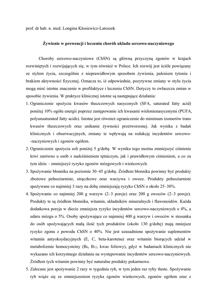 prof. dr hab. n. med. Longina Kłosiewicz-Latoszek Żywienie w prewencji i leczeniu chorób układu sercowo-naczyniowego Choroby sercowo-naczyniowe (ChSN) są główną przyczyną zgonów w krajach rozwiniętych i rozwijających się, w tym również w Polsce. Ich rozwój jest ściśle powiązany ze stylem życia, szczególnie z nieprawidłowym sposobem żywienia, paleniem tytoniu i brakiem aktywności fizycznej. Oznacza to, iż odpowiednie, pozytywne zmiany w stylu życia mogą mieć istotne znaczenie w profilaktyce i leczeniu ChSN. Dotyczy to zwłaszcza zmian w sposobie żywienia. W praktyce klinicznej istotne są następujące działania: 1. Ograniczenie spożycia kwasów tłuszczowych nasyconych (SFA, saturated fatty acid) poniżej 10% ogółu energii poprzez zastępowanie ich kwasami wielonienasyconymi (PUFA, polyunsaturated fatty acids). Istotne jest również ograniczenie do minimum izomerów trans kwasów tłuszczowych oraz unikanie żywności przetworzonej. Jak wynika z badań klinicznych i obserwacyjnych, zmiany te wpływają na redukcję incydentów sercowo-naczyniowych i zgonów ogółem. 2. Ograniczenie spożycia soli poniżej 5 g/dobę. W wyniku tego można zmniejszyć ciśnienie krwi zarówno u osób z nadciśnieniem tętniczym, jak i prawidłowym ciśnieniem, a co za tym idzie – zmniejszyć ryzyko zgonów mózgowych i wieńcowych. 3. Spożywanie błonnika na poziomie 30–45 g/dobę. Źródłem błonnika powinny być produkty zbożowe pełnoziarniste, strączkowe oraz warzywa i owoce. Produkty pełnoziarniste spożywane co najmniej 3 razy na dobę zmniejszają ryzyko ChSN o około 25–30%. 4. Spożywanie co najmniej 200 g warzyw (2–3 porcje) oraz 200 g owoców (2–3 porcje). Produkty te są źródłem błonnika, witamin, składników mineralnych i flawonoidów. Każda dodatkowa porcja w diecie zmniejsza ryzyko incydentów sercowo-naczyniowych o 4%, a udaru mózgu o 5%. Osoby spożywające co najmniej 400 g warzyw i owoców w stosunku do osób spożywających małą ilość tych produktów (około 130 g/dobę) mają mniejsze ryzyko zgonu z powodu ChSN o 40%. Nie jest uzasadnione spożywanie suplementów witamin antyoksydacyjnych (E, C, beta-karotenu) oraz witamin biorących udział w metabolizmie homocysteiny (B6, B12, kwas foliowy), gdyż w badaniach klinicznych nie wykazano ich korzystnego działania na występowanie incydentów sercowo-naczyniowych. Źródłem tych witamin powinny być naturalne produkty pokarmowe. 5. Zalecane jest spożywanie 2 razy w tygodniu ryb, w tym jeden raz ryby tłuste. Spożywanie ryb wiąże się ze zmniejszeniem ryzyka zgonów wieńcowych, zgonów ogółem oraz z powodu udaru mózgu. W prewencji wtórnej zaleca się spożywanie kwasów omega-3 (EPA, DHA) w postaci ryb lub kapsułek w dawce 1 g/dobę w celu zmniejszenia ryzyka ChSN. W hipertrójglicerydemii można stosować te kwasy w większych dawkach, czyli do 4 g/dobę. 6. Spożycie alkoholu należy ograniczać do 20 g/dobę dla mężczyzn i 10 g/dobę dla kobiet. Dietą rekomendowaną w profilaktyce ChSN jest dieta śródziemnomorska. Korzyści z jej stosowania obserwowano w badaniach klinicznych w ramach prewencji pierwotnej (PREDIMED Study) i prewencji wtórnej (Lyon Heart Study). Redukcja incydentów sercowo-naczyniowych wynosiła od 30% do 70%. Jak wynika z badań klinicznych i obserwacyjnych, zmiana stylu życia, a w tym sposobu żywienia, przyczyniła się w ostatnich 3 dekadach do redukcji zgonów z powodu ChSN. Dotyczyło to USA, Australii, krajów Europy Zachodniej i Północnej, a także krajów postkomunistycznych. W Polsce redukcja zgonów z powodu choroby niedokrwiennej serca w latach 1991–2010 wynosiła około 40%. W 66% było to determinowane zmianami w czynnikach ryzyka, na które istotny wpływ miała zmiana sposobu żywienia. Zmniejszyło się zwłaszcza spożycie tłuszczów zwierzęcych, a wzrosło spożycie tłuszczów roślinnych oraz warzyw i owoców. Podsumowując, należy zatem podkreślić, iż zmiana stylu życia, a zwłaszcza sposobu żywienia, jest podstawą profilaktyki chorób sercowo-naczyniowych, gdyż pozwala zredukować ryzyko tych chorób średnio o 50–70%. Profilaktyka ChSN poprzez zmianę stylu życia jest powszechnie rekomendowana zarówno przez towarzystwa kardiologiczne amerykańskie, europejskie, jak i polskie.