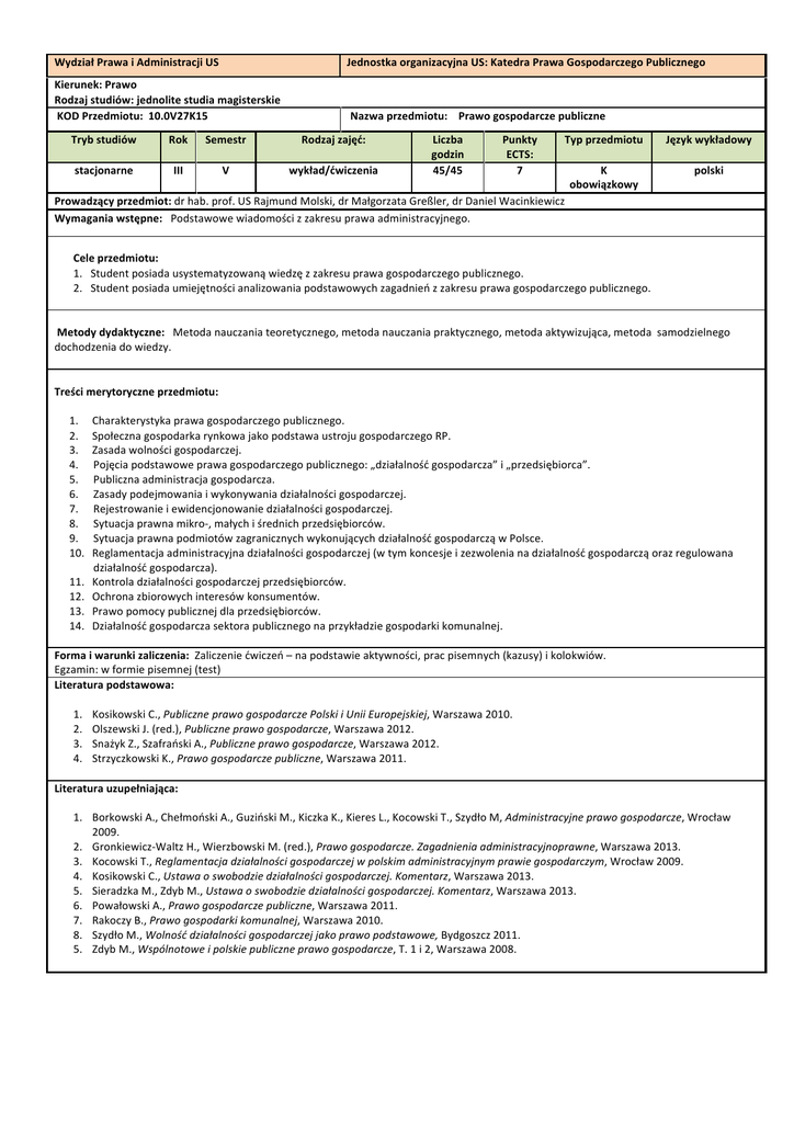 Wydział Prawa i Administracji US Jednostka organizacyjna US: Katedra Prawa Gospodarczego Publicznego Kierunek: Prawo Rodzaj studiów: jednolite studia magisterskie KOD Przedmiotu: 10.0V27K15 Nazwa przedmiotu: Prawo gospodarcze publiczne Tryb studiów Rok Semestr Rodzaj zajęć: stacjonarne III V wykład/ćwiczenia Liczba godzin 45/45 Punkty ECTS: 7 Typ przedmiotu Język wykładowy K obowiązkowy polski Prowadzący przedmiot: dr hab. prof. US Rajmund Molski, dr Małgorzata Greßler, dr Daniel Wacinkiewicz Wymagania wstępne: Podstawowe wiadomości z zakresu prawa administracyjnego. Cele przedmiotu: 1. Student posiada usystematyzowaną wiedzę z zakresu prawa gospodarczego publicznego. 2. Student posiada umiejętności analizowania podstawowych zagadnień z zakresu prawa gospodarczego publicznego. Metody dydaktyczne: Metoda nauczania teoretycznego, metoda nauczania praktycznego, metoda aktywizująca, metoda samodzielnego dochodzenia do wiedzy. Treści merytoryczne przedmiotu: 1. Charakterystyka prawa gospodarczego publicznego. 2. Społeczna gospodarka rynkowa jako podstawa ustroju gospodarczego RP. 3. Zasada wolności gospodarczej. 4. Pojęcia podstawowe prawa gospodarczego publicznego: „działalność gospodarcza” i „przedsiębiorca”. 5. Publiczna administracja gospodarcza. 6. Zasady podejmowania i wykonywania działalności gospodarczej. 7. Rejestrowanie i ewidencjonowanie działalności gospodarczej. 8. Sytuacja prawna mikro-‐, małych i średnich przedsiębiorców. 9. Sytuacja prawna podmiotów zagranicznych wykonujących działalność gospodarczą w Polsce. 10. Reglamentacja administracyjna działalności gospodarczej (w tym koncesje i zezwolenia na działalność gospodarczą oraz regulowana działalność gospodarcza). 11. Kontrola działalności gospodarczej przedsiębiorców. 12. Ochrona zbiorowych interesów konsumentów. 13. Prawo pomocy publicznej dla przedsiębiorców. 14. Działalność gospodarcza sektora publicznego na przykładzie gospodarki komunalnej. Forma i warunki zaliczenia: Zaliczenie ćwiczeń – na podstawie aktywności, prac pisemnych (kazusy) i kolokwiów. Egzamin: w formie pisemnej (test) Literatura podstawowa: 1. Kosikowski C., Publiczne prawo gospodarcze Polski i Unii Europejskiej, Warszawa 2010. 2. Olszewski J. (red.), Publiczne prawo gospodarcze, Warszawa 2012. 3. Snażyk Z., Szafrański A., Publiczne prawo gospodarcze, Warszawa 2012. 4. Strzyczkowski K., Prawo gospodarcze publiczne, Warszawa 2011. Literatura uzupełniająca: 1. Borkowski A., Chełmoński A., Guziński M., Kiczka K., Kieres L., Kocowski T., Szydło M, Administracyjne prawo gospodarcze, Wrocław 2009. 2. Gronkiewicz-‐Waltz H., Wierzbowski M. (red.), Prawo gospodarcze. Zagadnienia administracyjnoprawne, Warszawa 2013. 3. Kocowski T., Reglamentacja działalności gospodarczej w polskim administracyjnym prawie gospodarczym, Wrocław 2009. 4. Kosikowski C., Ustawa o swobodzie działalności gospodarczej. Komentarz, Warszawa 2013. 5. Sieradzka M., Zdyb M., Ustawa o swobodzie działalności gospodarczej. Komentarz, Warszawa 2013. 6. Powałowski A., Prawo gospodarcze publiczne, Warszawa 2011. 7. Rakoczy B., Prawo gospodarki komunalnej, Warszawa 2010. 8. Szydło M., Wolność działalności gospodarczej jako prawo podstawowe, Bydgoszcz 2011. 5. Zdyb M., Wspólnotowe i polskie publiczne prawo gospodarcze, T. 1 i 2, Warszawa 2008.