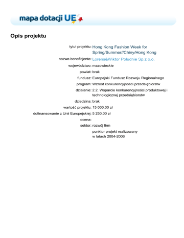 Opis projektu tytuł projektu: Hong Kong Fashion Week for Spring/Summer//Chiny/Hong Kong nazwa beneficjenta: Lorens&Wiktor Południe Sp.z o.o. województwo: mazowieckie powiat: brak fundusz: Europejski Fundusz Rozwoju Regionalnego program: Wzrost konkurencyjności przedsiębiorstw działanie: 2.2. Wsparcie konkurencyjności produktowej i technologicznej przedsiębiorstw dziedzina: brak wartość projektu: 15 000.00 zł dofinansowanie z Unii Europejskiej: 5 250.00 zł ocena: sektor: rozwój firm punktor projekt realizowany w latach 2004-2006