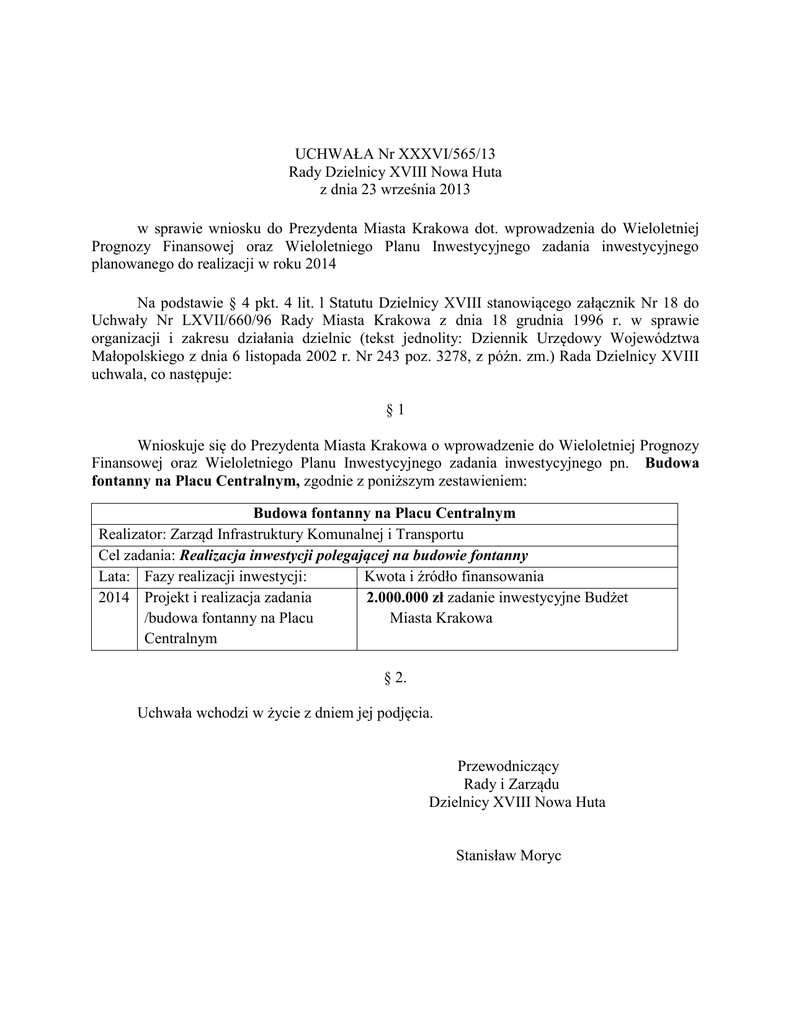 UCHWAŁA Nr XXXVI/565/13 Rady Dzielnicy XVIII Nowa Huta z dnia 23 września 2013 w sprawie wniosku do Prezydenta Miasta Krakowa dot. wprowadzenia do Wieloletniej Prognozy Finansowej oraz Wieloletniego Planu Inwestycyjnego zadania inwestycyjnego planowanego do realizacji w roku 2014 Na podstawie § 4 pkt. 4 lit. l Statutu Dzielnicy XVIII stanowiącego załącznik Nr 18 do Uchwały Nr LXVII/660/96 Rady Miasta Krakowa z dnia 18 grudnia 1996 r. w sprawie organizacji i zakresu działania dzielnic (tekst jednolity: Dziennik Urzędowy Województwa Małopolskiego z dnia 6 listopada 2002 r. Nr 243 poz. 3278, z późn. zm.) Rada Dzielnicy XVIII uchwala, co następuje: §1 Wnioskuje się do Prezydenta Miasta Krakowa o wprowadzenie do Wieloletniej Prognozy Finansowej oraz Wieloletniego Planu Inwestycyjnego zadania inwestycyjnego pn. Budowa fontanny na Placu Centralnym, zgodnie z poniższym zestawieniem: Budowa fontanny na Placu Centralnym Realizator: Zarząd Infrastruktury Komunalnej i Transportu Cel zadania: Realizacja inwestycji polegającej na budowie fontanny Lata: Fazy realizacji inwestycji: Kwota i źródło finansowania 2014 Projekt i realizacja zadania 2.000.000 zł zadanie inwestycyjne Budżet /budowa fontanny na Placu Miasta Krakowa Centralnym § 2. Uchwała wchodzi w życie z dniem jej podjęcia. Przewodniczący Rady i Zarządu Dzielnicy XVIII Nowa Huta Stanisław Moryc Uzasadnienie: Plac Centralny został zaprojektowany jako geometryczne wnętrze otoczone reprezentacyjnymi budynkami. Centrum Placu Centralnego miał akcentować obelisk widoczny na planie i makiecie Nowej Huty z początku lat 50-tych XX wieku. Zasadnym jest powrót do tych projektów i uzupełnienie Placu o tą istotna dominantę. W miejscu obelisku możliwe jest zaprojektowanie fontanny o pionowym wysokim strumieniu wody lub połączenie fontanny z obeliskiem. Wymaga to również opracowania zagospodarowanie najbliższego otoczenia. Ponadto inwestycja znajduje się w obszarze układu urbanistycznego Nowej Huty wpisanego do rejestru zabytków. Projekt fontanny zostanie wyłoniony w konkursie, na który Rada Dzielnicy XVIII przeznaczyła środki. Budowa fontanny będzie dopełnieniem obchodów 65-lecia Nowej Huty.