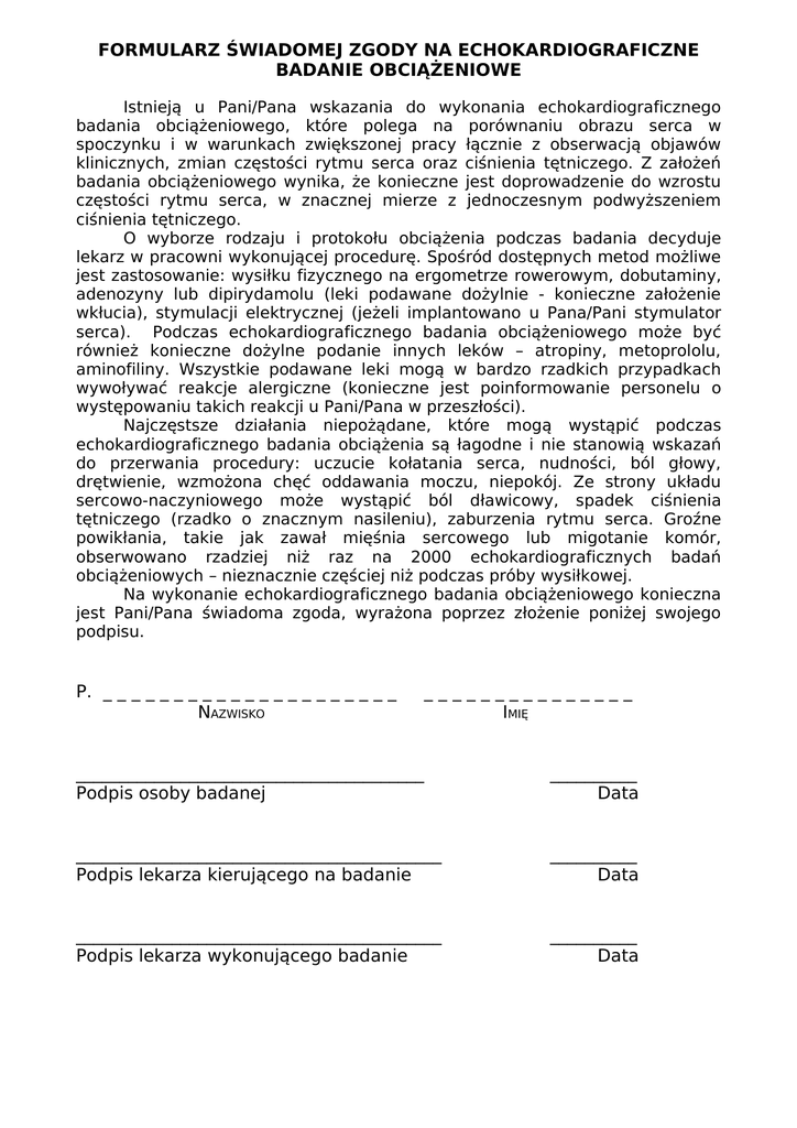 FORMULARZ ŚWIADOMEJ ZGODY NA ECHOKARDIOGRAFICZNE BADANIE OBCIĄŻENIOWE Istnieją u Pani/Pana wskazania do wykonania echokardiograficznego badania obciążeniowego, które polega na porównaniu obrazu serca w spoczynku i w warunkach zwiększonej pracy łącznie z obserwacją objawów klinicznych, zmian częstości rytmu serca oraz ciśnienia tętniczego. Z założeń badania obciążeniowego wynika, że konieczne jest doprowadzenie do wzrostu częstości rytmu serca, w znacznej mierze z jednoczesnym podwyższeniem ciśnienia tętniczego. O wyborze rodzaju i protokołu obciążenia podczas badania decyduje lekarz w pracowni wykonującej procedurę. Spośród dostępnych metod możliwe jest zastosowanie: wysiłku fizycznego na ergometrze rowerowym, dobutaminy, adenozyny lub dipirydamolu (leki podawane dożylnie - konieczne założenie wkłucia), stymulacji elektrycznej (jeżeli implantowano u Pana/Pani stymulator serca). Podczas echokardiograficznego badania obciążeniowego może być również konieczne dożylne podanie innych leków – atropiny, metoprololu, aminofiliny. Wszystkie podawane leki mogą w bardzo rzadkich przypadkach wywoływać reakcje alergiczne (konieczne jest poinformowanie personelu o występowaniu takich reakcji u Pani/Pana w przeszłości). Najczęstsze działania niepożądane, które mogą wystąpić podczas echokardiograficznego badania obciążenia są łagodne i nie stanowią wskazań do przerwania procedury: uczucie kołatania serca, nudności, ból głowy, drętwienie, wzmożona chęć oddawania moczu, niepokój. Ze strony układu sercowo-naczyniowego może wystąpić ból dławicowy, spadek ciśnienia tętniczego (rzadko o znacznym nasileniu), zaburzenia rytmu serca. Groźne powikłania, takie jak zawał mięśnia sercowego lub migotanie komór, obserwowano rzadziej niż raz na 2000 echokardiograficznych badań obciążeniowych – nieznacznie częściej niż podczas próby wysiłkowej. Na wykonanie echokardiograficznego badania obciążeniowego konieczna jest Pani/Pana świadoma zgoda, wyrażona poprzez złożenie poniżej swojego podpisu. P. _ _ _ _ _ _ _ _ _ _ _ _ _ _ _ _ _ _ _ _ _ NAZWISKO _______________ IMIĘ ________________________________________ Podpis osoby badanej __________ Data __________________________________________ Podpis lekarza kierującego na badanie __________ Data __________________________________________ Podpis lekarza wykonującego badanie __________ Data