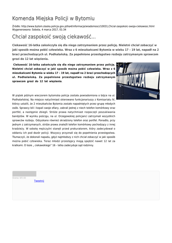 Komenda Miejska Policji w Bytomiu Źródło: http://www.bytom.slaska.policja.gov.pl/ka4/informacje/wiadomosci/10031,Chcial-zaspokoic-swoja-ciekawosc.html Wygenerowano: Sobota, 4 marca 2017, 01:34 Chciał zaspokoić swoją ciekawość... Ciekawość 16-latka zakończyła się dla niego zatrzymaniem przez policję. Nieletni chciał zobaczyć w jaki sposób można pobić człowieka. Wraz z 6 mieszkańcami Bytomia w wieku 17 – 19 lat, napadł na 2 braci przechodzących ul. Podhalańską. Za popełnione przestępstwo rozboju zatrzymanym sprawcom grozi do 12 lat więzienia. Ciekawość 16-latka zakończyła się dla niego zatrzymaniem przez policję. Nieletni chciał zobaczyć w jaki sposób można pobić człowieka. Wraz z 6 mieszkańcami Bytomia w wieku 17 – 19 lat, napadł na 2 braci przechodzących ul. Podhalańską. Za popełnione przestępstwo rozboju zatrzymanym sprawcom grozi do 12 lat więzienia. W piątek późnym wieczorem bytomska policja została powiadomiona o bójce na ul. Podhalańskiej. Na miejsce natychmiast skierowano funkcjonariuszy z Komisariatu IV, którzy ustalili, że 2 mieszkańców Bytomia zostało napadniętych przez grupę młodych osób. Sprawcy bili i kopali swoje ofiary, zabrali jednej z niech telefon komórkowy oraz portfel, a następnie zbiegli. Stróże prawa natychmiast rozpoczęli poszukiwania bandytów. W wyniku pościgu, na ul. Orzegowskiej policjanci zatrzymali wszystkich sprawców rozboju. Odzyskano również skradziony telefon oraz portfel. Ponadto, przy jednym z zatrzymanych, stróże prawa znaleźli telefon komórkowy pochodzący z innej kradzieży. W sobotę mężczyźni stanęli przed prokuratorem, który zadecydował o oddaniu ich pod dozór policji. Wszyscy przyznali się do popełnienia przestępstwa. Tłumaczyli, że dokonali napadu, gdyż najmłodszy z nich chciał zobaczyć w jaki sposób można pobić człowieka. Teraz młodzi przestępcy mogą spędzić nawet 12 lat za kratkami. O losie „ ciekawskiego” 16 - latka zadecyduje sąd rodzinny. Ocena: 0/5 (0) Tweetnij