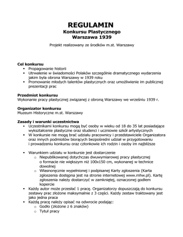 REGULAMIN Konkursu Plastycznego Warszawa 1939 Projekt realizowany ze środków m.st. Warszawy Cel konkursu Propagowanie historii Utrwalenie w świadomości Polaków szczególnie dramatycznego wydarzenia jakim była obrona Warszawy w 1939 roku Promowanie młodych talentów plastycznych oraz umożliwienie im publicznej prezentacji prac Przedmiot konkursu Wykonanie pracy plastycznej związanej z obroną Warszawy we wrześniu 1939 r. Organizator konkursu Muzeum Historyczne m.st. Warszawy Zasady i warunki uczestnictwa Uczestnikami konkursu mogą być osoby w wieku od 18 do 35 lat posiadające wykształcenie plastyczne oraz studenci i uczniowie szkół artystycznych W konkursie nie mogą brać udziału pracownicy i przedstawiciele Organizatora oraz innych podmiotów biorących bezpośredni udział w przygotowaniu i prowadzeniu konkursu oraz członkowie ich rodzin i osoby im najbliższe Warunkiem udziału w konkursie jest dostarczenie o Niepublikowanej dotychczas dwuwymiarowej pracy plastycznej o formacie nie większym niż 100x150 cm, wykonanej w technice dowolnej o Własnoręcznie wypełnionej i podpisanej Karty zgłoszenia (Karta zgłoszenia dostępna jest na stronie internetowej www.mhw.pl). Kartę zgłoszenia należy dostarczyć w zamkniętej, oznaczonej godłem kopercie Każdy autor może przesłać 1 pracę. Organizatorzy dopuszczają do konkursu zestawy prac złożone maksymalnie z 3 części. Każdy zestaw traktowany jest jako jedna praca Każdą pracę należy opisać na odwrocie podając: o Godło (złożone z 6 znaków) o Tytuł pracy Prace nieoprawione należy przesłać lub dostarczyć osobiście na adres: Muzeum Historyczne m.st. Warszawy Rynek Starego Miasta 28 00-272 Warszawa z dopiskiem „Warszawa 1939” Udział w konkursie jest bezpłatny Organizatorzy zastrzegają sobie prawo do bezpłatnego wykorzystania prac w publikacjach związanych z konkursem Konkurs ma charakter dwuetapowy. W pierwszym etapie zostanie wyłonionych 20 najlepszych prac, które zaprezentowane zostaną na wystawie pokonkursowej. W drugim etapie zostanie wyłoniony zwycięzca Zasady i kryteria oceny Prace ocenia Jury złożone z: o Przedstawicieli Organizatorów o Zaproszonych artystów plastyków oraz profesorów wyższych uczelni artystycznych Zadaniem Jury jest: o Kwalifikacja do oceny nadesłanych prac o Ocena nadesłanych prac o Przyznanie nagród Jury może zadecydować o nie przyznaniu żadnej nagrody lub nie przyznaniu I, II i/lub III nagrody. Rozstrzygnięcie Jury konkursowego jest ostateczne i niezaskarżalne Terminarz konkursu 31.07.2009 – termin nadsyłania prac (decyduje data stempla pocztowego) 10.08.2009 – zakończenie pierwszego etapu (wyłonienie 20 najlepszych prac, które zostaną pokazane na wystawie pokonkursowej) 01.09.2009 – zakończenie drugiego etapu konkursu: rozstrzygnięcie konkursu, otwarcie wystawy pokonkursowej i przyznanie nagród Nagrody W konkursie przyznane zostaną nagrody: I nagroda – 10 tys. zł II nagroda – 5 tys. zł III nagroda – 3 tys. zł Jury ma prawo dokonania innego podziału nagród z zachowaniem zasady rozdysponowania całej ich puli, a także do nie przyznania nagrody za dane miejsce Fundatorem nagród jest m.st. Warszawa Nagrody dla laureatów konkursu zostaną wypłacone na wskazane przez nich rachunki bankowe w terminie 7 dni po ogłoszeniu wyników konkursu Inne informacje Prace nagrodzone oraz wybrane przez Jury będą prezentowane na wystawie pokonkursowej. Autorzy wybranych prac zostaną poinformowani o decyzji Jury telefonicznie lub pocztą elektroniczną najpóźniej na 14 dni przed otwarciem wystawy pokonkursowej Organizator zastrzega sobie prawo przerwania, zmiany lub przedłużenia konkursu w razie wystąpienia przyczyn od niego niezależnych Organizatorzy zapewniają staranne traktowanie nadesłanych prac Organizatorzy nie biorą odpowiedzialności za ewentualne uszkodzenia lub zaginięcie prac w trakcie przesyłki. W wypadku stwierdzenia uszkodzenia pracy Organizator niezwłocznie powiadomi autora pracy o zaistniałym fakcie Organizatorzy mają prawo do wyłączenia spod obrad Jury prac niespełniających warunków regulaminu Prace nadesłane nie przechodzą na własność organizatora za wyjątkiem prac nagrodzonych, które trafią do zbiorów muzeum. Pozostałe prace zostaną zwrócone w ciągu miesiąca od otwarcia wystawy pokonkursowej. Odbiór prac osobisty w siedzibie organizatora. Dodatkowe informacje dotyczące odbioru prac pod numerem tel. (022) 531-38-07 oraz na stronie www.mhw.pl Dodatkowe informacje o konkursie można uzyskać na stronie: www.mhw.pl oraz u Sekretarza konkursu p. Moniki Siwińskiej nr tel. (022) 531-38-07 mail [email protected]