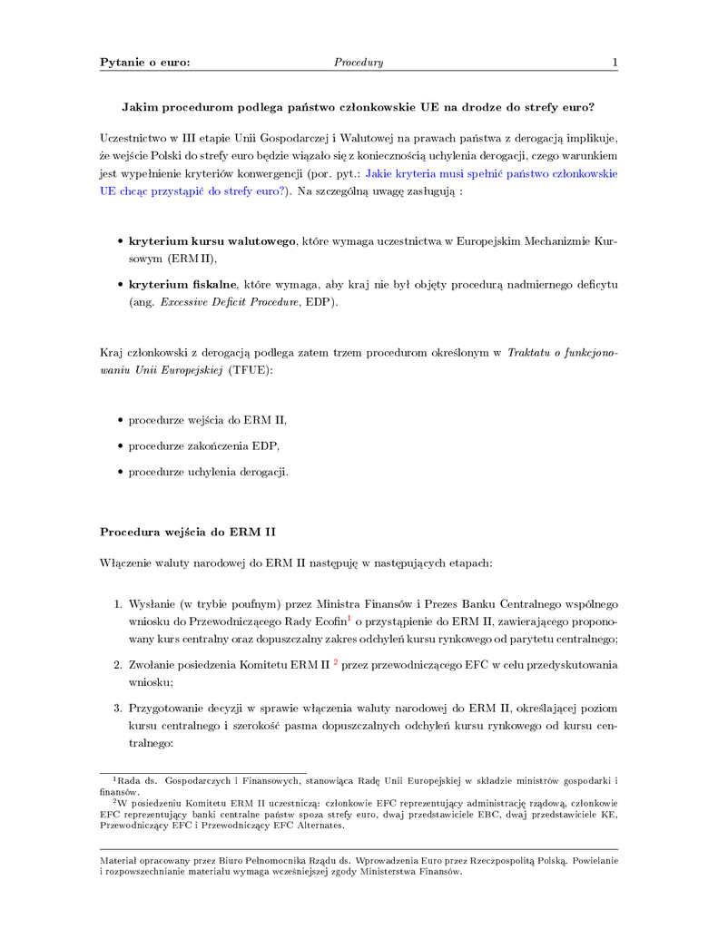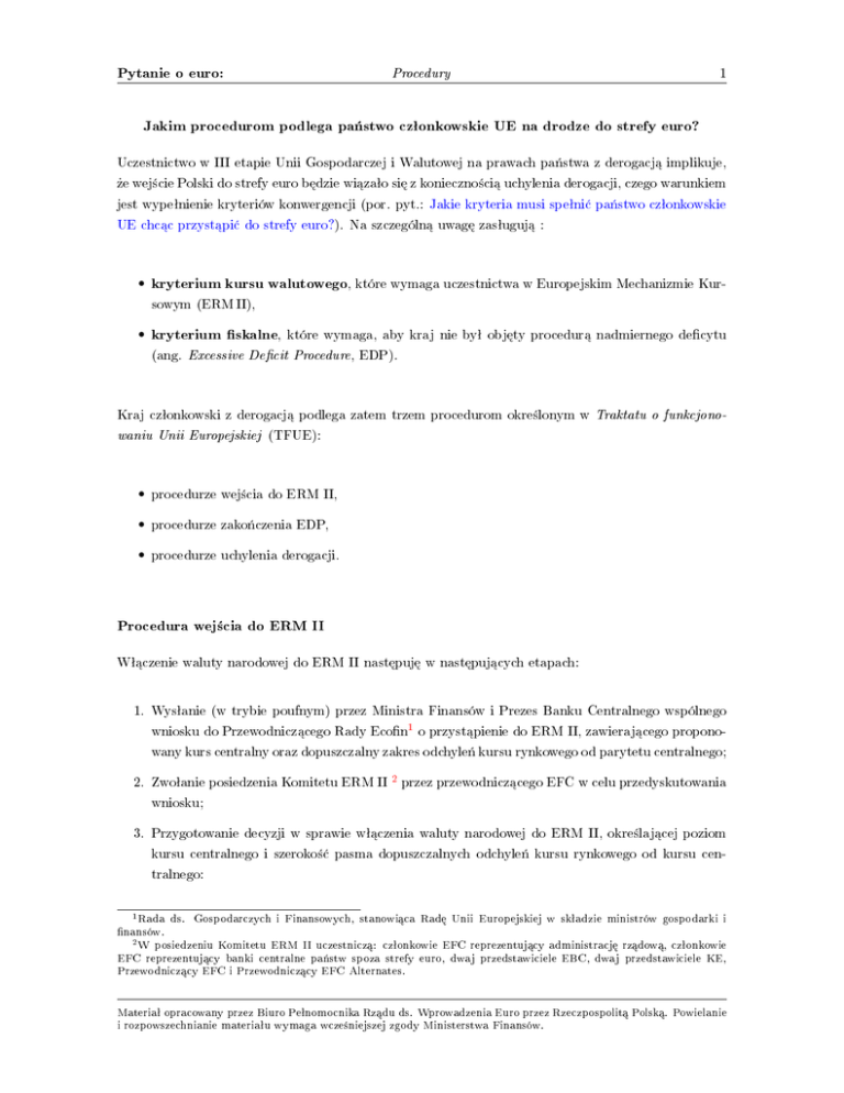 Pytanie o euro: Procedury 1 Jakim procedurom podlega pa«stwo czªonkowskie UE na drodze do strefy euro? Uczestnictwo w III etapie Unii Gospodarczej i Walutowej na prawach pa«stwa z derogacj¡ implikuje, »e wej±cie Polski do strefy euro b¦dzie wi¡zaªo si¦ z konieczno±ci¡ uchylenia derogacji, czego warunkiem jest wypeªnienie kryteriów konwergencji (por. pyt.: Jakie kryteria musi speªni¢ pa«stwo czªonkowskie UE chc¡c przyst¡pi¢ do strefy euro?). Na szczególn¡ uwag¦ zasªuguj¡ : • kryterium kursu walutowego, które wymaga uczestnictwa w Europejskim Mechanizmie Kursowym (ERM II), • kryterium skalne, które wymaga, aby kraj nie byª obj¦ty procedur¡ nadmiernego decytu (ang. Excessive Decit Procedure, EDP). Kraj czªonkowski z derogacj¡ podlega zatem trzem procedurom okre±lonym w Traktatu o funkcjono- waniu Unii Europejskiej (TFUE): • procedurze wej±cia do ERM II, • procedurze zako«czenia EDP, • procedurze uchylenia derogacji. Procedura wej±cia do ERM II Wª¡czenie waluty narodowej do ERM II nast¦puj¦ w nast¦puj¡cych etapach: 1. Wysªanie (w trybie poufnym) przez Ministra Finansów i Prezes Banku Centralnego wspólnego wniosku do Przewodnicz¡cego Rady Econ1 o przyst¡pienie do ERM II, zawieraj¡cego proponowany kurs centralny oraz dopuszczalny zakres odchyle« kursu rynkowego od parytetu centralnego; 2. Zwoªanie posiedzenia Komitetu ERM II 2 przez przewodnicz¡cego EFC w celu przedyskutowania wniosku; 3. Przygotowanie decyzji w sprawie wª¡czenia waluty narodowej do ERM II, okre±laj¡cej poziom kursu centralnego i szeroko±¢ pasma dopuszczalnych odchyle« kursu rynkowego od kursu centralnego: 1 Rada ds. Gospodarczych i Finansowych, stanowi¡ca Rad¦ Unii Europejskiej w skªadzie ministrów gospodarki i nansów. 2 W posiedzeniu Komitetu ERM II uczestnicz¡: czªonkowie EFC reprezentuj¡cy administracj¦ rz¡dow¡, czªonkowie EFC reprezentuj¡cy banki centralne pa«stw spoza strefy euro, dwaj przedstawiciele EBC, dwaj przedstawiciele KE, Przewodnicz¡cy EFC i Przewodnicz¡cy EFC Alternates. Materiaª opracowany przez Biuro Peªnomocnika Rz¡du ds. Wprowadzenia Euro przez Rzeczpospolit¡ Polsk¡. Powielanie i rozpowszechnianie materiaªu wymaga wcze±niejszej zgody Ministerstwa Finansów. Pytanie o euro: Procedury 2 (a) przez Komitet ERM II - je±li udaªo si¦ osi¡gn¡¢ porozumienie w sprawie poziomu kursu centralnego oraz szeroko±ci pasma dopuszczalnych odchyle« kursu rynkowego od kursu centralnego, (b) przez uczestników Posiedzenia w sprawie ERM II3 - je±li w trakcie posiedzenia Komitetu ERM II nie udaªo si¦ osi¡gn¡¢ porozumienia w sprawie poziomu kursu centralnego i/lub szeroko±ci pasma dopuszczalnych odchyle« kursu rynkowego od kursu centralnego; 4. Publikacja Komunikatu (Communiqué ) w przypadku uzyskania ww. porozumienia zawieraj¡cego informacje nt.: strony inicjuj¡cej procedur¦, stron podejmuj¡cych decyzj¦, kursu centralnego 4 i szeroko±ci dopuszczalnych odchyle« od kursu centralnego oraz o±wiadczenie dotycz¡ce polityki gospodarczej. Nale»y zwróci¢ uwag¦, »e wszystkie etapy procedury, poczynaj¡c od wysªania aplikacji do momentu wydania Komunikatu, s¡ obj¦te klauzul¡ niejawno±ci. Rysunek 1: Wej±cie do ERM II procedura decyzyjna w instytucjach europejskich wysłanie wspólnego wniosku MF i NBP do Przewodniczącego Rady Ecofin 2 dni brak porozumienia zwołanie Komitetu ERM II zwołanie Posiedzenia w sprawie ERM II pozytywna decyzja Publikacja Komunikatu pozytywna decyzja ródªo: opracowanie wªasne. Procedura zako«czenia EDP Na mocy art. 126 Traktatu o funkcjonowaniu Unii Europejskiej oraz Protokoªu w sprawie procedury dotycz¡cej nadmiernego decytu zako«czenie procedury nadmiernego decytu nast¦puje w omówionych poni»ej etapach: 3 Posiedzenie obraduje pod przewodnictwem Przewodnicz¡cego Rady Econ w skªadzie ministrów nansów krajów strefy euro, ministrów nansów i prezesów banków centralnych krajów czªonkowskich spoza strefy euro, Prezesa EBC, dwóch czªonków Komisji Europejskiej oraz Przewodnicz¡cego i Sekretarza EFC. 4 W formacie liczba jednostek waluty narodowej za jedno euro, z dokªadno±ci¡ do sze±ciu cyfr znacz¡cych. Materiaª opracowany przez Biuro Peªnomocnika Rz¡du ds. Wprowadzenia Euro przez Rzeczpospolit¡ Polsk¡. Powielanie i rozpowszechnianie materiaªu wymaga wcze±niejszej zgody Ministerstwa Finansów. Pytanie o euro: Procedury 3 1. Przedªo»enie przez pa«stwo czªonkowskie Programu konwergencji lub Notykacji skalnej, wskazuj¡cej na wypeªnienie skalnego kryterium konwergencji; 2. Wniosek KE do Rady Econ w sprawie zako«czenia EDP; 3. Decyzja Rady Econ (podejmowana kwalikowan¡ wi¦kszo±ci¡ gªosów) o zako«czeniu EDP. 2 miesi ce Rysunek 2: Procedura zako«czenia EDP ą wniosek KE w sprawie zakończenia EDP art. 126(13) TFUE zakończenie EDP przez Radę Ecofin art. 126(12) TFUE ródªo: opracowanie wªasne. Procedura uchylenia derogacji Uchylenie derogacji nast¦puje w nast¦puj¡cych etapach: 1. Przygotowanie przez KE i EBC niezale»nych Raportów o konwergencji : (a) w roku parzystym EBC i KE przygotowuj¡ je z wªasnej inicjatywy (na mocy TFUE), (b) w roku nieparzystym nale»y przedªo»y¢ wniosek o ich przygotowanie; 2. Przygotowanie przez KE wniosku do Rady Econ w sprawie uchylenia derogacji; 3. Konsultacje z: (a) Parlamentem Europejskim, (b) Rad¡ Europejsk¡, Materiaª opracowany przez Biuro Peªnomocnika Rz¡du ds. Wprowadzenia Euro przez Rzeczpospolit¡ Polsk¡. Powielanie i rozpowszechnianie materiaªu wymaga wcze±niejszej zgody Ministerstwa Finansów. Pytanie o euro: Procedury 4 (c) Eurogrup¡5 ; 4. Decyzja Rady Econ (podejmowana kwalikowan¡ wi¦kszo±ci¡ gªosów) w sprawie uchylenia derogacji. Rysunek 3: Przyj¦cie euro w Polsce procedura decyzyjna w instytucjach europejskich spełnienie kryteriów konwergencji art. 140 TFUE przygotowanie przez KE i EBC Raportów o konwergencji art. 140(1) TFUE wniosek KE w sprawie uchylenia derogacji art. 140(1