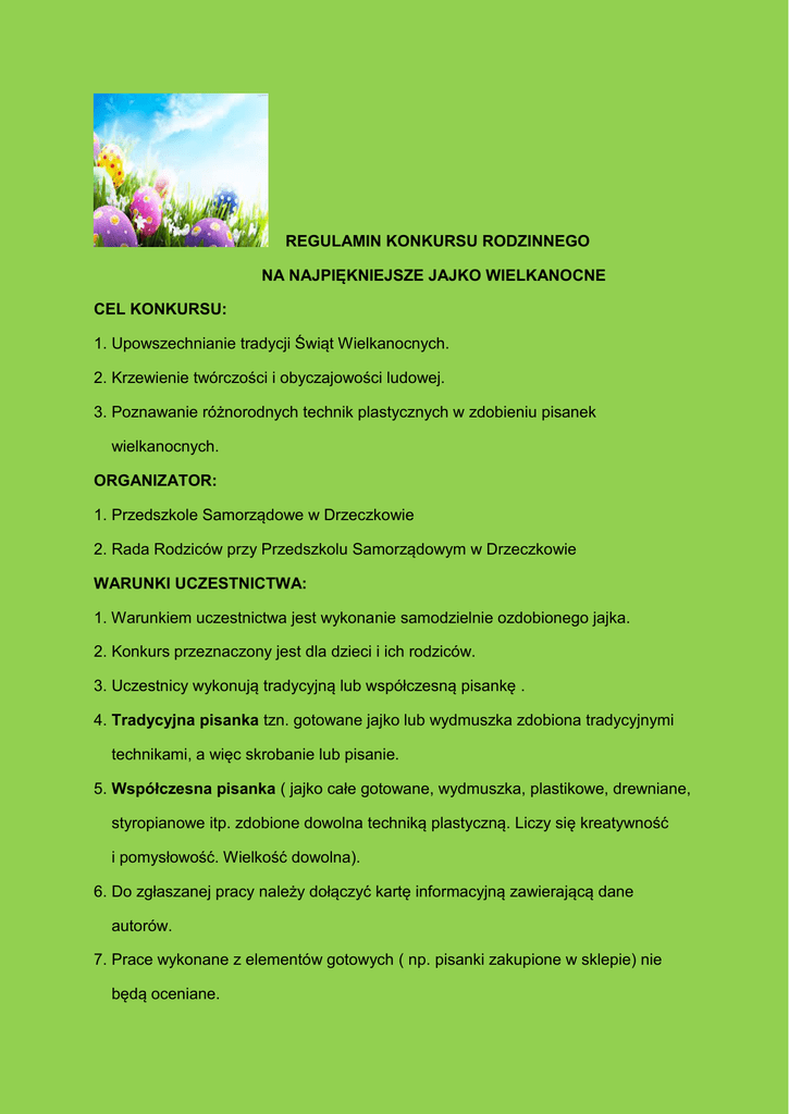 REGULAMIN KONKURSU RODZINNEGO NA NAJPIĘKNIEJSZE JAJKO WIELKANOCNE CEL KONKURSU: 1. Upowszechnianie tradycji Świąt Wielkanocnych. 2. Krzewienie twórczości i obyczajowości ludowej. 3. Poznawanie różnorodnych technik plastycznych w zdobieniu pisanek wielkanocnych. ORGANIZATOR: 1. Przedszkole Samorządowe w Drzeczkowie 2. Rada Rodziców przy Przedszkolu Samorządowym w Drzeczkowie WARUNKI UCZESTNICTWA: 1. Warunkiem uczestnictwa jest wykonanie samodzielnie ozdobionego jajka. 2. Konkurs przeznaczony jest dla dzieci i ich rodziców. 3. Uczestnicy wykonują tradycyjną lub współczesną pisankę . 4. Tradycyjna pisanka tzn. gotowane jajko lub wydmuszka zdobiona tradycyjnymi technikami, a więc skrobanie lub pisanie. 5. Współczesna pisanka ( jajko całe gotowane, wydmuszka, plastikowe, drewniane, styropianowe itp. zdobione dowolna techniką plastyczną. Liczy się kreatywność i pomysłowość. Wielkość dowolna). 6. Do zgłaszanej pracy należy dołączyć kartę informacyjną zawierającą dane autorów. 7. Prace wykonane z elementów gotowych ( np. pisanki zakupione w sklepie) nie będą oceniane. 8. Prace konkursowe przechodzą na własność organizatorów. 9. Oceny prac dokona komisja konkursowa powołana przez organizatorów. 10. Decyzje komisji są ostateczne. 11. Prawo interpretacji niniejszego regulaminu przysługuje organizatorom. 12. Wyniki konkursu zostaną zamieszczone na stronie internetowej Przedszkola Samorządowego w Drzeczkowie. 13. Dla autorów najlepszych 3 prac przewiduje się nagrody, wszyscy uczestnicy otrzymają pamiątkowe dyplomy. 14. Prace należy dostarczyć do przedszkola w nieprzekraczalnym terminie do dnia 4 kwietnia 2014 roku. Podsumowanie konkursu i wręczenie nagród nastąpi 16 kwietnia 2014 roku (środa) w Przedszkolu Samorządowym w Drzeczkowie podczas odwiedzin Zajączka. Nagrodzone osoby otrzymają zaproszenie na uroczystość.