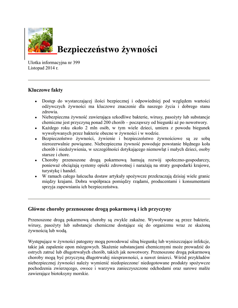 Bezpieczeństwo żywności Ulotka informacyjna nr 399 Listopad 2014 r. Kluczowe fakty Dostęp do wystarczającej ilości bezpiecznej i odpowiedniej pod względem wartości odżywczych żywności ma kluczowe znaczenie dla naszego życia i dobrego stanu zdrowia. Niebezpieczna żywność zawierająca szkodliwe bakterie, wirusy, pasożyty lub substancje chemiczne jest przyczyną ponad 200 chorób – począwszy od biegunki aż po nowotwory. Każdego roku około 2 mln osób, w tym wiele dzieci, umiera z powodu biegunek wywoływanych przez bakterie obecne w żywności i w wodzie. Bezpieczeństwo żywności, żywienie i bezpieczeństwo żywnościowe są ze sobą nierozerwalnie powiązane. Niebezpieczna żywność powoduje powstanie błędnego koła chorób i niedożywienia, w szczególności dotykającego niemowląt i małych dzieci, osoby starsze i chore. Choroby przenoszone drogą pokarmową hamują rozwój społeczno-gospodarczy, ponieważ obciążają systemy opieki zdrowotnej i narażają na straty gospodarki krajowe, turystykę i handel. W ramach całego łańcucha dostaw artykuły spożywcze przekraczają dzisiaj wiele granic między krajami. Dobra współpraca pomiędzy rządami, producentami i konsumentami sprzyja zapewnianiu ich bezpieczeństwa. Główne choroby przenoszone drogą pokarmową i ich przyczyny Przenoszone drogą pokarmową choroby są zwykle zakaźne. Wywoływane są przez bakterie, wirusy, pasożyty lub substancje chemiczne dostające się do organizmu wraz ze skażoną żywnością lub wodą. Występujące w żywności patogeny mogą powodować silną biegunkę lub wyniszczające infekcje, takie jak zapalenie opon mózgowych. Skażenie substancjami chemicznymi może prowadzić do ostrych zatruć lub długotrwałych chorób, takich jak nowotwory. Przenoszone drogą pokarmową choroby mogą być przyczyną długotrwałej niesprawności, a nawet śmierci. Wśród przykładów niebezpiecznej żywności należy wymienić niedopieczone/ niedogotowane produkty spożywcze pochodzenia zwierzęcego, owoce i warzywa zanieczyszczone odchodami oraz surowe małże zawierające biotoksyny morskie. Bakterie Salmonella, Campylobacter i enterokrwotoczny szczep Escherichia coli to jedne z najczęściej spotykanych patogenów obecnych w żywności, które każdego roku wywołują u milionów ludzi choroby i zakażenia, czasami o bardzo ciężkim przebiegu a nawet kończące się zgonem. Występujące objawy to gorączka, ból głowy, nudności, wymioty, bóle brzucha i biegunka. Do żywności mogącej być powodem wybuchu epidemii salmonellozy należą jaja, drób i inne produkty pochodzenia zwierzęcego. Przyczyną chorób wywoływanych bakterią Campylobacter jest głównie spożycie surowego mleka, surowego lub niedopieczonego/niedogotowanego drobiu i zanieczyszczonej wody pitnej. Źródłem zakażenia enterokrwotocznym szczepem Escherichia coli jest niepasteryzowane mleko, niedopieczone/niedogotowane mięso oraz świeże owoce i warzywa. Zakażenie bakteriami Listeria może być przyczyną poronień u kobiet i zgonów noworodków. Chociaż wywoływana nimi choroba występuje stosunkowo rzadko, z uwagi na poważne, a czasami śmiertelne skutki, szczególnie w przypadku niemowląt, dzieci i osób starszych, bakterie Listeria uznawane są za powodujące jedne z najcięższych zakażeń pokarmowych. Bakterie Listeria występują w niepasteryzowanych produktach mlecznych i różnych daniach gotowych do spożycia. Rozwijają się także w warunkach chłodniczych. Bakterie Vibrio cholerae dostają się do organizmu człowieka wraz z zanieczyszczoną wodą lub żywnością. Do występujących objawów należą bóle brzucha, wymioty i silna wodnista biegunka, która może prowadzić do ciężkiego odwodnienia, a nawet śmierci. Wybuchy epidemii cholery łączone są ze spożyciem ryżu, warzyw, kleiku jaglanego i różnych rodzajów owoców morza. Kluczową rolę w leczeniu zakażeń bakteryjnych odgrywają leki przeciwbakteryjne , takie jak antybiotyki. Jednak ich nadużywanie i niewłaściwe stosowanie w leczeniu zwierząt i ludzi doprowadziło do rozwoju i rozprzestrzeniania się opornych bakterii, które sprawiają, że leczenie chorób zakaźnych jest nieskuteczne. Oporne bakterie trafiają do łańcucha żywnościowego za pośrednictwem zwierząt (np. bakterie Salmonella za pośrednictwem kurczaków). Lekooporność mikroorganizmów to jedno z głównych zagrożeń dla współczesnej medycyny. Wirusy Zakażeniom norowirusami towarzyszą nudności, chlustające wymioty, wodnista biegunka i bóle brzucha. Wirus zapalenia wątroby typu A może powodować długotrwałą chorobę wątroby. Zwykle rozprzestrzenia się za pośrednictwem surowych lub niedogotowanych owoców morza i skażonych surowych produktów. Źródłem skażenia produktów spożywczych jest często zainfekowany personel pracujący przy tej żywności. Pasożyty Niektóre pasożyty, takie jak przywry występujące w organizmach ryb, trafiają do organizmu człowieka wyłącznie po spożyciu skażonej żywności. Inne, np. Echinococcus spp, mogą dostawać się tam za pośrednictwem żywności lub w wyniku bezpośredniego kontaktu ze zwierzętami. Jeszcze inne, takie jak Ascaris, Cryptosporidium, Entamoeba histolytica i Giardia, trafiają do łańcucha żywnościowego za pośrednictwem wody i mogą powodować skażenie świeżych produktów. Priony Priony, czynniki zakaźne zbudowane z białka, powodują niektóre choroby neurodegeneracyjne. Gąbczasta encefalopatia bydła (BSE, choroba szalonych krów) to atakująca zwierzęta choroba prionowa uznawana za odpowiedzialną za wywoływanie wariantu choroby Creutzfeldta-Jakoba (vCJD) u ludzi. Najbardziej prawdopodobną drogą dostawania się prionów do organizmu człowieka jest spożycie produktów z wołowiny zawierających tkanki stanowiące szczególne zagrożenie (np. tkankę mózgu). Substancje chemiczne Największe zagrożenie dla zdrowia stanowią naturalnie występują