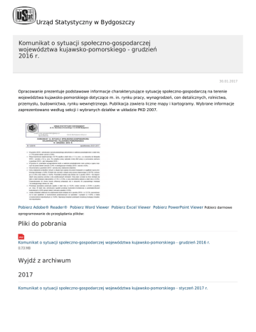 Urząd Statystyczny w Bydgoszczy Komunikat o sytuacji społeczno-gospodarczej województwa kujawsko-pomorskiego - grudzień 2016 r. 30.01.2017 Opracowanie prezentuje podstawowe informacje charakteryzujące sytuację społeczno-gospodarczą na terenie województwa kujawsko-pomorskiego dotyczące m. in. rynku pracy, wynagrodzeń, cen detalicznych, rolnictwa, przemysłu, budownictwa, rynku wewnętrznego. Publikacja zawiera liczne mapy i kartogramy. Wybrane informacje zaprezentowano według sekcji i wybranych działów w układzie PKD 2007. Pobierz Adobe® Reader® Pobierz Word Viewer Pobierz Excel Viewer Pobierz PowerPoint Viewer Pobierz darmowe oprogramowanie do przeglądania plików: Pliki do pobrania Komunikat o sytuacji społeczno-gospodarczej województwa kujawsko-pomorskiego - grudzień 2016 r. 0.73 MB Wyjdź z archiwum 2017 Komunikat o sytuacji społeczno-gospodarczej województwa kujawsko-pomorskiego - styczeń 2017 r. 2016 Komunikat o sytuacji społeczno-gospodarczej województwa kujawsko-pomorskiego - grudzień 2016 r. Komunikat o sytuacji społeczno-gospodarczej województwa kujawsko-pomorskiego - listopad 2016 r. Komunikat o sytuacji społeczno-gospodarczej województwa kujawsko-pomorskiego - październik 2016 r. Komunikat o sytuacji społeczno-gospodarczej województwa kujawsko-pomorskiego - wrzesień 2016 r. Komunikat o sytuacji społeczno-gospodarczej województwa kujawsko-pomorskiego - sierpień 2016 r. 0.80 MB Komunikat o sytuacji społeczno-gospodarczej województwa kujawsko-pomorskiego - lipiec 2016 r. 0.76 MB Komunikat o sytuacji społeczno-gospodarczej województwa kujawsko-pomorskiego - czerwiec 2016 r. 0.82 MB Komunikat o sytuacji społeczno-gospodarczej województwa kujawsko-pomorskiego - maj 2016 r. 0.83 MB Komunikat o sytuacji społeczno-gospodarczej województwa kujawsko-pomorskiego - kwiecień 2016 r. 0.95 MB Komunikat o sytuacji społeczno-gospodarczej województwa kujawsko-pomorskiego - marzec 2016 r. 0.77 MB Komunikat o sytuacji społeczno-gospodarczej województwa kujawsko-pomorskiego - luty 2016 r. 0.77 MB Komunikat o sytuacji społeczno-gospodarczej województwa kujawsko-pomorskiego - styczeń 2016 r. 0.77 MB 2015 Komunikat o sytuacji społeczno-gospodarczej województwa kujawsko-pomorskiego - grudzień 2015 r. 0.82 MB Komunikat o sytuacji społeczno-gospodarczej województwa kujawsko-pomorskiego - listopad 2015 r. 0.76 MB Komunikat o sytuacji społeczno-gospodarczej województwa kujawsko-pomorskiego - październik 2015 r. 0.87 MB Komunikat o sytuacji społeczno-gospodarczej województwa kujawsko-pomorskiego - wrzesień 2015 r. 0.84 MB Komunikat o sytuacji społeczno-gospodarczej województwa kujawsko-pomorskiego - sierpień 2015 r. 0.88 MB Komunikat o sytuacji społeczno-gospodarczej województwa kujawsko-pomorskiego - lipiec 2015 r. 0.82 MB Komunikat o sytuacji społeczno-gospodarczej województwa kujawsko-pomorskiego - czerwiec 2015 r. 0.82 MB Komunikat o sytuacji społeczno-gospodarczej województwa kujawsko-pomorskiego - maj 2015 r. 0.74 MB Komunikat o sytuacji społeczno-gospodarczej województwa kujawsko-pomorskiego - kwiecień 2015 r. 0.79 MB Komunikat o sytuacji społeczno-gospodarczej województwa kujawsko-pomorskiego - marzec 2015 r. 0.75 MB Komunikat o sytuacji społeczno-gospodarczej województwa kujawsko-pomorskiego - luty 2015 r. 0.55 MB Komunikat o sytuacji społeczno-gospodarczej województwa kujawsko-pomorskiego - styczeń 2015 r. 0.76 MB 2014 Komunikat o sytuacji społeczno-gospodarczej województwa kujawsko-pomorskiego - grudzień 2014 r. 0.47 MB Komunikat o sytuacji społeczno-gospodarczej województwa kujawsko-pomorskiego - listopad 2014 r. 0.49 MB Komunikat o sytuacji społeczno-gospodarczej województwa kujawsko-pomorskiego - październik 2014 r. 0.84 MB Komunikat o sytuacji społeczno-gospodarczej województwa kujawsko-pomorskiego - wrzesień 2014 0.78 MB Komunikat o sytuacji społeczno-gospodarczej województwa kujawsko-pomorskiego - sierpień 2014 r. 0.78 MB Komunikat o sytuacji społeczno-gospodarczej województwa kujawsko-pomorskiego - lipiec 2014 r. 0.85 MB Komunikat o sytuacji społeczno-gospodarczej województwa kujawsko-pomorskiego - czerwiec 2014 r. 0.42 MB Komunikat o sytuacji społeczno-gospodarczej województwa kujawsko-pomorskiego - maj 2014 r. 0.55 MB Komunikat o sytuacji społeczno-gospodarczej województwa kujawsko-pomorskiego - kwiecień 2014 r. 0.48 MB Komunikat o sytuacji społeczno-gospodarczej województwa kujawsko-pomorskiego - marzec 2014 r. 0.38 MB Komunikat o sytuacji społeczno-gospodarczej województwa kujawsko-pomorskiego - luty 2014 r. 0.48 MB Komunikat o sytuacji społeczno-gospodarczej województwa kujawsko-pomorskiego - styczeń 2014 r. 0.46 MB 2013 Komunikat o sytuacji społeczno-gospodarczej województwa kujawsko-pomorskiego (styczeń - grudzień 2013) 8.73 MB 2012 Komunikat o sytuacji społeczno-gospodarczej województwa kujawsko-pomorskiego (styczeń - grudzień 2012) 8.50 MB 2011 Komunikat o sytuacji społeczno-gospodarczej województwa kujawsko-pomorskiego (styczeń - grudzień 2011) 8.94 MB 2010 Komunikat o sytuacji społeczno-gospodarczej województwa kujawsko-pomorskiego (styczeń - grudzień 2010) 7.70 MB 2009 Komunikat o sytuacji społeczno-gospodarczej województwa kujawsko-pomorskiego (styczeń - grudzień 2009) 14.09 MB 2008 Komunikat o sytuacji społeczno-gospodarczej województwa kujawsko-pomorskiego (styczeń - grudzień 2008) 12.87 MB 2007 Komunikat o sytuacji społeczno-gospodarczej województwa kujawsko-pomorskiego (styczeń - grudzień 2007) 7.77 MB 2006 Komunikat o sytuacji społeczno-gospodarczej województwa kujawsko-pomorskiego (styczeń - grudzień 2006) 6.47 MB 2005 Komunikat o sytuacji społeczno-gospodarczej województwa kujawsko-pomorskiego (styczeń - grudzień 2005) 7.15 MB 2004 Komunikat o sytuacji społeczno-gospodarczej województwa kujawsko-pomorskiego (styczeń - grudzień 2004) 4.09 MB
