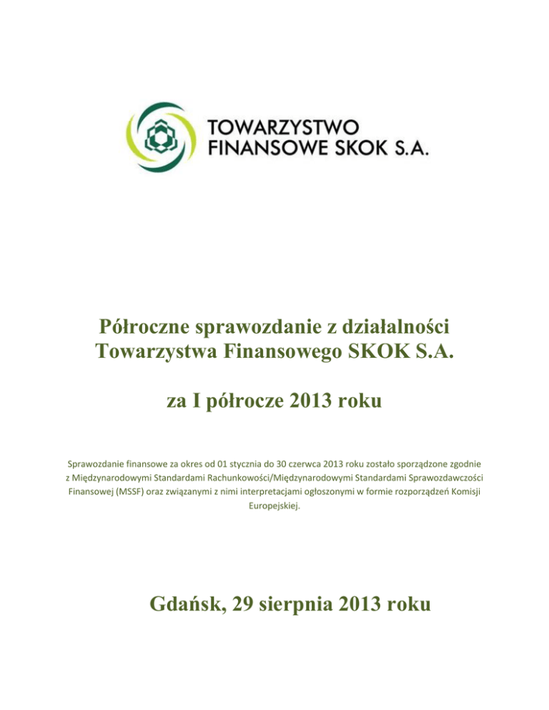 Półroczne sprawozdanie z działalności Towarzystwa Finansowego SKOK S.A. za I półrocze 2013 roku Sprawozdanie finansowe za okres od 01 stycznia do 30 czerwca 2013 roku zostało sporządzone zgodnie z Międzynarodowymi Standardami Rachunkowości/Międzynarodowymi Standardami Sprawozdawczości Finansowej (MSSF) oraz związanymi z nimi interpretacjami ogłoszonymi w formie rozporządzeń Komisji Europejskiej. Gdańsk, 29 sierpnia 2013 roku Podstawowe informacje o Spółce Nazwa (firma): Towarzystwo Finansowe Spółdzielczych Kas OszczędnościowoKredytowych Spółka Akcyjna Siedziba: Gdańsk Adres: ul. Arkońska 11, 80-387 Gdańsk Telefon: (+48 58) 511 20 00 Fax: (+48 58) 511 20 01 Poczta elektroniczna: [email protected] Strona internetowa: www.tfskok.pl Rada Nadzorcza Na dzień przekazania raportu skład Rady Nadzorczej przedstawia się następująco: 1. Grzegorz Michał Bierecki – Przewodniczący Rady Nadzorczej, 2. Grzegorz Paweł Buczkowski – Wiceprzewodniczący Rady Nadzorczej, 3. Andrzej Sosnowski – Sekretarz Rady Nadzorczej, 4. Jarosław Szymon Bierecki – Członek Rady Nadzorczej 5. Andrzej Paweł Szumański – Członek Rady Nadzorczej. W dniu 24 kwietnia 2013 roku, Zarząd Spółki otrzymał rezygnację Pani Moniki Bentkowskiej, pełniącej funkcję Członka Rady Nadzorczej, z członkostwa w Radzie Nadzorczej Spółki, ze skutkiem na dzień odbycia najbliższego Walnego Zgromadzenia Spółki, tj. 21 maja 2013 roku. Przyczyną rezygnacji były względy osobiste (RB 9/2013 z dnia 25 kwietnia 2013 roku). W dniu 21 maja 2013 r. Nadzwyczajne Walne Zgromadzenie Spółki powołało na Członka Rady Nadzorczej Towarzystwa Finansowego SKOK S.A. Pana Jarosława Szymona Biereckiego (RB 12/2013 z dnia 21 maja 2013 roku). Zarząd W I półroczu 2013 roku skład Zarządu nie uległ zmianie. Na dzień sporządzenia raportu skład Zarządu przedstawiał się następująco: Ewa Bereśniewicz-Kozłowska – Prezes Zarządu, Cezary Godziuk – Członek Zarządu, Marcin Golas – Członek Zarządu, Alicja Kuran-Kawka – Członek Zarządu, Tomasz Krasiński – Członek Zarządu. 2 1. Opis organizacji grupy kapitałowej, ze wskazaniem jednostek podlegających konsolidacji, a w przypadku Emitenta będącego jednostką dominującą, który na podstawie obowiązujących go przepisów nie ma obowiązku lub może nie sporządzać skonsolidowanych sprawozdań finansowych również wskazanie przyczyny i podstawy prawnej braku konsolidacji. Spółka nie tworzy grupy kapitałowej. 2. Wskazanie skutków zmian w strukturze jednostki gospodarczej, w tym w wyniku połączenia jednostek gospodarczych, przejęcia lub sprzedaży jednostek grupy kapitałowej, inwestycji długoterminowych, podziału, restrukturyzacji i zaniechania działalności. Nie wystąpiły zmiany w strukturze Spółki. 3. Stanowisko Zarządu odnośnie możliwości zrealizowania wcześniej publikowanych prognoz wyników na dany rok, w świetle wyników zaprezentowanych w raporcie półrocznym w stosunku do wyników prognozowanych. Emitent nie publikował prognoz na 2013 rok. 4. Wskazanie akcjonariuszy posiadających bezpośrednio lub pośrednio przez podmioty zależne, co najmniej 5% ogólnej liczby głosów na Walnym Zgromadzeniu na dzień przekazania raportu półrocznego, wraz ze wskazaniem liczby posiadanych przez te podmioty akcji, ich procentowego udziału w kapitale zakładowym, liczby głosów z nich wynikających i ich procentowego udziału w ogólnej liczbie głosów na Walnym Zgromadzeniu oraz wskazanie zmian w strukturze własności znacznych pakietów akcji w okresie od przekazania ostatniego raportu okresowego. SKOK Holding S.a.r.l. Stan na 14.05.2013* dzień Zmiana Stan na 29.08.2013** dzień Liczba akcji Udział w kapitale zakładowym Liczba głosów na walnym zgromadzeniu Udział w ogólnej liczbie głosów na walnym zgromadzeniu 61.428.048 32,06% 61.428.048 62,81% - - - - 61.428.048 32,06% 61.428.048 62,81% * wg danych z raportu za I kwartał 2013 roku opublikowanego 14 maja 2013 roku ** wg oświadczenia z dnia 24 lipca 2013 roku 3 SKOK im. Franciszka Stefczyka Liczba akcji Udział w kapitale zakładowym Liczba głosów na walnym zgromadzeniu Udział w ogólnej liczbie głosów na walnym zgromadzeniu Stan na 14.05.2013* 125.312.878 65,40% 31.500.000 32,21% - - - - 125.312.878 65,40% 31.500.000 32,21% dzień Zmiana Stan na 29.08.2013** dzień * wg danych z raportu za I kwartał 2013 roku opublikowanego 14 maja 2013 roku ** wg oświadczenia z dnia 22 sierpnia 2013 roku 5. Zestawienie stanu posiadania akcji Spółki lub uprawnień do nich przez osoby zarządzające i nadzorujące Spółkę na dzień przekazania raportu półrocznego wraz ze wskazaniem zmian w stanie posiadania, w okresie od przekazania ostatniego raportu okresowego, odrębnie dla każdej z osób. Liczba akcji będąca w posiadaniu członków Zarządu oraz członków Rady Nadzorczej: Akcjonariusz Zmiana w okresie 14.0529.08.2013 Liczba akcji Udział w kapitale zakładowym Liczba głosów na walnym zgromadzeniu Udział w ogólnej liczbie głosów na walnym zgromadzeniu Alicja Kuran-Kawka brak 4 545 0,002% 4 545 0,005% 4 545 0,002% 4 545 0,005% było 206 420 0,109% 206 420 0,215% jest 137 420 0,072% 137 420 0,141% było 184 448 0,100% 184 448 0,190% jest 124 448 0,065% 124 448 0,127% 75 000 0,078% Członek Zarządu Marcin Golas brak Członek Zarządu Grzegorz Bierecki Przewodniczący Rady Nadzorczej Grzegorz Buczkowski Wiceprzewodniczący Rady Nadzorczej Andrzej Sosnowski było Sekretarz Rady Nadzorczej jest 75 000 0 0,039% 0% 0 0% 4 6. Wskazanie postępowań toczących się przed sądem, organem właściwym dla postępowania arbitrażowego lub organem administracji publicznej. Emitent nie jest stroną żadnego postępowania lub postępowań toczących się przed sądem, organem właściwym dla postępowania arbitrażowego lub organem administracji publicznej, których wartość jednostkowa bądź łączna stanowi co najmniej 10% kapitałów własnych Spó