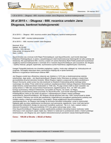 U N Utworzono : 04 marzec 2017 a k > 20 zł 2015 r. - Długosz - 600. rocznica urodzin Jana Długosza, banknot kolekcjonerski y t a 20 zł 2015 r. - Długosz - 600. rocznica urodzin Jana Długosza, banknot kolekcjonerski m z i m u 20 zł 2015 r. - Długosz - 600. rocznica urodzin Jana Długosza, banknot kolekcjonerski Producent : NBP - monety kolekcjonerskie 20 zł 2015 r. - 600. rocznica urodzin Jana Długosza Nominał: 20 zł Nakład: do 30.000 Wymiary: 138 x 69 mm Data emisji: 24 sierpnia 2015 Stan: I (UNC) N a "Annales seu cronicae incliti Regni Poloniae" czyli "Roczniki, czyli kroniki sławnego Królestwa Polskiego" to jedno z jawybitniejszych dzieł średniowiecznej historiografii nie tylko polskiej ale światowej. Dla upamiętnienia 600. rocznicy urodzin ich autora Narodowy Bank Polski postanowił wyemitować wyjątkowy banknot kolekcjonerski o nominale 20 zł. Autorem "Kronik" jest oczywiście Jan Długosz - wybitny historyk, geograf, dyplomata, wychowawca synów Kazimierza Jagiellończyka i duchowny. Uwaga! Fotografia banknotu ma charakter poglądowy i ogólny, może więc odbiegać np. kolorystycznie od oryginału. Szczegóły dotyczące stanu zachowania znajdują się w opisie banknotu. Banknot w oryginalnym kartonowym blistrze NBP. Jan Długosz urodził się w Brzeźnicy (obecnie woj. łódzkie) w 1415 roku w średniozamożnej rodzinie szlacheckiej. Jego ojciec - Jan "senior" Długosz herbu Wieniawa za zasługi w czasie bitwy grunwaldzkiej otrzymał starostwo brzeskie. Młody Długosz najpierw uczęszczał do szkoły parafialnej w Nowym Korczynie, potem przez trzy lata studiował na Akademii Krakowskiej jednak żadnego tytułu naukowego nie zdobył. Przez wiele lat był zaufanym współpracownikiem biskupa Zbigniewa Oleśnickiego dzięki któremu został kanonikiem krakowskim w 1436 roku. Po jego śmierci trafił na dwór wawelski i do samej śmierci w 1480 roku służył królowi Kazimierzowi Jagiellończykowi. M.in. od 1467 roku pełnił funkcję wychowawcy młodych królewiczów, był posłem do Rzymu, do Czech, na Węgry. Największą ponadczasową sławę przyniosły mu "Roczniki, czyli kroniki sławnego Królestwa Polskiego" które po dzś dzień są jednym z najważniejszych źródeł o historii polskiego średniowiecza. "Kroniki" Jan Długosz zaczął spisywać koło roku 1455 i kontynuował to dzieło aż do śmierci. Pierwszy tom kronik jest opowieścią o legendarnych początkach państwowości polskiej oraz źródłem wiedzy o dawnych wierzeniach i obyczajach. Swoją wyjątkowość "Kroniki" zawdzięczają temu, że Długosz miał dostęp do archiwów kancelarii królewskiej i umiał to wykorzystać. Najlepiej ujęte są czasy współczesne kronikarzowi czyli panowanie Jagiellonów. Autor miał tutaj oprócz dokumentów królewskich dostęp do naocznych świadków wydzrzeń. Tak m.in. było z opisem wojny z Zakonem Krzyżackim i bitwy grunwaldzkiej 1410 roku gdzie walczył jego ojciec i stryj. Choć "Kroniki" Długosza zostały współcześnie poddane naturalnej krytyce naukowej i wiele informacji w nich zawartych często mijało się z faktami to nadal jest to podstawowe dzieło o historii polskiego średniowiecza. Jan Długosz był, jest i będzie niekwestionowanym pionierem naszej historiografii. Cena : 109,00 zł Brutto ( 88,62 zł Netto) Dostępność: Produkt dostępny w naszym sklepie od 11 wrzesień 2014 kontakt : - [email protected] Strona 1/{nb} Model : -