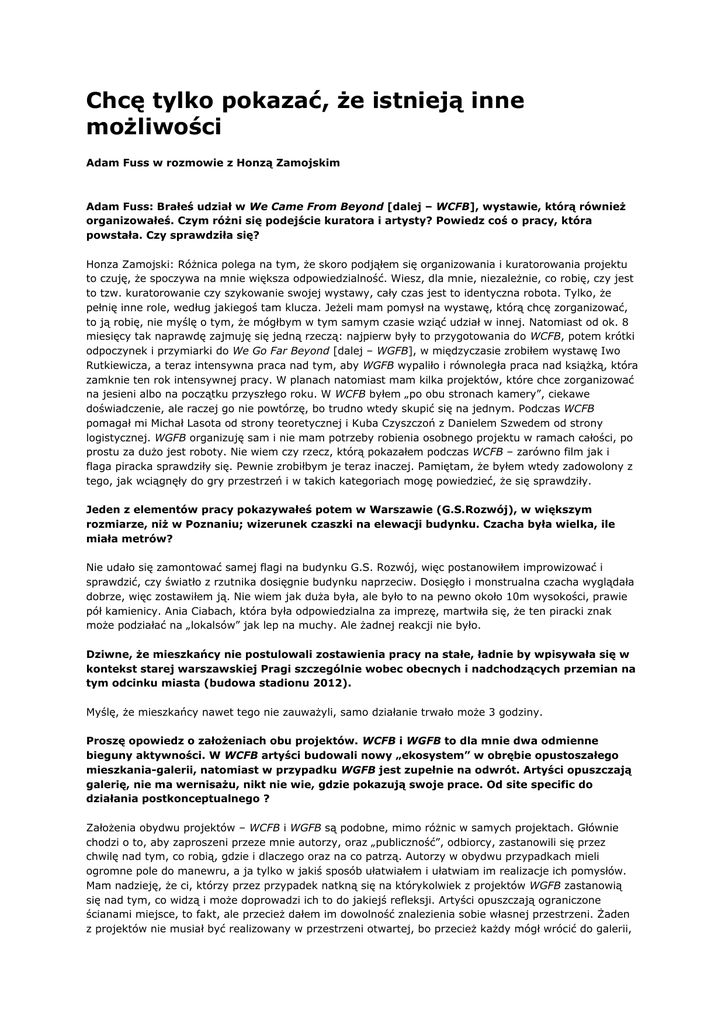 Chcę tylko pokazać, że istnieją inne możliwości Adam Fuss w rozmowie z Honzą Zamojskim Adam Fuss: Brałeś udział w We Came From Beyond [dalej – WCFB], wystawie, którą również organizowałeś. Czym różni się podejście kuratora i artysty? Powiedz coś o pracy, która powstała. Czy sprawdziła się? Honza Zamojski: Różnica polega na tym, że skoro podjąłem się organizowania i kuratorowania projektu to czuję, że spoczywa na mnie większa odpowiedzialność. Wiesz, dla mnie, niezależnie, co robię, czy jest to tzw. kuratorowanie czy szykowanie swojej wystawy, cały czas jest to identyczna robota. Tylko, że pełnię inne role, według jakiegoś tam klucza. Jeżeli mam pomysł na wystawę, którą chcę zorganizować, to ją robię, nie myślę o tym, że mógłbym w tym samym czasie wziąć udział w innej. Natomiast od ok. 8 miesięcy tak naprawdę zajmuję się jedną rzeczą: najpierw były to przygotowania do WCFB, potem krótki odpoczynek i przymiarki do We Go Far Beyond [dalej – WGFB], w międzyczasie zrobiłem wystawę Iwo Rutkiewicza, a teraz intensywna praca nad tym, aby WGFB wypaliło i równoległa praca nad książką, która zamknie ten rok intensywnej pracy. W planach natomiast mam kilka projektów, które chce zorganizować na jesieni albo na początku przyszłego roku. W WCFB byłem „po obu stronach kamery”, ciekawe doświadczenie, ale raczej go nie powtórzę, bo trudno wtedy skupić się na jednym. Podczas WCFB pomagał mi Michał Lasota od strony teoretycznej i Kuba Czyszczoń z Danielem Szwedem od strony logistycznej. WGFB organizuję sam i nie mam potrzeby robienia osobnego projektu w ramach całości, po prostu za dużo jest roboty. Nie wiem czy rzecz, którą pokazałem podczas WCFB – zarówno film jak i flaga piracka sprawdziły się. Pewnie zrobiłbym je teraz inaczej. Pamiętam, że byłem wtedy zadowolony z tego, jak wciągnęły do gry przestrzeń i w takich kategoriach mogę powiedzieć, że się sprawdziły. Jeden z elementów pracy pokazywałeś potem w Warszawie (G.S.Rozwój), w większym rozmiarze, niż w Poznaniu; wizerunek czaszki na elewacji budynku. Czacha była wielka, ile miała metrów? Nie udało się zamontować samej flagi na budynku G.S. Rozwój, więc postanowiłem improwizować i sprawdzić, czy światło z rzutnika dosięgnie budynku naprzeciw. Dosięgło i monstrualna czacha wyglądała dobrze, więc zostawiłem ją. Nie wiem jak duża była, ale było to na pewno około 10m wysokości, prawie pół kamienicy. Ania Ciabach, która była odpowiedzialna za imprezę, martwiła się, że ten piracki znak może podziałać na „lokalsów” jak lep na muchy. Ale żadnej reakcji nie było. Dziwne, że mieszkańcy nie postulowali zostawienia pracy na stałe, ładnie by wpisywała się w kontekst starej warszawskiej Pragi szczególnie wobec obecnych i nadchodzących przemian na tym odcinku miasta (budowa stadionu 2012). Myślę, że mieszkańcy nawet tego nie zauważyli, samo działanie trwało może 3 godziny. Proszę opowiedz o założeniach obu projektów. WCFB i WGFB to dla mnie dwa odmienne bieguny aktywności. W WCFB artyści budowali nowy „ekosystem” w obrębie opustoszałego mieszkania-galerii, natomiast w przypadku WGFB jest zupełnie na odwrót. Artyści opuszczają galerię, nie ma wernisażu, nikt nie wie, gdzie pokazują swoje prace. Od site specific do działania postkonceptualnego ? Założenia obydwu projektów – WCFB i WGFB są podobne, mimo różnic w samych projektach. Głównie chodzi o to, aby zaproszeni przeze mnie autorzy, oraz „publiczność”, odbiorcy, zastanowili się przez chwilę nad tym, co robią, gdzie i dlaczego oraz na co patrzą. Autorzy w obydwu przypadkach mieli ogromne pole do manewru, a ja tylko w jakiś sposób ułatwiałem i ułatwiam im realizacje ich pomysłów. Mam nadzieję, że ci, którzy przez przypadek natkną się na którykolwiek z projektów WGFB zastanowią się nad tym, co widzą i może doprowadzi ich to do jakiejś refleksji. Artyści opuszczają ograniczone ścianami miejsce, to fakt, ale przecież dałem im dowolność znalezienia sobie własnej przestrzeni. Żaden z projektów nie musiał być realizowany w przestrzeni otwartej, bo przecież każdy mógł wrócić do galerii, o ile miałoby to sens i uzasadnianie. Nikt tak nie zrobił, widocznie każdy ma poczucie, że czasem fajnie coś zrobić poza – beyond. W przypadku WCFB, które odbywało się w mieszkaniu zajmowanym na stałe przez Galerię Starter, również nie było przymusu, aby się ograniczyć do tego mieszkania, bo przecież było podwórko, była klatka schodowa. Projekt Pawła Kowzana wyszedł poza mury kamienicy, tak samo zrobiłem ja, ze wspomnianą wcześniej piracką flagą. Z WGFB miałem pomysł, aby odwrócić sytuację, aby tym razem wymusić na autorach znalezienie własnej przestrzeni. I to się w jakiś sposób sprawdziło. WCFB jak i WGFB są o odczytywaniu miejsc, o pisaniu ich na nowo, o kreatywnym ich zagospodarowaniu, więc nie są to aż tak odmienne projekty, po prostu dzieją się w innych miejscach i czasie. Przestrzeń publiczna jest ostatnio często aktywizowana, nie tylko w Polsce. Czemu tak się dzieje? Działania takie opisuje się zazwyczaj w podobny sposób – skromne ingerencje rozbijają albo starają się rozbić fasady Art worldu działaniami dywersyjnymi, często o politycznym zabarwieniu. Nie mam pojęcia. Nie zastanawiałem się nad tym, bo dla mnie to nie miało nigdy znaczenia. Galerie czy muzea też są przestrzenią publiczną, tylko że zazwyczaj nikt się nie zastanawia nad regułami i zasadami, które je tworzą. Nie wydaje mi się, żeby przestrzeń publiczna, przestrzeń otwarta została jakoś specjalnie aktywizowana w ostatnim czasie. Bardzo możliwe, że takie działania są aktualnie bardziej zauważane, albo lepiej dokumentowane, to też może mieć wpływ na ich odbiór. Chociaż jak się zastanowić, to działania w przestrzeni są 