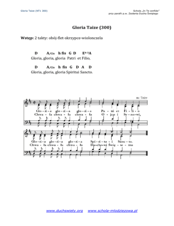 Gloria Taize (NT1 300) Schola „In Te confido” przy parafii p.w. Zesłania Ducha Świętego Gloria Taize (300) Wstęp: 2 takty: obój-flet-skrzypce-wiolonczela D A/Cis h fis G D E4-3A Gloria, gloria, gloria Patri et Filio, D A/Cis h fis G D A D Gloria, gloria, gloria Spiritui Sancto. www.duchswiety.org www.schola-mlodziezowa.pl