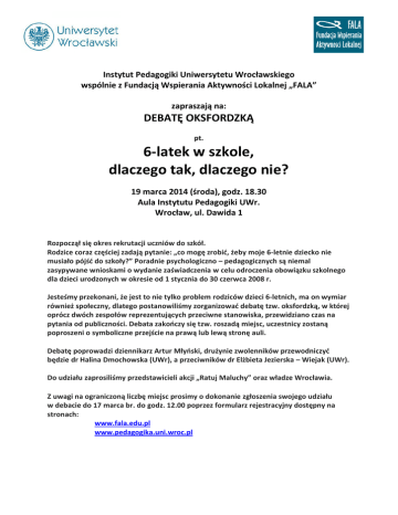 Instytut Pedagogiki Uniwersytetu Wrocławskiego wspólnie z Fundacją Wspierania Aktywności Lokalnej „FALA” zapraszają na: DEBATĘ OKSFORDZKĄ pt. 6-latek w szkole, dlaczego tak, dlaczego nie? 19 marca 2014 (środa), godz. 18.30 Aula Instytutu Pedagogiki UWr. Wrocław, ul. Dawida 1 Rozpoczął się okres rekrutacji uczniów do szkół. Rodzice coraz częściej zadają pytanie: „co mogę zrobid, żeby moje 6-letnie dziecko nie musiało pójśd do szkoły?” Poradnie psychologiczno – pedagogicznych są niemal zasypywane wnioskami o wydanie zaświadczenia w celu odroczenia obowiązku szkolnego dla dzieci urodzonych w okresie od 1 stycznia do 30 czerwca 2008 r. Jesteśmy przekonani, że jest to nie tylko problem rodziców dzieci 6-letnich, ma on wymiar również społeczny, dlatego postanowiliśmy zorganizowad debatę tzw. oksfordzką, w której oprócz dwóch zespołów reprezentujących przeciwne stanowiska, przewidziano czas na pytania od publiczności. Debata zakooczy się tzw. roszadą miejsc, uczestnicy zostaną poproszeni o symboliczne przejście na prawą lub lewą stronę auli. Debatę poprowadzi dziennikarz Artur Młyoski, drużynie zwolenników przewodniczyd będzie dr Halina Dmochowska (UWr), a przeciwników dr Elżbieta Jezierska – Wiejak (UWr). Do udziału zaprosiliśmy przedstawicieli akcji „Ratuj Maluchy” oraz władze Wrocławia. Z uwagi na ograniczoną liczbę miejsc prosimy o dokonanie zgłoszenia swojego udziału w debacie do 17 marca br. do godz. 12.00 poprzez formularz rejestracyjny dostępny na stronach: www.fala.edu.pl www.pedagogika.uni.wroc.pl
