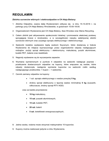REGULAMIN Zbiórka surowców wtórnych i elektroodpadów w CH Aleja Bielany: 1. Zbiórka Odpadów, zwana dalej Wydarzeniem odbywa się w dniu 15.10.2016 r. na parkingu przy CH Aleja Bielany Wrocławskie, w godzinach 10:00-18:00. 2. Organizatorami Wydarzenia jest CH Aleja Bielany, Ikea Wrocław oraz Stena Recycling. 3. Celem zbiórki jest aktywowanie społeczności lokalnej i promowanie właściwej postawy sprzyjającej trosce o środowisko, a w szczególności nawyku selektywnej zbiórki surowców wtórnych oraz zużytego sprzętu elektrycznego i elektronicznego. 4. Sadzonki kwiatów wydawane będą osobom fizycznym, które dostarczą w trakcie Wydarzenia do miejsca wyznaczonego przez organizatorów odpady następujących rodzajów: zużyty sprzęt elektryczny i elektroniczny, makulaturę, puszki aluminiowe, butelki PET, baterie oraz świetlówki. 5. Nagrody wydawane są do wyczerpania zapasów. 6. Wymiana wymienionych w punkcie 4 odpadów na sadzonki następuje poprzez : przeliczenie dostarczonych odpadów na kupony, które wręczane są osobie, która odpady dostarczyła, następnie wymianie kuponów na sadzonki roślin według następującego przelicznika: 1 kupon – 1 sadzonka. 7. Cennik zamiany odpadów na kupony: 1 szt. sprzętu elektrycznego o wadze powyżej 5 kg, drobny sprzęt elektryczny o łącznej wadze minimalnej 5 kg (suszarki, odkurzacze, drobny sprzęt RTV AGD) oraz za każde przyniesione: 10 kg makulatury, 15 szt. puszek aluminiowych, 15 szt. butelek PET, 20 szt. baterii 5 szt. świetlówek energooszczędnych, 8. Jedna osoba, rodzina może otrzymać maksymalnie 10 kuponów. 9. Kupony można realizować jedynie w dniu Wydarzenia. 10. W sytuacji pojawienia się wątpliwości dotyczących pochodzenia odpadów (w szczególności odpadów przemysłowych), Organizator ma prawo odmówić przyjęcia odpadów. 11. W przypadku dostarczenia odpadów niewymienionych w punkcie 4, Organizator ma prawo odmówić ich przyjęcia. Jeżeli jednak zdecyduje iż dany odpad może zostać przyjęty, Organizator nie ma obowiązku wydania kuponu. 12. Kupony nie będą wydawane osobom: - znajdującym się pod widocznym wpływem alkoholu lub innych środków odurzających, - zachowującym się agresywnie, prowokacyjnie lub w inny sposób stwarzającym zagrożenie bezpieczeństwa. 13. Otrzymane kupony nie podlegają niewymienioną w Regulaminie. wymianie na wartość pieniężną lub inną 14. W tym dniu na terenie sklepu przygotowane zostały dodatkowe atrakcje dla dzieci (pokazy, konkursy ekologiczne), podczas których dziecko nie może pozostać bez opieki rodzica lub innego opiekuna. 15. Organizator zastrzega sobie prawo do wprowadzenia zmian w Regulaminie, niezawierających jednak wpisów mniej korzystnych dla uczestników Wydarzenia. Organizatorzy: