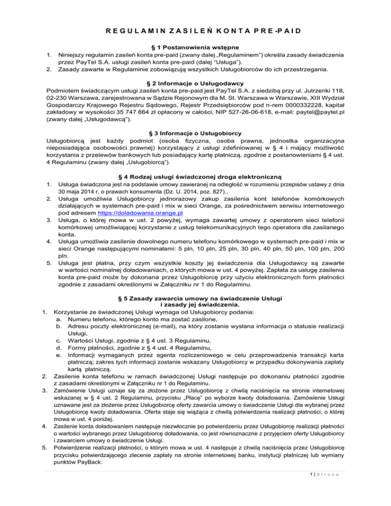 R E G U L A M I N Z A S I L E Ń K O N T A P R E -P A I D 1. 2. § 1 Postanowienia wstępne Niniejszy regulamin zasileń konta pre-paid (zwany dalej „Regulaminem”) określa zasady świadczenia przez PayTel S.A. usługi zasileń konta pre-paid (dalej “Usługa”). Zasady zawarte w Regulaminie zobowiązują wszystkich Usługobiorców do ich przestrzegania. § 2 Informacje o Usługodawcy Podmiotem świadczącym usługi zasileń konta pre-paid jest PayTel S.A. z siedzibą przy ul. Jutrzenki 118, 02-230 Warszawa, zarejestrowana w Sądzie Rejonowym dla M. St. Warszawa w Warszawie, XIII Wydział Gospodarczy Krajowego Rejestru Sądowego, Rejestr Przedsiębiorców pod n-rem 0000332228, kapitał zakładowy w wysokości 35 747 664 zł opłacony w całości, NIP 527-26-06-618, e-mail: [email protected] (zwany dalej „Usługodawcą”). § 3 Informacje o Usługobiorcy Usługobiorcą jest każdy podmiot (osoba fizyczna, osoba prawna, jednostka organizacyjna nieposiadająca osobowości prawnej) korzystający z usługi zdefiniowanej w § 4 i mający możliwość korzystania z przelewów bankowych lub posiadający kartę płatniczą, zgodnie z postanowieniami § 4 ust. 4 Regulaminu (zwany dalej „Usługobiorcą”). 1. 2. 3. 4. 5. 1. 2. 3. 4. 5. § 4 Rodzaj usługi świadczonej droga elektroniczną Usługa świadczona jest na podstawie umowy zawieranej na odległość w rozumieniu przepisów ustawy z dnia 30 maja 2014 r. o prawach konsumenta (Dz. U. 2014, poz. 827).. Usługa umożliwia Usługobiorcy jednorazowy zakup zasilenia kont telefonów komórkowych działających w systemach pre-paid i mix w sieci Orange, za pośrednictwem serwisu internetowego pod adresem https://doladowania.orange.pl Usługa, o której mowa w ust. 2 powyżej, wymaga zawartej umowy z operatorem sieci telefonii komórkowej umożliwiającej korzystanie z usług telekomunikacyjnych tego operatora dla zasilanego konta. Usługa umożliwia zasilenie dowolnego numeru telefonu komórkowego w systemach pre-paid i mix w sieci Orange następującymi nominałami: 5 pln, 10 pln, 25 pln, 30 pln, 40 pln, 50 pln, 100 pln, 200 pln. Usługa jest płatna, przy czym wszystkie koszty jej świadczenia dla Usługodawcy są zawarte w wartości nominalnej doładowaniach, o których mowa w ust. 4 powyżej. Zapłata za usługę zasilenia konta pre-paid może by dokonana przez Usługobiorcę przy użyciu elektronicznych form płatności zgodnie z zasadami określonymi w Załączniku nr 1 do Regulaminu. § 5 Zasady zawarcia umowy na świadczenie Usługi i zasady jej świadczenia. Korzystanie ze świadczonej Usługi wymaga od Usługobiorcy podania: a. Numeru telefonu, którego konto ma zostać zasilone, b. Adresu poczty elektronicznej (e-mail), na który zostanie wysłana informacja o statusie realizacji Usługi, c. Wartości Usługi, zgodnie z § 4 ust. 3 Regulaminu, d. Formy płatności, zgodnie z § 4 ust. 4 Regulaminu, e. Informacji wymaganych przez agenta rozliczeniowego w celu przeprowadzenia transakcji karta płatniczą; zakres tych informacji zostanie wskazany Usługobiorcy w przypadku dokonywania zapłaty kartą płatniczą. Zasilenie konta telefonu w ramach świadczonej Usługi następuje po dokonaniu płatności zgodnie z zasadami określonymi w Załączniku nr 1 do Regulaminu. Zamówienie Usługi uznaje się za złożone przez Usługobiorcę z chwilą naciśnięcia na stronie internetowej wskazanej w § 4 ust. 2 Regulaminu, przycisku „Płacę” po wyborze kwoty doładowania. Zamówienie Usługi uznawane jest za złożenie przez Usługobiorcę oferty zawarcia umowy o świadczenie Usługi dla wybranej przez Usługobiorcę kwoty doładowania. Oferta staje się wiążąca z chwilą potwierdzenia realizacji płatności, o której mowa w ust. 4 poniżej. Zasilenie konta doładowaniem następuje niezwłocznie po potwierdzeniu przez Usługobiorcę realizacji płatności o wartości wybranego przez Usługobiorcę doładowania, co jest równoznaczne z przyjęciem oferty Usługobiorcy i zawarciem umowy o świadczenie Usługi. Potwierdzenie realizacji płatności, o którym mowa w ust. 4 następuje z chwilą naciśnięcia przez Usługobiorcę przycisku potwierdzającego zlecenie zapłaty na stronie internetowej banku, instytucji płatniczej lub wymiany punktów PayBack. 1|Strona 6. 7. 8. 9. Po potwierdzeniu realizacji płatności przez Usługobiorcę, Usługobiorca niezwłocznie otrzyma na podany adres poczty elektronicznej informację o warunkach realizacji Usługi oraz informację o statusie realizacji Usługi wraz z identyfikatorem transakcji. Usługobiorcy będącemu konsumentem nie przysługuje prawo do odstąpienia od umowy, o której mowa w ust. 4 powyżej, ze względu na charakter Usługi, która zostaje w pełni wykonana na żądanie takiego konsumenta przed upływem terminów przewidzianych przepisami prawa na realizację prawa odstąpienia. Umowa o świadczenie Usługi zawierana jest na czas określony konieczny do jej wykonania oraz wykonywania innych obowiązków wynikających z Regulaminu lub przepisów prawa, a związanych z zawartą umową. Usługobiorca, w odpowiednim polu w formularzu przeznaczonym do korzystania z Usługi, może wyrazić zgodę na otrzymywanie informacji handlowych w rozumieniu ustawy, o której mowa w § 4 ust. 1 Regulaminu, w szczególności dotyczących Usługi, informacji związanych z usługami świadczonymi przez Usługodawcę jak również informacji na temat promocji, konkursów oraz innych działań komercyjnych prowadzonych przez Usługodawcę. Informacje te mogą być dostarczone w następujący sposób: a. Na adres poczty elektronicznej Usługobiorcy udostępniony Usługodawcy dla celów realizacji Usługi. b. Na numer telefonu komórkowego Usługobiorcy udostępnionego Usługodawcy dla celów realizacji Usługi. Zgoda może być cofnięta poprzez wysłanie na adres mailowy [email protected] wiadomości o temacie „Wycofanie zgody na otrzymywanie informacji handlowych” ze wskazaniem adresu mailoweg