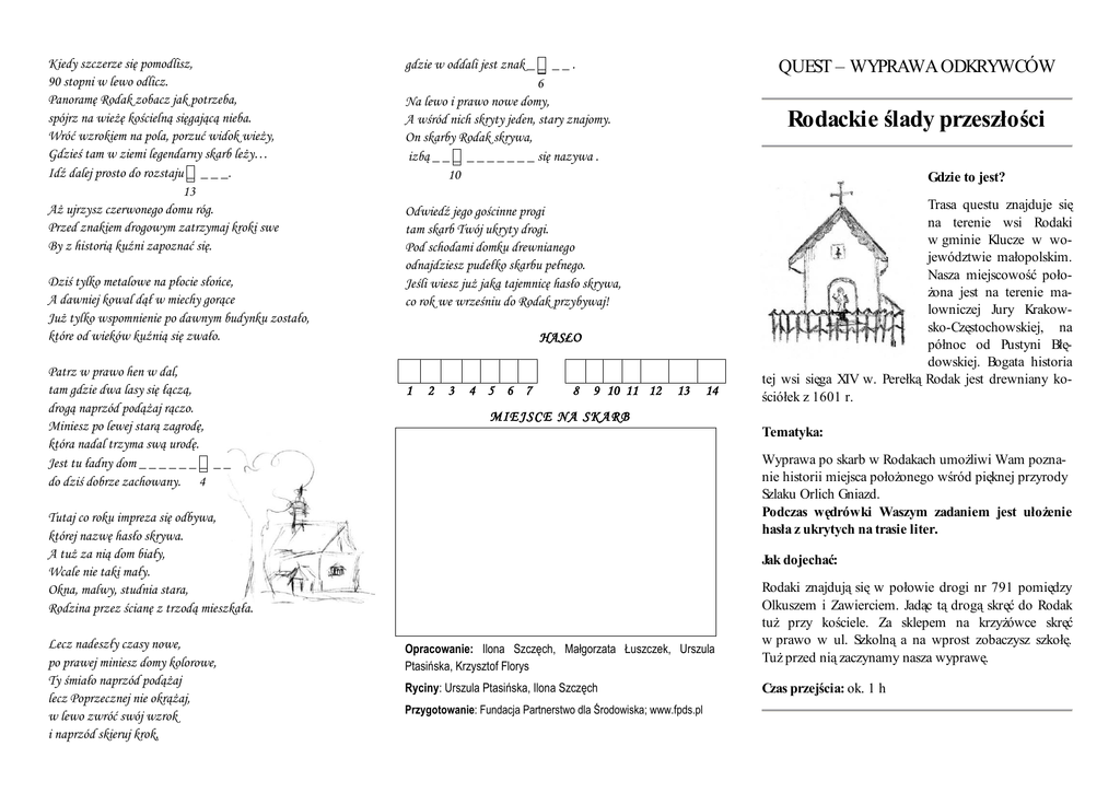 Kiedy szczerze się pomodlisz, 90 stopni w lewo odlicz. Panoramę Rodak zobacz jak potrzeba, spójrz na wieżę kościelną sięgającą nieba. Wróć wzrokiem na pola, porzuć widok wieży, Gdzieś tam w ziemi legendarny skarb leży… Idź dalej prosto do rozstaju _ _ _ _. 13 Aż ujrzysz czerwonego domu róg. Przed znakiem drogowym zatrzymaj kroki swe By z historią kuźni zapoznać się. Dziś tylko metalowe na płocie słońce, A dawniej kowal dął w miechy gorące Już tylko wspomnienie po dawnym budynku zostało, które od wieków kuźnią się zwało. Patrz w prawo hen w dal, tam gdzie dwa lasy się łączą, drogą naprzód podążaj rączo. Miniesz po lewej starą zagrodę, która nadal trzyma swą urodę. Jest tu ładny dom _ _ _ _ _ _ _ _ _ do dziś dobrze zachowany. 4 QUEST – WYPRAWA ODKRYWCÓW gdzie w oddali jest znak _ _ _ _ . 6 Na lewo i prawo nowe domy, A wśród nich skryty jeden, stary znajomy. On skarby Rodak skrywa, izbą _ _ _ _ _ _ _ _ _ _ się nazywa . 10 Rodackie ślady przeszłości Gdzie to jest? Odwiedź jego gościnne progi tam skarb Twój ukryty drogi. Pod schodami domku drewnianego odnajdziesz pudełko skarbu pełnego. Jeśli wiesz już jaką tajemnicę hasło skrywa, co rok we wrześniu do Rodak przybywaj! HASŁO 1 2 3 4 5 6 7 8 9 10 11 12 13 14 MIEJSCE NA SKARB Tematyka: Wyprawa po skarb w Rodakach umożliwi Wam poznanie historii miejsca położonego wśród pięknej przyrody Szlaku Orlich Gniazd. Podczas wędrówki Waszym zadaniem jest ułożenie hasła z ukrytych na trasie liter. Tutaj co roku impreza się odbywa, której nazwę hasło skrywa. A tuż za nią dom biały, Wcale nie taki mały. Okna, malwy, studnia stara, Rodzina przez ścianę z trzodą mieszkała. Lecz nadeszły czasy nowe, po prawej miniesz domy kolorowe, Ty śmiało naprzód podążaj lecz Poprzecznej nie okrążaj, w lewo zwróć swój wzrok i naprzód skieruj krok, Trasa questu znajduje się na terenie wsi Rodaki w gminie Klucze w województwie małopolskim. Nasza miejscowość położona jest na terenie malowniczej Jury Krakowsko-Częstochowskiej, na północ od Pustyni Błędowskiej. Bogata historia tej wsi sięga XIV w. Perełką Rodak jest drewniany kościółek z 1601 r. Jak dojechać: Opracowanie: Ilona Szczęch, Małgorzata Łuszczek, Urszula Ptasińska, Krzysztof Florys Ryciny: Urszula Ptasińska, Ilona Szczęch Przygotowanie: Fundacja Partnerstwo dla Środowiska; www.fpds.pl Rodaki znajdują się w połowie drogi nr 791 pomiędzy Olkuszem i Zawierciem. Jadąc tą drogą skręć do Rodak tuż przy kościele. Za sklepem na krzyżówce skręć w prawo w ul. Szkolną a na wprost zobaczysz szkołę. Tuż przed nią zaczynamy nasza wyprawę. Czas przejścia: ok. 1 h Każde małe dziecko wie, że do szkoły chodzi się, więc my naszą podroż z tego miejsca zacząć chcemy i do skarbu drogę wskazujemy. Przy szkole piękne _ _ _ _ _ _ _ nas witają, 3 14 I na trasę questu wszystkich zapraszają. Gdy wpiszesz już literkę, stań tyłem do szkoły, a teraz w prawą stronę podążaj wesoły. Na wysokim drzewie znajdź gniazdo bocianie, Tam latem ptasia rodzina ćwiczy klekotanie. Idź dalej przed siebie, szukaj muru z kamienia. Za nim w starej zagrodzie czeka czar wspomnienia. To domek pięknymi malwami obsadzany. Pierwszy na trasie budynek drewniany. Mijasz chatę drewnianą po sąsiedzku z kościółkiem zbudowaną. Jeszcze tylko kilka kroków i już widzisz krzyż z boku. Wejdź śmiało na placyk mały, Tam kiedyś kurczaki gdakały. Zobaczysz tu inne ciekawe przeszłości ślady: korbową studnię skąd wodę czerpały nasze dziady, oborę z kamienia murowaną, gdzie krówki trzymano, a pachnące sianko dla nich w _ _ _ _ _ _ _ składano. 12 7 Gdy wyjdziesz z zagrody w lewo się kieruj, a później główną drogą do przystanku steruj. Za nim idź prosto, rondo i kapliczkę mijając, dojdziesz do świątyni na samochody zważając! Przeczytaj, z którego jest roku, wytęż wzrok jak sokół, aż zobaczysz cokół. Na nim fundator jest zapisany, Jego nazwisko wpisz, kochany. (_ _ _ _ _ _ ) 11 Przed nami kościół otwiera swe wrota, to siedemnastowieczna robota. Nad kościołem wieżyczka góruje, Święty Marek jej patronuje. Frontem do drogi kapliczka się uśmiecha cenna dla mieszkańców, na turystów czeka. Nad nią na nas dwa okienka zerkają, Wpisz po ile szybek mają? (_ _ _ _ _ _ ) 2 Za lipą się chowa drewniana dzwonnica, jej dostojność turystów zachwyca. A przed lipą tablica stoi, Zapiszcie mili moi „_ _ _ _ _ architektury drewnianej”. 4 Wychodząc z kościoła mijasz bramę i wszystkie tuje kłaniają się same. Teraz asfaltem w dół idziemy, tam się właśnie kierujemy. Z krzyżem się żegnamy, prawą ręką mu machamy i w tę stronę wyruszamy. Teraz 300 kroków zrobisz, wcale się więc nie nachodzisz. Przed Tobą przydrożna kapliczka murowana, Przy której Rodaczanie modlili się nie tylko z rana. W południe, gdy z pól schodzili, na _ _ _ _ _ Pański też się gromadzili. 1 Podążaj dalej aż do rozstaju dróg. Gdy miniesz piąty drewniany slup, wśród kasztanowców strzelających wzwyż, zobaczysz betonowy _ _ _ _ _ 5 8 Inicjały swe dawny sołtys wyrył tam, By pamięć po sobie pozostawić nam.