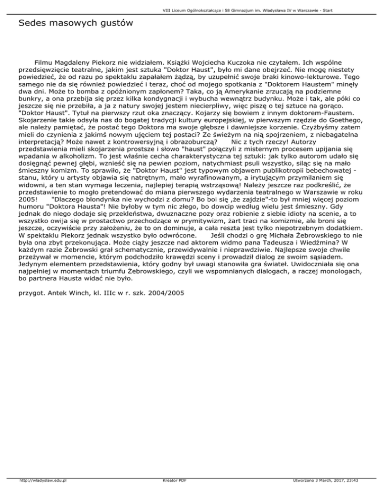 VIII Liceum Ogólnokształcące i 58 Gimnazjum im. Władysława IV w Warszawie - Start Sedes masowych gustów Filmu Magdaleny Piekorz nie widziałem. Książki Wojciecha Kuczoka nie czytałem. Ich wspólne przedsięwzięcie teatralne, jakim jest sztuka "Doktor Haust", było mi dane obejrzeć. Nie mogę niestety powiedzieć, że od razu po spektaklu zapałałem żądzą, by uzupełnić swoje braki kinowo-lekturowe. Tego samego nie da się również powiedzieć i teraz, choć od mojego spotkania z "Doktorem Haustem" minęły dwa dni. Może to bomba z opóźnionym zapłonem? Taka, co ją Amerykanie zrzucają na podziemne bunkry, a ona przebija się przez kilka kondygnacji i wybucha wewnątrz budynku. Może i tak, ale póki co jeszcze się nie przebiła, a ja z natury swojej jestem niecierpliwy, więc piszę o tej sztuce na gorąco. "Doktor Haust". Tytuł na pierwszy rzut oka znaczący. Kojarzy się bowiem z innym doktorem-Faustem. Skojarzenie takie odsyła nas do bogatej tradycji kultury europejskiej, w pierwszym rzędzie do Goethego, ale należy pamiętać, że postać tego Doktora ma swoje głębsze i dawniejsze korzenie. Czyżbyśmy zatem mieli do czynienia z jakimś nowym ujęciem tej postaci? Ze świeżym na nią spojrzeniem, z niebagatelna interpretacją? Może nawet z kontrowersyjną i obrazoburczą? Nic z tych rzeczy! Autorzy przedstawienia mieli skojarzenia prostsze i słowo "haust" połączyli z misternym procesem upijania się wpadania w alkoholizm. To jest właśnie cecha charakterystyczna tej sztuki: jak tylko autorom udało się dosięgnąć pewnej głębi, wznieść się na pewien poziom, natychmiast psuli wszystko, siląc się na mało śmieszny komizm. To sprawiło, że "Doktor Haust" jest typowym objawem publikotropii bebechowatej stanu, który u artysty objawia się natrętnym, mało wyrafinowanym, a irytującym przymilaniem się widowni, a ten stan wymaga leczenia, najlepiej terapią wstrząsową! Należy jeszcze raz podkreślić, że przedstawienie to mogło pretendować do miana pierwszego wydarzenia teatralnego w Warszawie w roku 2005! "Dlaczego blondynka nie wychodzi z domu? Bo boi się ,że zajdzie"-to był mniej więcej poziom humoru "Doktora Hausta"! Nie byłoby w tym nic złego, bo dowcip według wielu jest śmieszny. Gdy jednak do niego dodaje się przekleństwa, dwuznaczne pozy oraz robienie z siebie idioty na scenie, a to wszystko owija się w prostactwo przechodzące w prymitywizm, żart traci na komizmie, ale broni się jeszcze, oczywiście przy założeniu, że to on dominuje, a cała reszta jest tylko niepotrzebnym dodatkiem. W spektaklu Piekorz jednak wszystko było odwrócone. Jeśli chodzi o grę Michała Żebrowskiego to nie była ona zbyt przekonująca. Może ciąży jeszcze nad aktorem widmo pana Tadeusza i Wiedźmina? W każdym razie Żebrowski grał schematycznie, przewidywalnie i nieprawdziwie. Najlepsze swoje chwile przeżywał w momencie, którym podchodziło krawędzi sceny i prowadził dialog ze swoim sąsiadem. Jedynym elementem przedstawienia, który godny był uwagi stanowiła gra świateł. Uwidoczniała się ona najpełniej w momentach triumfu Żebrowskiego, czyli we wspomnianych dialogach, a raczej monologach, bo partnera Hausta widać nie było. przygot. Antek Winch, kl. IIIc w r. szk. 2004/2005 http://wladyslaw.edu.pl Kreator PDF Utworzono 3 March, 2017, 23:43