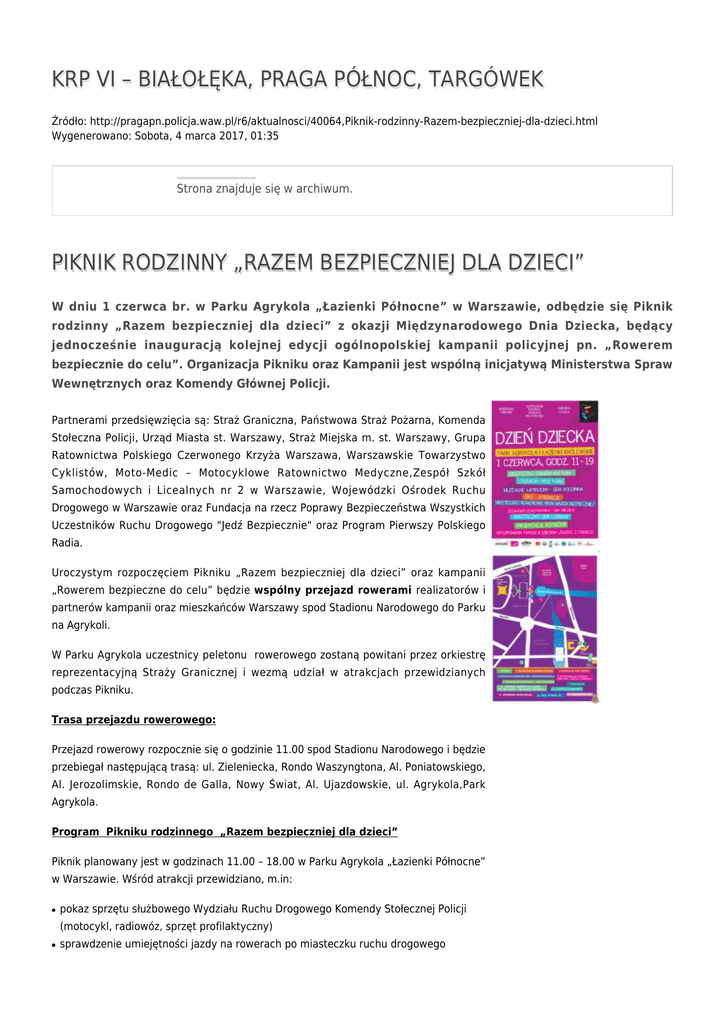 KRP VI – BIAŁOŁĘKA, PRAGA PÓŁNOC, TARGÓWEK Źródło: http://pragapn.policja.waw.pl/r6/aktualnosci/40064,Piknik-rodzinny-Razem-bezpieczniej-dla-dzieci.html Wygenerowano: Sobota, 4 marca 2017, 01:35 Strona znajduje się w archiwum. PIKNIK RODZINNY „RAZEM BEZPIECZNIEJ DLA DZIECI” W dniu 1 czerwca br. w Parku Agrykola „Łazienki Północne” w Warszawie, odbędzie się Piknik rodzinny „Razem bezpieczniej dla dzieci” z okazji Międzynarodowego Dnia Dziecka, będący jednocześnie inauguracją kolejnej edycji ogólnopolskiej kampanii policyjnej pn. „Rowerem bezpiecznie do celu”. Organizacja Pikniku oraz Kampanii jest wspólną inicjatywą Ministerstwa Spraw Wewnętrznych oraz Komendy Głównej Policji. Partnerami przedsięwzięcia są: Straż Graniczna, Państwowa Straż Pożarna, Komenda Stołeczna Policji, Urząd Miasta st. Warszawy, Straż Miejska m. st. Warszawy, Grupa Ratownictwa Polskiego Czerwonego Krzyża Warszawa, Warszawskie Towarzystwo Cyklistów, Moto-Medic – Motocyklowe Ratownictwo Medyczne,Zespół Szkół Samochodowych i Licealnych nr 2 w Warszawie, Wojewódzki Ośrodek Ruchu Drogowego w Warszawie oraz Fundacja na rzecz Poprawy Bezpieczeństwa Wszystkich Uczestników Ruchu Drogowego "Jedź Bezpiecznie" oraz Program Pierwszy Polskiego Radia. Uroczystym rozpoczęciem Pikniku „Razem bezpieczniej dla dzieci” oraz kampanii „Rowerem bezpieczne do celu” będzie wspólny przejazd rowerami realizatorów i partnerów kampanii oraz mieszkańców Warszawy spod Stadionu Narodowego do Parku na Agrykoli. W Parku Agrykola uczestnicy peletonu rowerowego zostaną powitani przez orkiestrę reprezentacyjną Straży Granicznej i wezmą udział w atrakcjach przewidzianych podczas Pikniku. Trasa przejazdu rowerowego: Przejazd rowerowy rozpocznie się o godzinie 11.00 spod Stadionu Narodowego i będzie przebiegał następującą trasą: ul. Zieleniecka, Rondo Waszyngtona, Al. Poniatowskiego, Al. Jerozolimskie, Rondo de Galla, Nowy Świat, Al. Ujazdowskie, ul. Agrykola,Park Agrykola. Program Pikniku rodzinnego „Razem bezpieczniej dla dzieci” Piknik planowany jest w godzinach 11.00 – 18.00 w Parku Agrykola „Łazienki Północne” w Warszawie. Wśród atrakcji przewidziano, m.in: ● pokaz sprzętu służbowego Wydziału Ruchu Drogowego Komendy Stołecznej Policji (motocykl, radiowóz, sprzęt profilaktyczny) ● sprawdzenie umiejętności jazdy na rowerach po miasteczku ruchu drogowego ● przeprowadzanie egzaminu na kartę rowerową (za zgodą i w obecności rodzica lub opiekuna) ● znakowanie rowerów (po okazaniu dowodu zakupu i dokumentu tożsamości) ● obsługę przez funkcjonariuszy Państwowej Straży Pożarnej stanowiska do wspinania po skrzynkach lub stanowiska z poduszką pneumatyczną do skoków z drabiny dla najmłodszych ● prezentację specjalistycznego sprzętu ratownictwa technicznego lub chemicznego Państwowej Straży Pożarnej ● pokaz tresury psów ratowniczych ● zabawy i konkursy dotyczące bezpieczeństwa, razem ze Strażą Miejskiej m.st. Warszawy ● prezentację oznakowanych skuterów i radiowozu Straży Miejskiej m.st. Warszawy ● pokaz sprzętu, patrolu „EKO” Straży Miejskiej m.st. Warszawy ● prezentacja patroli rowerowych Straży Miejskiej m.st. Warszawy ● prezentacja motocykla ratunkowego Moto-Medic ● prezentacja symulatora bezpiecznej jazdyi alkogogli przez uczniów Zespołu Szkół Samochodowych i Licealnych nr 2 w Warszawie ● prezentacja pojazdów służbowych Straży Granicznej ● obsługa strzelnicy Straży Granicznej ● zorganizowanie patroli ratowniczych, kącika malucha, zabaw w bandażowanie pluszaków pod okiem instruktorów i ratowników PCK ● praktyczna prezentacja współczesnych elementów wyposażenia samochodu podnoszących bezpieczeństwo podróżujących dzieciprzez Fundację Na Rzecz Poprawy Bezpieczeństwa Wszystkich Uczestników Ruchu Drogowego "Jedź Bezpiecznie" ● praktyczne porady z optymalnego doboru fotelika samochodowego dla dziecka ● praktyczne warsztaty z montażu fotelika w samochodzie z wykorzystaniem elementów jego wyposażenia ● zajęcia dla dzieci - utrwalanie znaków drogowych i ich znaczenia poprzez kolorowanki ● zajęcia dla dorosłych w alkogoglach - zmiana postrzegania rzeczywistości po spożyciu alkoholu ● zamontowanie bagażnika - jako przykład alternatywnego sposobu przewożenia rowerów ● wiele innych atrakcji dla dzieci Informacje dotyczące kampanii„Rowerem bezpiecznie do celu” Założeniem kampanii „Rowerem bezpiecznie do celu” jest promowanie bezpieczeństwa w ruchu drogowym rowerzystów, w szczególności dzieci i młodzieży, kształtowanie postawy świadomego i bezpiecznego uczestnika ruchu drogowego, przestrzegającego przepisów prawa. Ideą kampanii jest także zaznajomienie dzieci i młodzieży z zagrożeniami, które mogą spotkać je na drodze oraz wyrobienie nawyku poszanowania przepisów prawa o ruchu drogowym. Kampania „Rowerem bezpiecznie do celu” będzie trwała przez cały okres wakacji. Kampania od 6 lat wpisuje się w działania realizowane w ramach rządowego programu ograniczania przestępczości i aspołecznych zachowań „Razem bezpieczniej”. Kampania jest również na liście przedsięwzięć realizowanych w ramach tzw. dekady działań na rzecz bezpieczeństwa ruchu drogowego, zainaugurowanej 11 maja 2011 r. w Sejmie (Zgromadzenie Ogólne Narodów Zjednoczonych ogłosiło lata 2011-2020 dekadą działań na rzecz bezpieczeństwa ruchu drogowego - Decade of Action for Road Safety). WRD KSP Ocena: 0/5 (0) Tweetnij