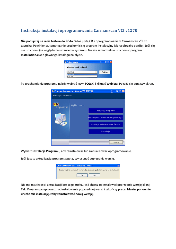 Instrukcja instalacji oprogramowania Carmanscan VCI v1270 Nie podłączaj na razie testera do PC-ta. Włóż płytę CD z oprogramowaniem Carmanscan VCI do czytnika. Powinien automatycznie uruchomić się program instalacyjny jak na obrazku poniżej. Jeśli się nie uruchomi (ze względu na ustawienia systemu). Należy samodzielnie uruchomić program Installation.exe z głównego katalogu na płycie. Po uruchomieniu programu należy wybrać język POLSKI i kliknąć Wybierz. Pokaże się poniższy ekran. Wybierz Instalacja Programu, aby zainstalować lub zaktualizować oprogramowanie. Jeśli jest to aktualizacja program zapyta, czy usunąć poprzednią wersję. Nie ma możliwości, aktualizacji bez tego kroku. Jeśli chcesz odinstalować poprzednią wersję kliknij Tak. Program przeprowadzi odinstalowanie poprzedniej wersji i zakończy pracę. Musisz ponownie uruchomić instalację, żeby zainstalować nową wersję. Uruchomi się właściwy instalator oprogramowania. Należy wybrać język instalacji. Pozostaw zaznaczony English i kliknij Dalej (Next). Po wybraniu języka rozpocznie się kopiowanie plików. Po zakończeniu kopiowania uruchomi się instalator sterowników. Jeśli Carmanscan VCI jest podłączony do komputera to należy go odłączyć i kliknąć Next. Podłącz tester do zasilania z gniazda zapalniczki, akumulatora lub kablem diagnostycznym do dowolnego samochodu z gniazdem 16-to pinowym. Włącz tester, podłącz do portu USB i poczekaj na pojawienie się ekranów jak w instrukcji na ekranie. Po zainstalowaniu sterowników jeśli poniższe okno automatycznie nie zniknie należy wcisnąć klawisz Enter na klawiaturze. Po instalacji sterowników USB. Nastąpi instalacja komponentów Flash. Należy zaznaczyć pole wyboru przy „Potwierdzam przeczytanie…” i kliknąć Instaluj. Po zakończeniu instalacji kliknij na Gotowe. Uruchomi się instalator sterowników Bluetooth. Należy kliknąć na tak i postępować wg instrukcji. Po zainstalowaniu sterowników Bluetooth uruchomi się instalator sterowników WLAN. Należy kliknąć na Nie. Po zakończeniu instalacji sterowników automatycznie rozpocznie się instalacja plików diagnostycznych. Po zakończeniu instalacji program zaproponuje restart systemu. Można kliknąć na No i wykonać restart po ostatnim kroku w instrukcji. Kliknij Finish. W ostatnim kroku instalacji należy przekopiować z głównego folderu płyty katalog diag do folderu instalacji oprogramowania Carmanscan VCI. • • W wypadku Windows XP lub 32bitowych wersji Vista lub 7 – do folderu: C:\Program Files\Nextech\CarmanVCI W wypadku wersji 64bitowych systemów Vista lub 7 – do folderu: c:\Program Files (x86)\Nextech\CarmanVCI w wersjach 32bitowych tego folderu nie ma. • • Z płyty UPDATE 1350 należy doinstalować najnowsze wersje programów diagnostycznych przez kolejne uruchomienie plików na niej umieszczonych Po zakończeniu całej instalacji i uruchomieniu pierwszej diagnostyki, przyrząd zażąda podania kodów uruchamiających oprogramowanie. Proszę o kontakt telefoniczny aby je uzyskać.