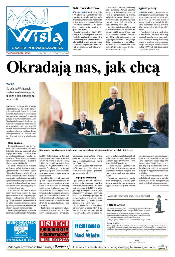 ZGK: trwa śledztwo tygodnik BEZPŁATNy NR 4 (411) – 31 stycznia 2013 Góra Kalwaria. Wydział do Walki z Przestępczością Gospodarczą piaseczyńskiej komendy policji przesłuchuje osoby, które mają związek z aferą finansową w gminnym Zakładzie Gospodarki Komunalnej. W poniedziałek wyjaśnienia złożył prezes spółki Jerzy Pełka. Jak pisaliśmy, w latach 2007 – 2011 z kasy ZGK zniknęło ponad 95 tys. zł. Pieniądze pochodziły z opłat klientów za wodę, ścieki i śmieci. Od 2011 roku Zakład zaczął wzywać mieszkańców do uregulowania należności i tak kradzieże wewnątrz firmy wyszły na jaw. Podczas piątkowej sesji rady miejskiej burmistrz Dariusz Zieliński oznajmił, że dwie zamieszane w proceder kobiety przyznały się do winy, podpisały stosowne oświadczenia i zwróciły już po 5 tys. zł z przywłaszczonych kwot. Zadeklarowały, że resztę oddadzą w dwa lata. Burmistrz poinformował również, że rada nadzorcza ZGK nakazała zarządowi spółki sprawdzić wszystkie konta klientów Zakładu i wyjaśnić wszelkie wątpliwości związane z zaległymi płatnościami. – Wszyscy jesteśmy zdruzgotani tą sprawą. Mamy świadomość, że odbudowanie wizerunku ZGK będzie bardzo trudne – stwierdził burmistrz. (pc) Zginął pieszy Jasieniec. Grójeccy kryminalni poszukują sprawcy śmiertelnego potrącenia starszego mężczyzny w Miedzechowie. Do wypadku doszło w ostatni piątek w godzinach 20.30 – 20.40 na drodze z Jasieńca do Warki. Ofiarę zauważył przejeżdżający kierowca. Prawdopodobnie w wypadku brało udział audi – wskazują na to fragmenty elementów auta, które znaleziono na miejscu. Osoby, które mogą pomóc w ustaleniu sprawcy, proszone są o kontakt pod numerami tel. 48 668 72 00, 997 lub 112, albo z najbliższą jednostką policji. (pc) Okradają nas, jak chcą warka Strach na Winiarach. Ludzie zastanawiają się, u kogo będzie następne włamanie. Pod koniec zeszłego roku i na początku bieżącego na osiedlu domów jednorodzinnych doszło do siedmiu włamań, najczęściej w środku dnia. Zdesperowani mieszkańcy napisali petycję do burmistrza Dariusza Gizki. W odpowiedzi w poniedziałek zorganizował on spotkanie z szefem policji w powiecie grójeckim insp. Michałem Toporkiewiczem i wareckim wicekomendantem nadkom. Tomaszem Jeżewskim. Do Centrum Sportu i Rekreacji przybyło kilkadziesiąt osób. Ręce opadają Do pana Zenona z ul. Jana Chryzostoma Paska włamano się z 21 na 22 listopada. Sprawcy sforsowali okno i splądrowali wnętrza. Zabrali drobną kwotę oraz biżuterię i kolekcję zegarków. – Długo się nie zastanawiałem: wykosztowałem się i założyłem alarm – mówi „Nad Wisłą”. W trakcie spotkania nie szczędził on krytyki policji i usłyszał nawet „przepraszam” od nadkom. Jeżewskiego. Pan Zenon opowiadał, jak próbował w komisariacie w Warce porozmawiać z policjantem prowadzącym dochodzenie, aby uzupełnić listę swoich strat. Raz usłyszał w dyżurce, że funkcjonariusz jest chory, drugi raz – że poszedł na urlop. – Po miesiącu dostałem z prokuratury umorzenie sprawy. Dla mnie operatywność wareckiej policji jest żadna – podsumował zdenerwowany. Obaj komendanci odpowiadali, że po takim potraktowaniu przez oficera dyżurnego mieszkaniec powinien poskarżyć się szefowi komisariatu. Do krytyków policyjnej rutyny dołączył również burmistrz Dariusz Giz- By uspokoić mieszkańców, zorganizowano spotkanie z komendantem powiatowym policji (stoi) (fot. pc) ka, który kilka lat temu też doświadczył włamania do domu. – Skoro ktoś dzwoni na policję, to szuka pomocy. Jeśli słyszy, że dzielnicowy jest chory albo go nie ma, i to wszystko, to ręce opadają. Chciałbym wierzyć, że policjanci to specjaliści. Spróbujmy sobie nawzajem pomóc – zaapelował do komendantów. Gorzkich słów pod adresem policji padło więcej. Skarżono się, że nie stara się zapobiec kolejnym włamaniom. – Na Winiarach nie widzimy policji, mimo że okradają nas systematycznie. Nie ma od niej żadnej informacji, żadnych ostrzeżeń kierowanych do mieszkańców osiedla, żadnych instrukcji, jak postępować. Jesteśmy zdesperowani – mówił Robert Jastrzębski, któremu skradziono kosztowności. Szefowie policji przekonywali, że funcjonariusze patrolują także Winiary – ale najczęściej po cywilnemu, w nieoznakowanych autach. – Wierzcie mi. Problem w tym, że oni są operacyjni, ludzie ich nie widzą – mówił insp. Toporkiewicz. Nie wszyscy jednak byli skłonni zaufać jego zapewnieniom. – Pracuję w domu. Nie widzę policji – polemizował Jarosław Strzelczyk. To grupa z Warszawy? Jak przyznał Robert Jastrzębski, strach przed włamaniami sprawił, że mieszkańcy osiedla stali się dla siebie mniej anonimowi. Niektórzy zwracają uwagę, co dzieje się u sąsiada, spisują numery rejestracyjne obcych samochodów i dzwonią na policję. – Ale obawiamy się, że w końcu ktoś z nas, oby nie kobieta czy dziecko, natknie się na bandytę – alarmował. Pytał również, ilu udało się schwytać sprawców włamań, których na Winiarach w ostatnich trzech latach odnotowano 13. – Z ubolewaniem po- wiem, że żadnego. Ale to bardzo trudne, bo sprawcami są wyspecjalizowane grupy, często z Warszawy – odpowiadał Michał Toporkiewicz. Zdradził też, że policja ma poważne podejrzenia, że włamywaczom pomaga ktoś z Warki: wskazuje im konkretne adresy i najlepszą porę na kradzieże. Początkowo komendant powiatowy przekonywał, że liczba przestępstw na osiedlu „nie jest przerażająca”, że mieszkańcy nie powinni czuć się nadmiernie zagrożeni. Ale po głosach z sali stwierdził, że „jest problem” i skieruje większą liczbę patroli w ten rejon Warki. Zastrzegł przy tym, że policji nie może być tam za dużo, bo mieszkańcy zaczną się czuć, jakby żyli w wyjątkowo niebezpiecznej okolicy. Póki co warecki komisariat stworzył u