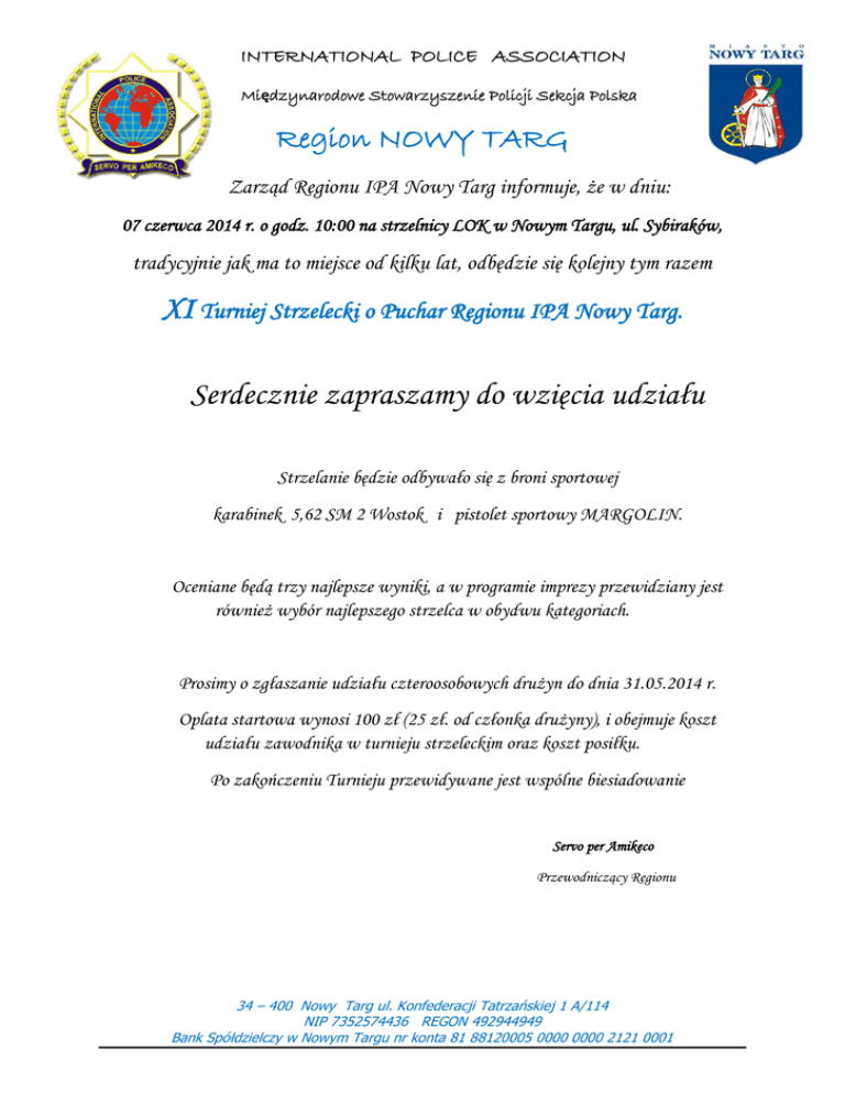 INTERNATIONAL POLICE ASSOCIATION Międzynarodowe Stowarzyszenie Policji Sekcja Polska Region NOWY TARG Zarząd Regionu IPA Nowy Targ informuje, że w dniu: 07 czerwca 2014 r. o godz. 10:00 na strzelnicy LOK w Nowym Targu, ul. Sybiraków, tradycyjnie jak ma to miejsce od kilku lat, odbędzie się kolejny tym razem XI Turniej Strzelecki o Puchar Regionu IPA Nowy Targ. Serdecznie zapraszamy do wzięcia udziału Strzelanie będzie odbywało się z broni sportowej karabinek 5,62 SM 2 Wostok i pistolet sportowy MARGOLIN. Oceniane będą trzy najlepsze wyniki, a w programie imprezy przewidziany jest również wybór najlepszego strzelca w obydwu kategoriach. Prosimy o zgłaszanie udziału czteroosobowych drużyn do dnia 31.05.2014 r. Oplata startowa wynosi 100 zł (25 zł. od członka drużyny), i obejmuje koszt udziału zawodnika w turnieju strzeleckim oraz koszt posiłku. Po zakończeniu Turnieju przewidywane jest wspólne biesiadowanie Servo per Amikeco Przewodniczący Regionu 34 – 400 Nowy Targ ul. Konfederacji Tatrzańskiej 1 A/114 NIP 7352574436 REGON 492944949 Bank Spółdzielczy w Nowym Targu nr konta 81 88120005 0000 0000 2121 0001 INTERNATIONAL POLICE ASSOCIATION Międzynarodowe Stowarzyszenie Policji Sekcja Polska Region NOWY TARG Regulamin zawodów XI Turnieju Strzeleckiego o Puchar Regionu IPA Nowy Targ organizowanych przez Region IPA Nowy Targ oraz Koło LOK w Nowym Targu w dniu 07 czerwca 2014 1. Cel zawodów: popularyzacja strzelectwa wśród funkcjonariuszy zrzeszonych oraz sympatyków strzelectwa sportowego; integracja członków IPA, funkcjonariuszy Policji i SG, sympatyków strzelectwa sportowego; spotkanie przyjaciół, wymiana doświadczeń; 2. Organizatorzy: Region IPA Nowy Targ oraz Koło LOK Nowy Targ 3. Miejsce: Strzelnica LOK w Nowym Targu, ul. Sybiraków 45 4. Czas: 07 czerwca 2014 roku ( sobota ), godz. 10.00 5. Konkurencja strzelecka: strzelanie z karabinka sportowego 5,62 mm SM 2 Wostok tarczy TS4, odległość 50 m, pozycja strzelecka - leżąc, ilość strzałów 3+10, w klasyfikacji liczone będzie 10 najlepszych strzałów zawodnika 6. Konkurencja strzelecka: strzelanie z pistoletu sportowego MARGOLIN kal. 5,6 mm do tarczy TS4, odległość 25m, pozycja strzelecka – z jednej ręki, ilość strzałów 3+10, w klasyfikacji liczone będzie 10 najlepszych strzałów zawodnika 7. W zawodach biorą udział drużyny 4-osobowe oraz zawodnicy indywidualni. W klasyfikacji drużynowej liczone będą 3 najlepsze wyniki z każdej drużyny. Prowadzona będzie wspólna klasyfikacja kobiet i mężczyzn. 8. Nagrody: - dla najlepszego strzelca zawodów – Puchar ufundowany przez Przewodniczącego Regionu IPA Nowy Targ oraz dyplom; dla najlepszej drużyny strzeleckiej – Puchar ufundowany przez Przewodniczącego Regionu IPA Nowy Targ oraz dyplom; miejsca II –III indywidualnie i drużynowo - puchary i dyplomy; miejsca IV –VI indywidualnie i drużynowo – dyplomy; 9. Strzelanie prowadzone będzie z broni zabezpieczonej przez organizatorów zawodów, którzy zapewniają również amunicję i obsadę sędziowską oraz pkt. 12. 10. Sprawy nieuregulowane w regulaminie, rozstrzyga komisja sędziowska. 11. Opłata startowa: 25 zł od uczestnika - przyjmowana od uczestników w dniu zawodów 12. W trakcie zawodów dla wszystkich uczestników przewidziany jest poczęstunek 13. Zgłoszenia uczestników przyjmowane będą do dnia 31 maj 2013 na podany niżej adres mailowy i nr telefonu: Jacek Sztur: tel. 793-945-711, Mateusz Kapołka: [email protected] tel. 507 125 797 14. Zastrzeżenia i informacje ogólne : WSZYSCY UCZESTNICY ZAWODÓW SĄ ZOBOWIĄZANI DO ŚCISŁEGO PRZESTRZEGANIA: PRZEPISÓW NINIEJSZEGO REGULAMINU, ZASAD BEZPIECZEŃSTWA, REGULAMINU STRZELNICY I POLECEŃ OSÓB PROWADZĄCYCH STRZELANIE. NIESTOSOWANIE SIĘ DO W/W ZAPISÓW POWODUJE DYSKWALIFIKACJĘ I USUNIĘCIE ZE STRZELNICY 34 – 400 Nowy Targ ul. Konfederacji Tatrzańskiej 1 A/114 NIP 7352574436 REGON 492944949 Bank Spółdzielczy w Nowym Targu nr konta 81 88120005 0000 0000 2121 0001 INTERNATIONAL POLICE ASSOCIATION Międzynarodowe Stowarzyszenie Policji Sekcja Polska Region NOWY TARG 34 – 400 Nowy Targ ul. Konfederacji Tatrzańskiej 1 A/114 NIP 7352574436 REGON 492944949 Bank Spółdzielczy w Nowym Targu nr konta 81 88120005 0000 0000 2121 0001