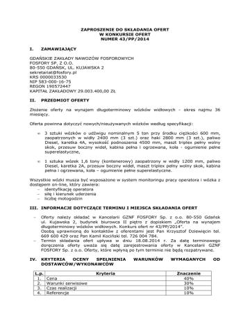 ZAPROSZENIE DO SKŁADANIA OFERT W KONKURSIE OFERT NUMER 43/PP/2014 I. ZAMAWIAJĄCY GDAŃSKIE ZAKŁADY NAWOZÓW FOSFOROWYCH FOSFORY SP. Z O.O. 80-550 GDAŃSK, UL. KUJAWSKA 2 [email protected] KRS 0000033530 NIP 583-000-16-75 REGON 190572447 KAPITAŁ ZAKŁADOWY 29.003.400,00 ZŁ II. PRZEDMIOT OFERTY Złożenie oferty na wynajem długoterminowy wózków widłowych - okres najmu 36 miesięcy. Oferta powinna dotyczyć nowych/nieużywanych wózków według specyfikacji: • 3 sztuki wózków o udźwigu nominalnym 5 ton przy środku ciężkości 600 mm, zaopatrzonych w widły 2400 mm (3 szt.) oraz haki 2800 mm (3 szt.), paliwo Diesel, karetka 4A, wysokość podnoszenia 4500 mm, maszt triplex pełny wolny skok, przesuw boczny wideł, kabina pełna i ogrzewana, koła - ogumienie pełne superelastyczne, • 1 sztuka wózek 1,6 tony (kontenerowy) zaopatrzony w widły 1200 mm, paliwo Diesel, karetka 2A, przesuw boczny wideł, maszt triplex pełny wolny skok, kabina pełna i ogrzewana, koła – ogumienie pełne superelastyczne. Wszystkie wózki musza być wyposażone w system monitoringu pracy operatora i wózka z dostępem on-line, który zawiera: − identyfikację operatora − siłę i kierunek uderzenia − liczbę motogodzin III. INFORMACJE DOTYCZĄCE TERMINU I MIEJSCA SKŁADANIA OFERT − − IV. Oferty należy składać w Kancelarii GZNF FOSFORY Sp. z o.o. 80-550 Gdańsk ul. Kujawska 2, budynek biurowca II piętro z dopiskiem „Oferta na wynajem długoterminowy wózków widłowych. Konkurs ofert nr 43/PP/2014”. Osobą uprawnioną do kontaktów z oferentami jest Pan Krzysztof Dziewięcin tel. 669 600 429 oraz Pan Kamil Kociński tel. 726 004 784. Termin składania ofert upływa w dniu 18.08.2014 r. Za datę terminowego doręczenia oferty uważa się datę zarejestrowania oferty w Kancelarii GZNF FOSFORY Sp. z o.o. Oferty, które wpłyną po tym terminie nie będą rozpatrywane. KRYTERIA OCENY SPEŁNIENIA DOSTAWCÓW/WYKONAWCÓW L.p. 1. 2. 3. 4. Kryteria Cena Warunki serwisowe Czas realizacji Referencje WARUNKÓW WYMAGANYCH Znaczenie 40% 30% 10% 10% OD 5. V. − − − − VI. − − − − − − Wiarygodność w ocenie członków Komisji 10% OFERTA POWINNA ZAWIERAĆ Cenę ofertową. Warunki płatności. Warunki gwarancyjne. Warunki serwisowe. WYMAGANE ZAŁĄCZNIKI Kserokopia dokumentu rejestrowego oferenta. Kserokopia numeru NIP, REGON. Dokumenty pozwalające ocenić wiarygodność techniczną i ekonomiczna oferenta. Oświadczenie o sytuacji finansowej zapewniającej wykonanie zamówienia. Oświadczenie o braku wszczęcia w stosunku do oferenta postępowania upadłościowego lub układowego. Oświadczenie o nie zaleganiu z uiszczaniem podatków, opłat lub składek na ubezpieczenia społeczne. VII. UWAGI KOŃCOWE − − − Wszystkie dokumenty ofertowe muszą być podpisane przez osoby uprawnione do reprezentowania firmy. W przypadku zawarcia umowy deklarowane parametry rozliczeń nie będą podlegały zmianie przez cały jej okres działania. W przypadku wątpliwości lub koniecznych uzupełnień po otwarciu ofert zastrzega się prawo do przeprowadzenia rozmów uzupełniających i ewentualnych negocjacji lub do zamknięcia konkursu ofert bez dokonania wyboru którejkolwiek z ofert bez podania przyczyn.