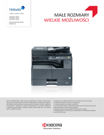DRUK KOPIA SKAN TASKalfa 1800 TASKalfa 2200 WIELOFUNKCYJNE MONO FORMAT A3 MAŁE ROZMIARY WIELKIE MOŻLIWOŚCI Kyocera TASKalfa 1800 i 2200 zostały zaprojektowane z myślą o maksymalnym uproszczeniu codziennej pracy w biurze. Każdy element urządzenia, począwszy od trwałych komponentów po intuicyjny panel sterowania, cechuje wyjątkowa niezawodność i wydajność. Pomimo kompaktowych rozmiarów urządzenie w sprawny sposób wykona wszystkie zadania, gwarantując przy tym wysoką jakość i szybkość działania. Drukowanie z prędkością 18/22 stron A4 i 8/10 stron A3 na minutę Funkcja skanowania w kolorze w standardzie Funkcja kopiowania dowodów osobistych Laserowa technologia z rozdzielczością 600 dpi przy 256 skali szarości dla kopiowania tekstu i realistycznych fotografii Opcjonalnie dwustronny podajnik dokumentów i dupleks Podajnik papieru na 400 arkuszy w standardzie (z możliwością rozbudowania do 1300 arkuszy) Urządzenia Kyocera TASKalfa 1800 i 2200 cechuje niezawodność i ponadprzeciętna żywotność podzespołów, które umożliwiają efektywne i niezakłócone działanie. Aby sprostać wymaganiom współczesnego biura, gwarantują elastyczność i wysoką wydajność, zapewniając przy tym minimalny wpływ na środowisko naturalne. DANE OGÓLNE DRUKOWANIE OPCJE Technologia: KYOCERA Laser Procesor: ARM v5, 500 MHz Prędkość drukowania i kopiowania: TASKalfa 1800: 18/8 stron A4/A3 na minutę TASKalfa 2200: 22/10 stron A4/A3 na minutę Pamięć: Standard / maks. 256 MB DP-480 Podajnik dokumentów: 50 arkuszy, skanowanie 2-stronne, 45–120 g/m2, A3-A5R, Folio, Ledger PF-480 Podajnik papieru: 300 arkuszy, 64–105 g/m2, A3-A5R, Folio, Ledger (można dodać maks. 3 podajniki do konfiguracji podstawowej) DU-480 Dupleks: 64–105 g/m2, A3-A5R, Folio, Ledger Rozdzielczość: 600 x 600 dpi, 256 odcieni Emulacje: GDI Interfejsy: USB 2.0 (Hi-Speed) Wydajność: Do 30 000 str. A4 miesięcznie KOPIOWANIE Czas nagrzewania: 17,2 sekundy lub mniej Maksymalny format oryginału: A3 Czas pierwszej kopii: 5,7 sekundy Wymiary (szer x głęb x wys): 565 x 527 x 485 mm Waga: Ok. 26 kg Napięcie zasilania: AC 220 ~ 240 V, 50/60 Hz Pobór mocy TASKalfa 1800: Drukowanie: 385 W Tryb gotowości: 75 W Tryb uśpienia: 1,54 W Pobór mocy TASKalfa 2200: Drukowanie: 415 W Tryb gotowości: 76 W Tryb uśpienia: 1,54 W Poziom hałasu (ISO 7779/ISO 9296): Kopiowanie: 62.0 dB(A); tryb gotowości: 40 dB(A) Certyfikaty: TÜV/GS, CE - urządzenie jest produkowane zgodnie z normą jakości ISO 9001 oraz normą ochrony środowiska ISO 14001 OBSŁUGA PAPIERU Wszystkie podane pojemności dotyczą papieru o grubości maks. 0,11 mm. Pojemność wejściowa: Kaseta uniwersalna na 300 arkuszy, 64–105 g/m2, A3, A4, A5, Ledger, Letter, Legal; 100-kartkowa taca wielofunkcyjna, 45–160 g/m2, A3, A4, A5, A6, Ledger, Letter, Legal; Maksymalna pojemność wejściowa: 1300 arkuszy Kopiowanie ciągłe: 1–999 Zoom: 25–400 % co 1 % Współczynniki zoom: 5 zmniejszeń / 5 powiększeń Dodatkowe możliwości kopiowania: Skanuj-razdrukuj-wielokrotnie, sortowanie elektroniczne i rotacyjne*, automatyczny wybór papieru, kopiowanie dwustronne**, funkcja 2-w-1, 4-w-1, programy użytkownika * Wymagany dodatkowy podajnik papieru PF-480 ** Wymagany dupleks DU-480 Pokrywa oryginału (H): Szafki: Drewniane lub metalowe, na kółkach CB-480L: (niska / drewniana) CB-480H: (wysoka / drewniana) CB-481L: (niska / metalowa) CB-481H: (wysoka / metalowa) Typy ekspozycji: Auto lub ręczna (7 stopni) Ustawienia obrazu: Tekst + foto, tekst, foto SKANOWANIE Funkcjonalności skanera: Skan-do-PC, skan-do-email, TWAIN Prędkość skanowania: 22 str. na minutę (600 dpi/A4) Rozpoznawanie oryginału: Tekst, foto, tekst + foto Maksymalny format oryginału: A3 Dostępne rozdzielczości: 600 dpi, 400 dpi, 300 dpi, 200 dpi (256 odcieni) Typ pliku: PDF, JPG, BMP, TIFF EKSPLOATACJA TK-4105: Toner na 15 000 stron A4 przy pokryciu 6% Toner startowy: Na 3000 stron A4 przy pokryciu 6% Pojemność wyjściowa: 250 arkuszy KYOCERA Document Solutions Europe B.V. – Branch Office Germany Otto-Hahn-Straße 12 – 40670 Meerbusch – Germany Tel +49 (0) 2159 928-500 – Fax +49 (0) 2159 918-100 www.kyoceradocumentsolutions.eu – [email protected] KYOCERA Document Solutions Inc. – 2-28, 1-Chome – Tamatsukuri – Chuo-Ku Osaka 540-8585 – Japan – www.kyoceradocumentsolutions.com KYOCERA Document Solutions nie gwarantuje, że powyższa specyfikacja jest całkowicie wolna od błędów. Specyfikacja może ulec zmianie bez wcześniejszego powiadomienia. Informacje zawarte w niniejszej ulotce są aktualne na dzień oddania do druku i nie stanowią oferty handlowej. Jakiekolwiek inne znaki handlowe i nazwy produktów mogące być znakami handlowymi i zarejestrowanymi znakami handlowymi należą do ich właścicieli. DYSTRYBUTOR KYOCERA W POLSCE Arcus S.A. ul. Kolejowa 5/7, 00-180 Warszawa tel.: +48 22 536 09 00 faks: +48 22 831 70 43 e-mail: [email protected]