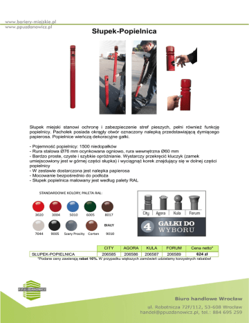 Słupek-Popielnica Słupek miejski stanowi ochronę i zabezpieczenie stref pieszych, pełni również funkcję popielnicy. Pachołek posiada okrągły otwór oznaczony nalepką przedstawiającą dymiącego papierosa. Popielnice wieńczą dekoracyjne gałki. - Pojemność popielnicy: 1500 niedopałków - Rura stalowa Ø76 mm ocynkowana ogniowo, rura wewnętrzna Ø60 mm - Bardzo proste, czyste i szybkie opróżnianie. Wystarczy przekręcić kluczyk (zamek umiejscowiony jest w górnej części słupka) i wyciągnąć korek znajdujący się w dolnej części popielnicy - W zestawie dostarczona jest nalepka papierosa - Mocowanie bezpośrednio do podłoża - Słupek popielnica malowany jest według palety RAL SŁUPEK-POPIELNICA CITY AGORA KULA FORUM Cena netto* 206585 206586 206587 206589 624 zł *Podane ceny zawierają rabat 16%. W przypadku większych zamówień udzielamy korzystnych rabatów!