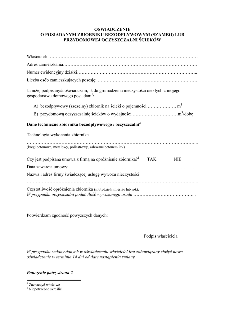 OŚWIADCZENIE O POSIADANYM ZBIORNIKU BEZODPŁYWOWYM (SZAMBO) LUB PRZYDOMOWEJ OCZYSZCZALNI ŚCIEKÓW Właściciel: ……………………………………………………………………………………… Adres zamieszkania:……………………………………………………………………………. Numer ewidencyjny działki…………………………………………………………………….. Liczba osób zamieszkujących posesję: ………………………………………………………… Ja niżej podpisany/a oświadczam, iż do gromadzenia nieczystości ciekłych z mojego gospodarstwa domowego posiadam1: A) bezodpływowy (szczelny) zbiornik na ścieki o pojemności ………………. m3 B) przydomową oczyszczalnię ścieków o wydajności …………………………m3/dobę Dane techniczne zbiornika bezodpływowego / oczyszczalni2 Technologia wykonania zbiornika …………………………………………………………………………………………………... (kręgi betonowe, metalowy, poliestrowy, zalewane betonem itp.) Czy jest podpisana umowa z firmą na opróżnienie zbiornika?1 TAK NIE Data zawarcia umowy: …………………………………………………………………………. Nazwa i adres firmy świadczącej usługę wywozu nieczystości …………………………………………………………………………………………………... Częstotliwość opróżnienia zbiornika (m³/tydzień, miesiąc lub rok). W przypadku oczyszczalni podać ilość wywożonego osadu …………………………………... Potwierdzam zgodność powyższych danych: ……………………………. Podpis właściciela W przypadku zmiany danych w oświadczeniu właściciel jest zobowiązany złożyć nowe oświadczenie w terminie 14 dni od daty nastąpienia zmiany. Pouczenie patrz strona 2. 1 2 Zaznaczyć właściwe Niepotrzebne skreślić Pouczenie Burmistrz Książa Wlkp. informuje, iż zgodnie z art. 3 ust. 3 pkt. 1 i 2 ustawy z dnia 13 września 1996 r. o utrzymaniu czystości i porządku w gminach (Dz. U. z 2012 r. poz. 391) gminy mają obowiązek prowadzenia ewidencji zbiorników bezodpływowych na nieczystości płynne oraz ewidencji przydomowych oczyszczalni ścieków. W związku z powyższym Burmistrz Książa Wlkp. zwraca się z uprzejmą prośbą do mieszkańców Gminy Książ Wlkp. o wypełnienie druku oświadczenia o posiadanym zbiorniku bezodpływowym (szambo) lub przydomowej oczyszczalni ścieków i dostarczenie do Sołtysa lub do Urzędu Miejskiego w Książu Wlkp. w terminie nieprzekraczalnym do dnia 31 sierpnia 2012 r. W przypadku nie złożenia oświadczenia Burmistrz Książa Wlkp. będzie zobowiązany do przeprowadzenia kontroli posesji w celu ustalenia posiadanego zbiornika na nieczystości płynne.