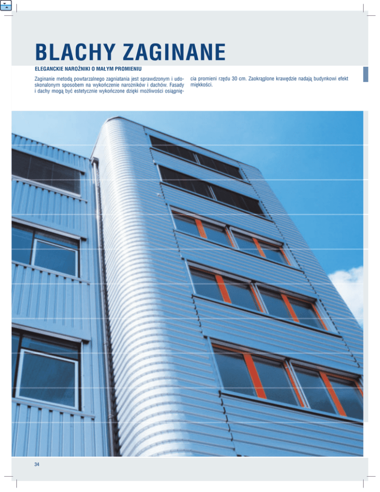 BLACHY ZAGINANE ELEGANCKIE NAROŻNIKI O MAŁYM PROMIENIU Zaginanie metodą powtarzalnego zagniatania jest sprawdzonym i udoskonalonym sposobem na wykończenie narożników i dachów. Fasady i dachy mogą być estetycznie wykończone dzięki możliwości osiągnię- 34 cia promieni rzędu 30 cm. Zaokrąglone krawędzie nadają budynkowi efekt miękkości. SP 26 SP 26 1.00 0.88 0.80 0.75 0.70 GRUBOŚĆ mm STRONA B STRONA A BLACHY ZAGINANE METODĄ POWTARZALNEGO ZAGNIATANIA SWISS PANEL® SP 26/ SP 42 / SP 45 STAL ALU STAL SP 41 SP 41 ALU STAL SP 44 ALU SP 45 STAL SP 45 ALU Kąt BLACHY WYGINANE METODĄ POWTARZALNEGO ZAGNIATANIA SWISS PANEL® SP 26/ SP 42 / SP 45 Przekrój x-x SPECYFIKACJA TECHNICZNA PROMIEŃ WEWNĘTRZNY r = min. 300 mm dla SP 26 i SP 41 r = min. 400 mm dla SP 45 ODLEGŁOŚĆ MIĘDZY FAŁDAMI b = min. 45 mm ODCINEK OD OSTATNIEJ FAŁDY a = min. 200 mm KĄT NACHYLENIA α = min. 3°/fałdę max. 8°/fałdę odpowiada min. 12 fałd/90° www.montana-ag.ch Informacje techniczne DŁUGOŚĆ ARKUSZY Max. 6-7 m W celu określenia dokładnej długości należy dodać dodatkowo na fałdę: • SP 26, SP 41 • SP 44 • SP 45 3 mm 5 mm 4 mm Płaskie żebro (mały promień, szczeliny) Standardowe żebro (duży promień, brak szczelin) ROZWIĄZANIA ŻEBER z zastosowaniem zakładu WEWNĘTRZNYCH poprzecznego. b < 200 mm (dla małych promieni): • W zakładzie wzdłużnym wyginapłaskie żebro nych arkuszy należy użyć taśmy b ≥ 200 mm (dachy łukowe): stanuszczelniającej. dardowe żebro • W zamówieniu należy podać przeznaczenie profilu lub stronę UWAGI dekoracyjną A lub B (patrz • Profile wyginane zawsze wymarysunek). gają folii ochronnej • Elementy wyginane powinny • Ze względów produkcyjnych lub być montowane równocześnie z transportowych, w zależności elementami prostymi. od długości arkusza, promienia i wygięcia konieczny może być podział na mniejsze elementy CD-ROM 35