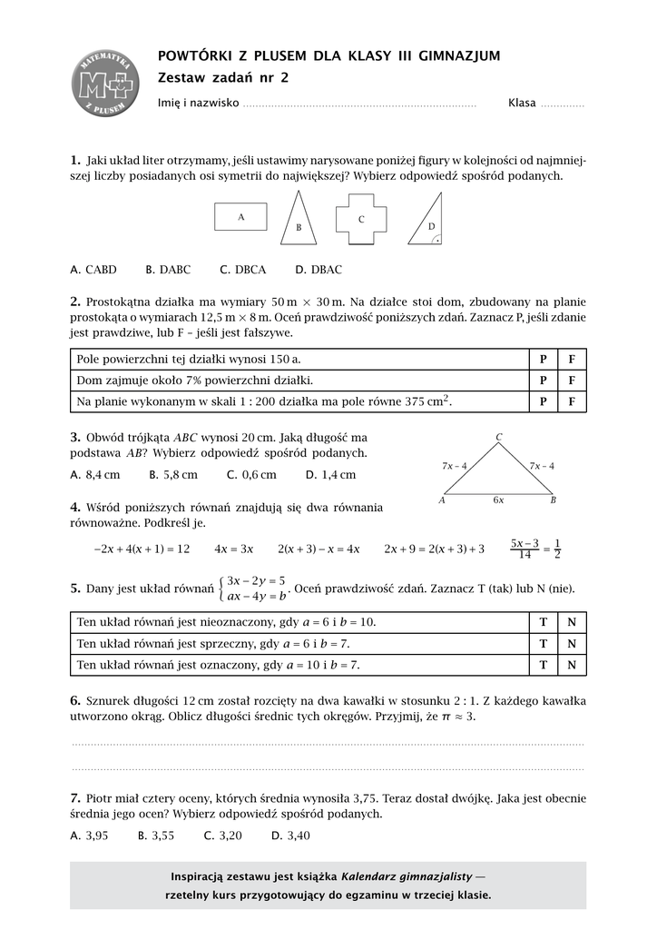 POWTÓRKI Z PLUSEM DLA KLASY III GIMNAZJUM Zestaw zadań nr 2 Imię i nazwisko .......................................................................... Klasa .............. 1. Jaki układ liter otrzymamy, jeśli ustawimy narysowane poniżej figury w kolejności od najmniejszej liczby posiadanych osi symetrii do największej? Wybierz odpowiedź spośród podanych. A. CABD B. DABC C. DBCA D. DBAC 2. Prostokątna działka ma wymiary 50 m × 30 m. Na działce stoi dom, zbudowany na planie prostokąta o wymiarach 12,5 m × 8 m. Oceń prawdziwość poniższych zdań. Zaznacz P, jeśli zdanie jest prawdziwe, lub F – jeśli jest fałszywe. Pole powierzchni tej działki wynosi 150 a. Dom zajmuje około 7% powierzchni działki. Na planie wykonanym w skali 1 : 200 działka ma pole równe 375 cm2 . P F P F P F 3. Obwód trójkąta ABC wynosi 20 cm. Jaką długość ma podstawa AB? Wybierz odpowiedź spośród podanych. A. 8,4 cm B. 5,8 cm C. 0,6 cm D. 1,4 cm 4. Wśród poniższych równań znajdują się dwa równania równoważne. Podkreśl je. −2x + 4(x + 1) = 12 4x = 3x 5. Dany jest układ równań 2(x + 3) − x = 4x 2x + 9 = 2(x + 3) + 3 5x − 3 1 =2 14 3x − 2y = 5 . Oceń prawdziwość zdań. Zaznacz T (tak) lub N (nie). ax − 4y = b Ten układ równań jest nieoznaczony, gdy a = 6 i b = 10. T N Ten układ równań jest sprzeczny, gdy a = 6 i b = 7. T N Ten układ równań jest oznaczony, gdy a = 10 i b = 7. T N 6. Sznurek długości 12 cm został rozcięty na dwa kawałki w stosunku 2 : 1. Z każdego kawałka utworzono okrąg. Oblicz długości średnic tych okręgów. Przyjmij, że π ≈ 3. .................................................................................................................................................................. .................................................................................................................................................................. 7. Piotr miał cztery oceny, których średnia wynosiła 3,75. Teraz dostał dwójkę. Jaka jest obecnie średnia jego ocen? Wybierz odpowiedź spośród podanych. A. 3,95 B. 3,55 C. 3,20 D. 3,40 Inspiracją zestawu jest książka Kalendarz gimnazjalisty — rzetelny kurs przygotowujący do egzaminu w trzeciej klasie. 8. Na podstawie poniższego rysunku uzupełnij zdania, wpisując odpowiednie wyrażenia. Najdłuższy bok narysowanego sześciokąta ma długość Obwód tej figury wynosi ................. ................... ........... . , a jej pole jest równe . ....................................................................................................... ....................................................................................................... 9. Dwa lata temu Wojtek był siedem razy starszy od Oli. Obecnie jest od niej cztery razy starszy. Ile lat ma Ola, a ile – Wojtek? .................................................................................................................................................................. .................................................................................................................................................................. .................................................................................................................................................................. 10. Wykonaj mnożenie i zredukuj wyrazy podobne. (a − 1)(a2 + a + 1) = ................................................................................................................................ (a − 1)(a3 + a2 + a + 1) = ......................................................................................................................... (a − 1)(a4 + a3 + a2 + a + 1) = ................................................................................................................. Ustal, jaką najprostszą postać ma wyrażenie: (a − 1)(a100 + a99 + a98 + . . . + a2 + a + 1) = .......................................................................................... 11. Udowodnij, że kąt α (zob. rysunek obok) ma 60◦. ........................................................................................ ........................................................................................ ........................................................................................ ........................................................................................ ........................................................................................ ........................................................................................ Inspiracją zestawu jest książka Kalendarz gimnazjalisty — rzetelny kurs przygotowujący do egzaminu w trzeciej klasie.