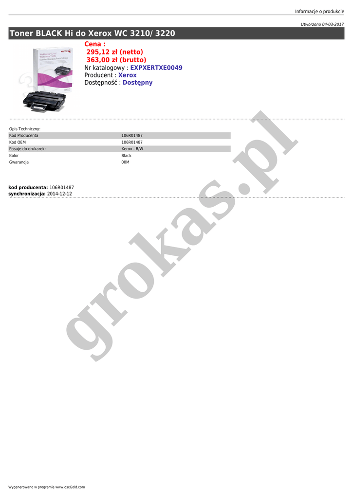 Informacje o produkcie Utworzono 04-03-2017 Toner BLACK Hi do Xerox WC 3210/ 3220 Cena : 295,12 zł (netto) 363,00 zł (brutto) Nr katalogowy : EXPXERTXE0049 Producent : Xerox Dostępność : Dostępny Kod Producenta 106R01487 Kod OEM 106R01487 Pasuje do drukarek: Xerox - B/W Kolor Black Gwarancja 00M gr ok as kod producenta: 106R01487 synchronizacja: 2014-12-12 .p l Opis Techniczny: Wygenerowano w programie www.oscGold.com