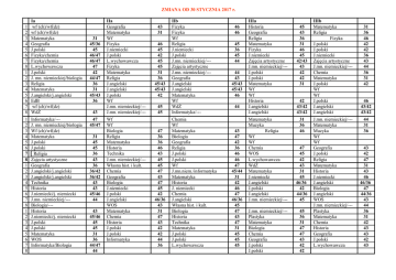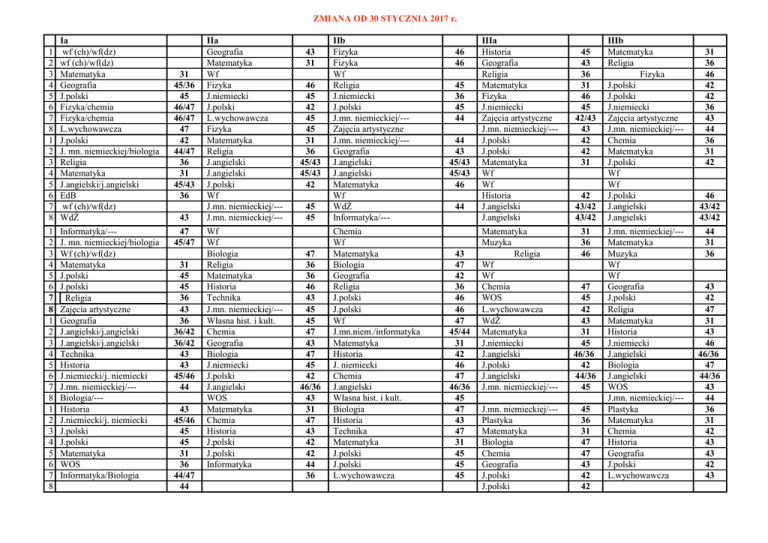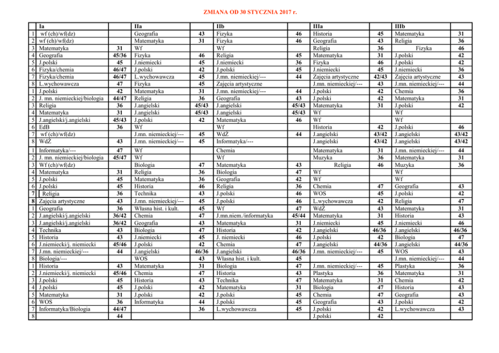 ZMIANA OD 30 STYCZNIA 2017 r. 1 2 3 4 5 6 7 8 1 2 3 4 5 6 7 8 1 2 3 4 5 6 7 8 1 2 3 4 5 6 7 8 1 2 3 4 5 6 7 8 Ia wf (ch)/wf(dz) wf (ch)/wf(dz) Matematyka Geografia J.polski Fizyka/chemia Fizyka/chemia L.wychowawcza J.polski J. mn. niemieckiej/biologia Religia Matematyka J.angielski/j.angielski EdB wf (ch)/wf(dz) WdŻ Informatyka/--J. mn. niemieckiej/biologia Wf (ch)/wf(dz) Matematyka J.polski J.polski Religia Zajęcia artystyczne Geografia J.angielski/j.angielski J.angielski/j.angielski Technika Historia J.niemiecki/j. niemiecki J.mn. niemieckiej/--Biologia/--Historia J.niemiecki/j. niemiecki J.polski J.polski Matematyka WOS Informatyka/Biologia 31 45/36 45 46/47 46/47 47 42 44/47 36 31 45/43 36 43 47 45/47 31 45 45 36 43 36 36/42 36/42 43 43 45/46 44 43 45/46 45 45 31 36 44/47 44 IIa Geografia Matematyka Wf Fizyka J.niemiecki J.polski L.wychowawcza Fizyka Matematyka Religia J.angielski J.angielski J.polski Wf J.mn. niemieckiej/--J.mn. niemieckiej/--Wf Wf Biologia Religia Matematyka Historia Technika J.mn. niemieckiej/--Własna hist. i kult. Chemia Geografia Biologia J.niemiecki J.polski J.angielski WOS Matematyka Chemia Historia J.polski J.polski Informatyka 43 31 46 45 42 45 45 31 36 45/43 45/43 42 45 45 47 36 36 46 43 45 45 47 43 47 45 42 46/36 43 31 47 43 42 42 44 36 IIb Fizyka Fizyka Wf Religia J.niemiecki J.polski J.mn. niemieckiej/--Zajęcia artystyczne J.mn. niemieckiej/--Geografia J.angielski J.angielski Matematyka Wf WdŻ Informatyka/--Chemia Wf Matematyka Biologia Geografia Religia J.polski J.polski Wf J.mn.niem./informatyka Matematyka Historia J. niemiecki Chemia J.angielski Własna hist. i kult. Biologia Historia Technika Matematyka J.polski J.polski L.wychowawcza 46 46 45 36 45 44 44 43 45/43 45/43 46 44 43 47 42 36 46 46 47 45/44 31 42 46 47 46/36 45 47 43 47 31 45 45 45 IIIa Historia Geografia Religia Matematyka Fizyka J.niemiecki Zajęcia artystyczne J.mn. niemieckiej/--J.polski J.polski Matematyka Wf Wf Historia J.angielski J.angielski 45 43 36 31 46 45 42/43 43 42 42 31 42 43/42 43/42 Matematyka Muzyka Religia Wf Wf Chemia WOS L.wychowawcza WdŻ Matematyka J.niemiecki J.angielski J.polski J.angielski J.mn. niemieckiej/--- 31 36 46 47 45 42 43 31 45 46/36 42 44/36 45 J.mn. niemieckiej/--Plastyka Matematyka Biologia Chemia Geografia J.polski J.polski 45 36 31 47 47 43 42 42 IIIb Matematyka Religia Fizyka J.polski J.polski J.niemiecki Zajęcia artystyczne J.mn. niemieckiej/--Chemia Matematyka J.polski Wf Wf J.polski J.angielski J.angielski J.mn. niemieckiej/--Matematyka Muzyka Wf Wf Geografia J.polski Religia Matematyka Historia J.niemiecki J.angielski Biologia J.angielski WOS J.mn. niemieckiej/--Plastyka Matematyka Chemia Historia Geografia J.polski L.wychowawcza 31 36 46 42 42 36 43 44 36 31 42 46 43/42 43/42 44 31 36 43 42 47 31 43 46 46/36 47 44/36 43 44 36 31 42 43 43 42 43