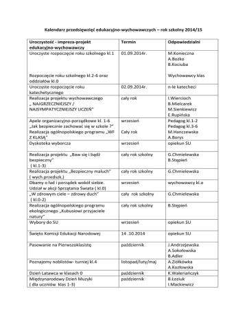 Kalendarz przedsięwzięć edukacyjno-wychowawczych – rok szkolny 2014/15 Uroczystość - impreza-projekt edukacyjno-wychowawczy Uroczyste rozpoczęcie roku szkolnego kl.1 Rozpoczęcie roku szkolnego kl.2-6 oraz oddziałów kl.0 Uroczyste rozpoczęcie roku katechetycznego Realizacja projektu wychowawczego „ NAJGRZECZNIEJSZY / NAJSYMPATYCZNIEJSZY UCZEŃ” Termin Odpowiedzialni 01.09.2014r. M.Konieczna A.Bożko B.Kociuba Wychowawcy klas 02.09.2014r. n-le katecheci cały rok I.Wiercioch B.Mielcarek M.Sienkiewicz E.Rupińska Pedagog kl.1-2 Pedagog kl.3-6 M.Hanczewska A.Borys opiekun SU Apele organizacyjno-porządkowe kl. 1-6 „Jak bezpiecznie zachować się w szkole ?” Realizacja ogólnopolskiego programu „WF Z KLASĄ” Dyskoteka wyborcza wrzesień Realizacja projektu „Baw się i bądź bezpieczny” ( kl.1-3) Realizacja projektu „Bezpieczny maluch” ( wych.przedszk.) Dbamy o ład i porządek wokół siebie. Udział w akcji Sprzątania Świata ( kl.0) „W zdrowym ciele – zdrowy duch” ( kl.0-2) Realizacja ogólnopolskiego programu ekologicznego „Kubusiowi przyjaciele natury” Wybory do SU cały rok szkolny G.Chmielewska B.Stępień cały rok szkolny G.Chmielewska wrzesień wychowawcy kl.o cały rok szkolny G.Chmielewska cały rok szkolny B.Stępień wrzesień opiekun SU Święto Komisji Edukacji Narodowej 14 .10.2014 opiekun SU Pasowanie na Pierwszoklasistę październik Poznajemy noblistów- turniej kl.4 listopad/luty/maj Dzień Latawca w klasach 0 Międzynarodowy Dzień Muzyki ( dla uczniów klas 1-3) październik październik J.Andrzejewska A.Sokołowska B.Adler A.Ziółkówka A.Kozłowska K.Waleriańczyk B.Łoziuk I.Mackiewicz Cały rok wrzesień Ruch i gwar – zabawy czar ( 1-3) październik Szkolne Dni Origami ( kl. 2-3) październik/listopad Apele wychowawcze ( kl.2-6) Gramy Fair – turniej piłki nożnej chłopców kl.4,5,6 pażdziernik październik Akademia z okazji Dnia Niepodległości kl.4-6 Listopad B.Bielecka J.Czyżewska A.Lesińska M.Gradzik K.Gwłowicz B.Łoziuk I.Mackiewicz Z.Karakulska pedagodzy M.Tylutki T.Bielecki W.Wlazło E.Polak A.Kozłowska Kl. 1-3 do uzgodnienia „Przedszkolak dba o zdrowie” – turniej klas listopad 0 Dyskoteka Andrzejkowa listopad B.Kociuba M.Turemka opiekun SU „Zabawy z wróżbą” ( kl. 0) listopad Jasełka dla klas 1-3 grudzień E.Kaśkiewicz M.Kapustka M.Konieczna Mikołaj w wodzie – impreza integracyjna dla klas pływackich Mikołaj w szkole grudzień trenerzy pływania grudzień opiekun SU Apele wychowawcze ( kl.2-6) Ruch i gwar – zabawy czar ( 1-3) grudzień grudzień Spotkanie z kolędą grudzień pedagodzy B.Bielecka J.Czyżewska A.Lesińska M.Gradzik K.Gwłowicz M.Bielecka „Choinka dla ptaków” ( kl.0) grudzień Impreza środowiskowa „ Dzień Babci i Dziadka” –kl.1 - kl.0 styczeń K.Waleriańczyk B.Stępień M.Konieczna wych. Klas 1 wych. Klas 0 „Nasi Najlepsi” – podsumowanie konkursów Zabawy taneczno-teatralne dla klas 0 styczeń dyrekcja styczeń B.Stępień M.Nowakowska Dzień Bezpiecznego Internetu luty A.Ziółkowska Warsztaty flażoletowe w ramach współpracy z SP Przecław i SP1 Szczecin luty B.Łoziuk „Stołówka dla ptaków” ( kl.0) luty Dzień Otwarty Szkoły do uzgodnienia K.Waleriańczyk M.Kapustka Wszyscy nauczyciele Apele wychowawcze ( kl.2-6) marzec pedagodzy „Mam Talent” – prezentacja talentów uczniów klas 1-6 Święto Kobiet w naszej szkole. marzec L.Czugała A.Ziółkowska opiekun SU „Dzień Smerfa” – zabawa integracyjna kl.0 marzec Apele porządkowe kl. 1-3 oraz 4-6 marzec „Złap wiosnę” – turniej klas 2 marzec /kwiecień „Przywróćmy Quinstorpów Szczecinowi” – kl. 3 Szkolny Dzień Ziemi ( kl. 1-3) marzec/kwiecień „Zabawy wielkanocne” ( kl.0) marzec/kwiecień „Zabawy z Wiosną” – zabawa integracyjna kl.0 Ruch i gwar – zabawy czar marzec/kwiecień marzec marzec /kwiecień M.Kapustka K.Waleriańczyk Pedagodzy B.Kociuba M.Turemka I.Mackiewicz „Bezpieczeństwo w ruchu drogowym” ( kl. 4-6) Zabawa Morska – turniej klas 1 kwiecień A.Bożko Z.Karakulska J.Piętosa M.Nowakowska B.Stępień K.Waleriańczyk B.Bielecka J.Czyżewska A.Lesińska M.Gradzik K.Gwłowicz I.Wiercioch B.Mielacerk J.Andrzejewska A.Kozłowska J.Szpejnowski kwiecień M.Włodarczak Dzień Zdrowej Żywności Kwiecień/maj Apele wychowawcze ( kl.2-6) maj A.Jalowska A.Pilecka G.Kruszewska pedagodzy kwiecień/maj Projekt edukacyjno-patriotyczny „Jesteśmy kwiecień/maj Polakami” Zabawa Europejska „Przyjaciele z krajów Unii Europejskiej” – turniej kl.3 maj A.Plichta-Domagała Mini Playback Show – impreza integracyjna czerwiec dla uczniów klas 1-3 Szkolny Dzień Sportu czerwiec U.Chomicz M.Patatyn nauczyciele wf Projekt czytelniczy „Lektury inaczej” ( kl.4-6) Festyn Rodzinny – impreza środowiskowa czerwiec A.Ziółkowska A.Kozłowska wychowawcy kl.0 Bal Klas 6 11.06.2015r. Balik klas 3 12.06.2015r. Apele „Nasi Najlepsi” czerwiec Podsumowanie roku sportowego czerwiec Kiermasz podręczników używanych 24.06.2015 Uroczyste zakończenie roku katechetycznego Uroczyste zakończenie nauki w szkole dla uczniów klas 6 25.06.2015 Czerwiec 26.06.2015 Uroczyste zakończenie nauki w szkole dla uczniów klas 3 Uroczyste zakończenie roku szkolnego klas 4-5 Zakończenie roku szkolnego kl.0 i 2-3 A.Lenczewska E.Dudzińska wychowawcy klas 6 M.Konieczna wychowawcy klas 3 Dyrekcja A.Borys M.Tylutki B.Bielecka I.Rowińska D.Piskuła n-le katecheci A.Hanczewska I.Wiercioch J.Andrzejewska J.Lubecka G.Gwarek wychowawcy klas